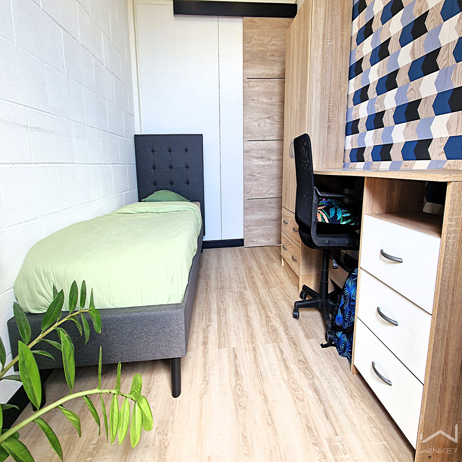 - 1 bureau transformé en chambre d'enfant avec un lit une place, une armoire et un petit bureau.