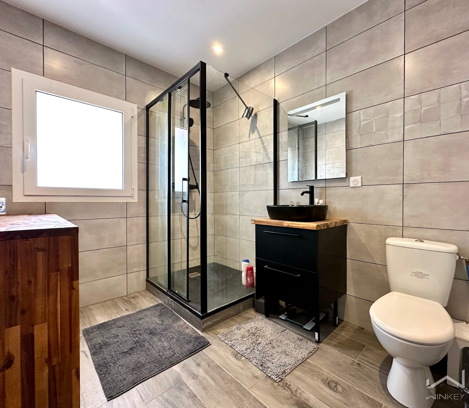 À l’étage : 2 grandes chambres, salle d’eau & WC Terrasse spacieuse donnant sur une superbe piscine au sel.