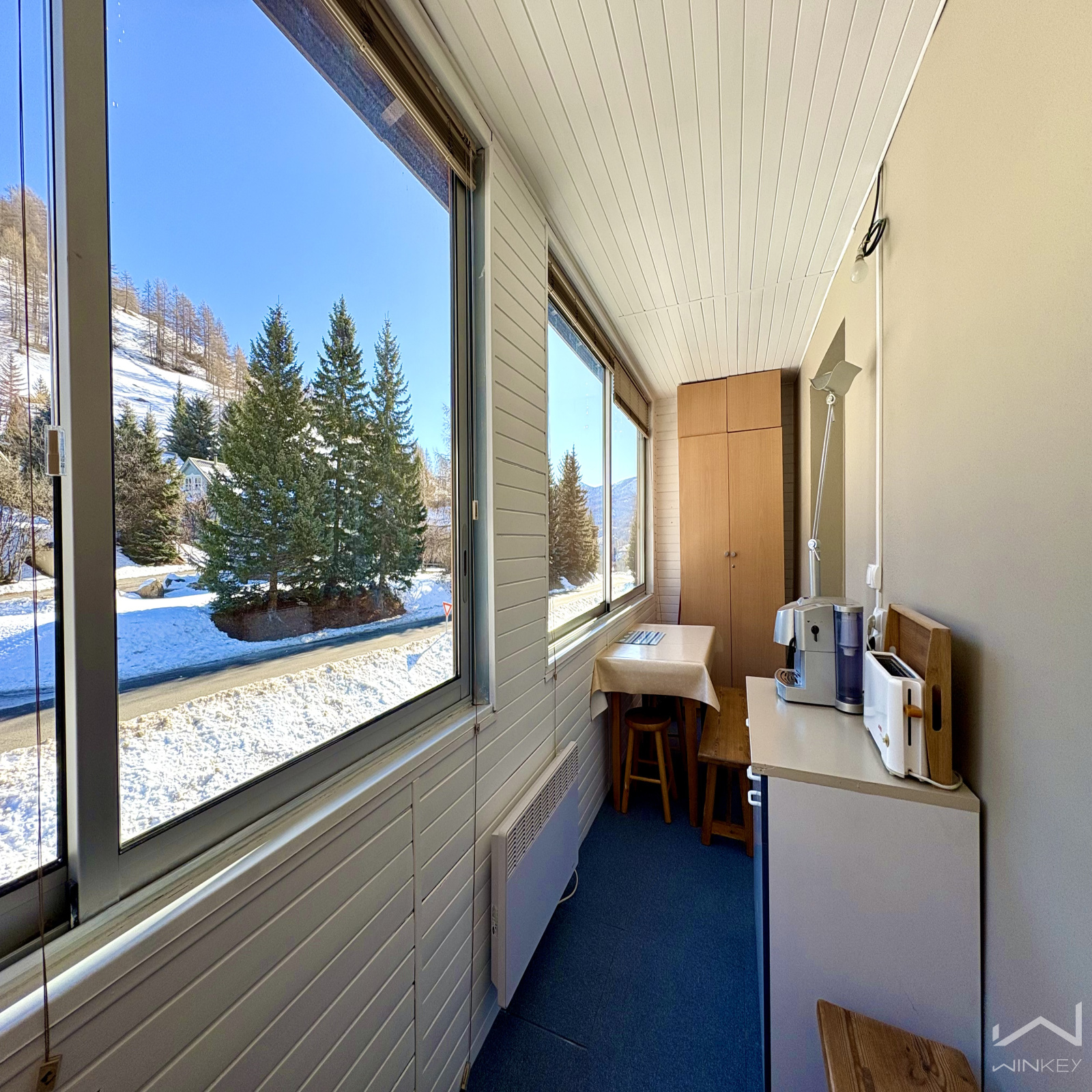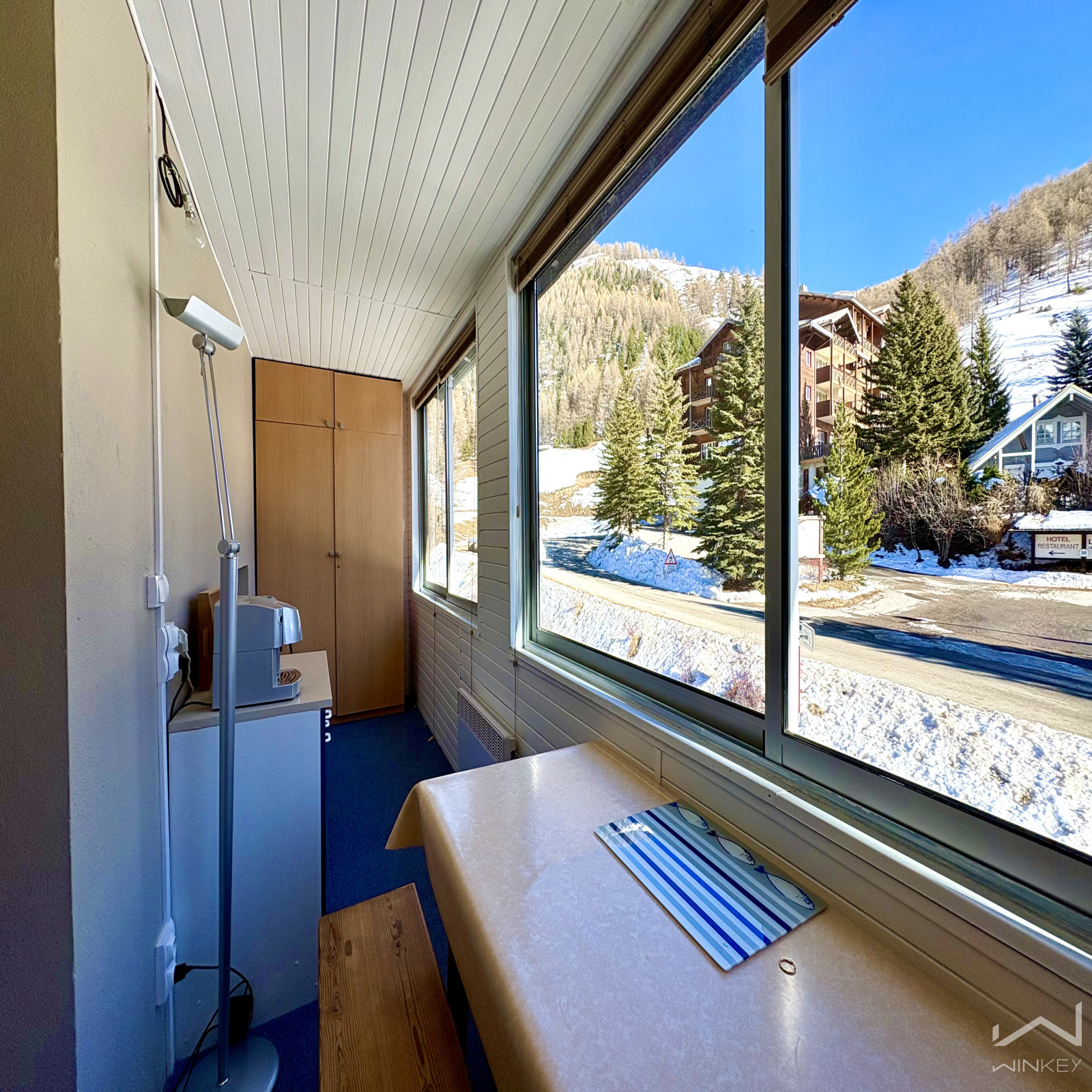 d’une loggia fermée faisant office de véritable pièce pour les repas, offrant une vue dégagée sur la montagne.