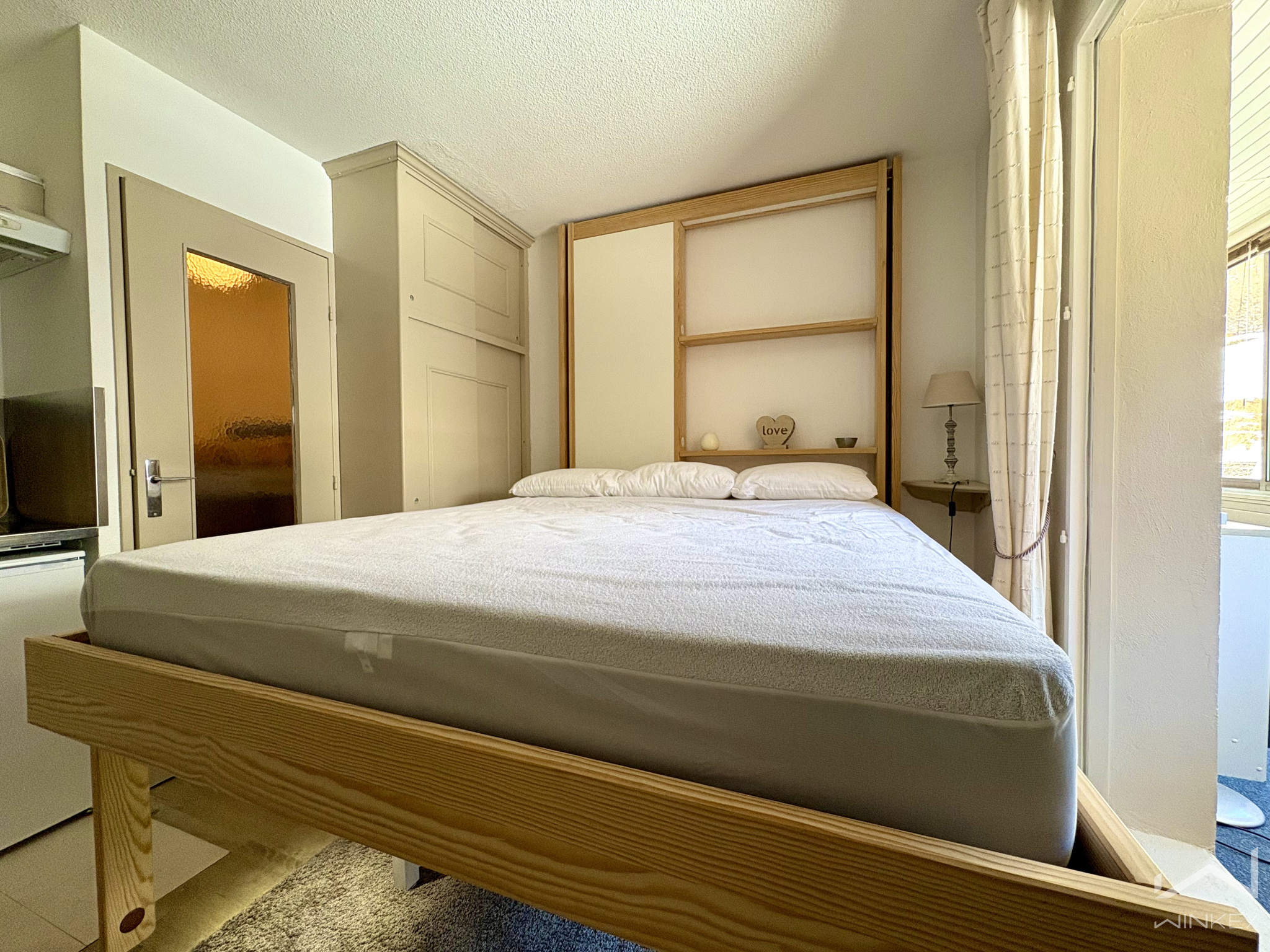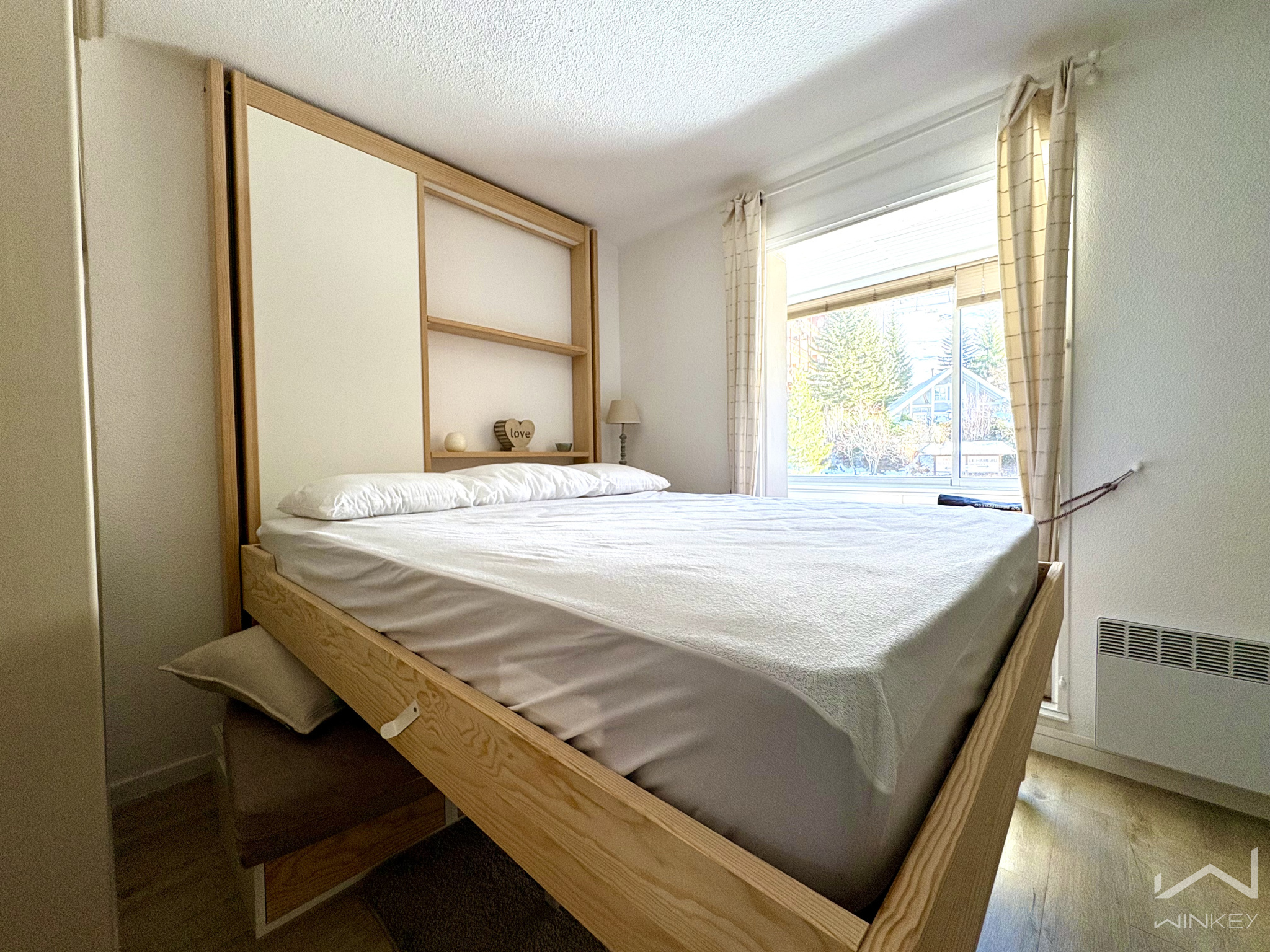 d’un lit escamotable en 160 cm, système ingénieux de remontée au plafond pour libérer la pièce de vie,
