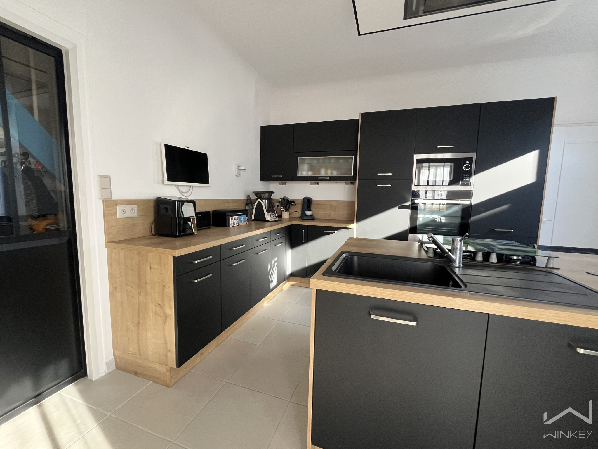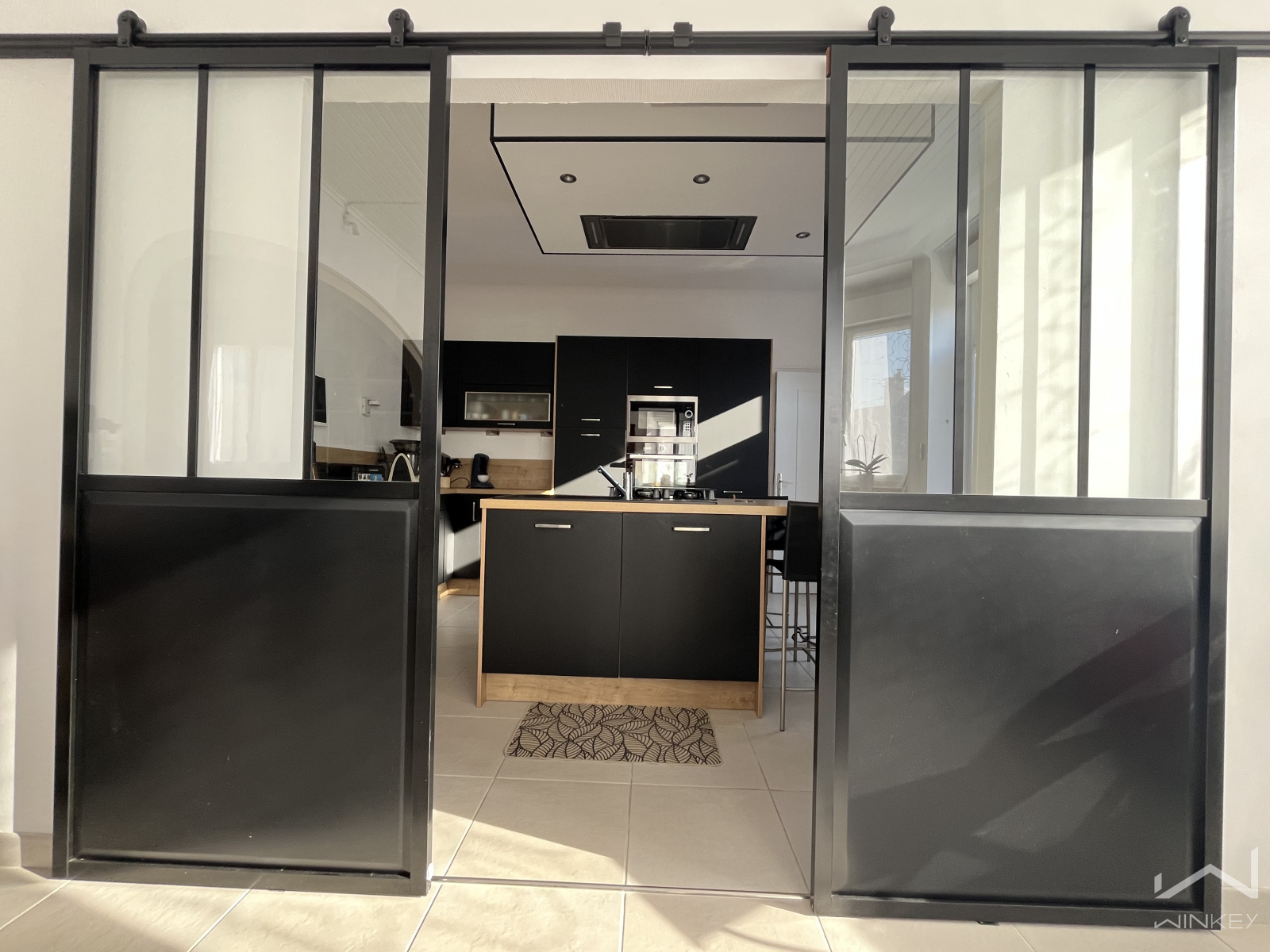 Elle se compose d'une belle cuisine aménagée et équipée ouverte sur un salon/séjour d'environ 40 m², offrant un espace de vie convivial et lumineux, séparé par une jolie verrière.