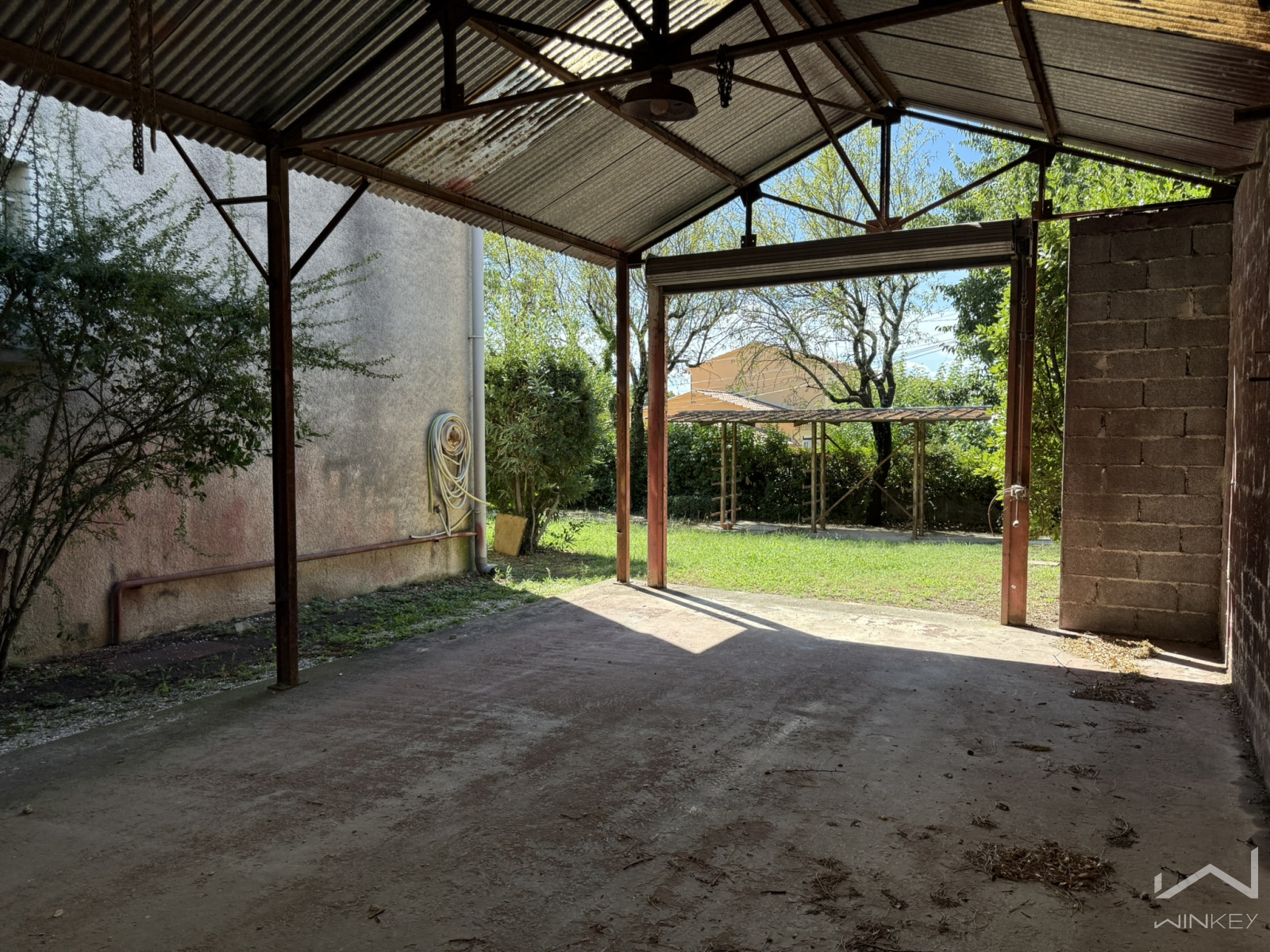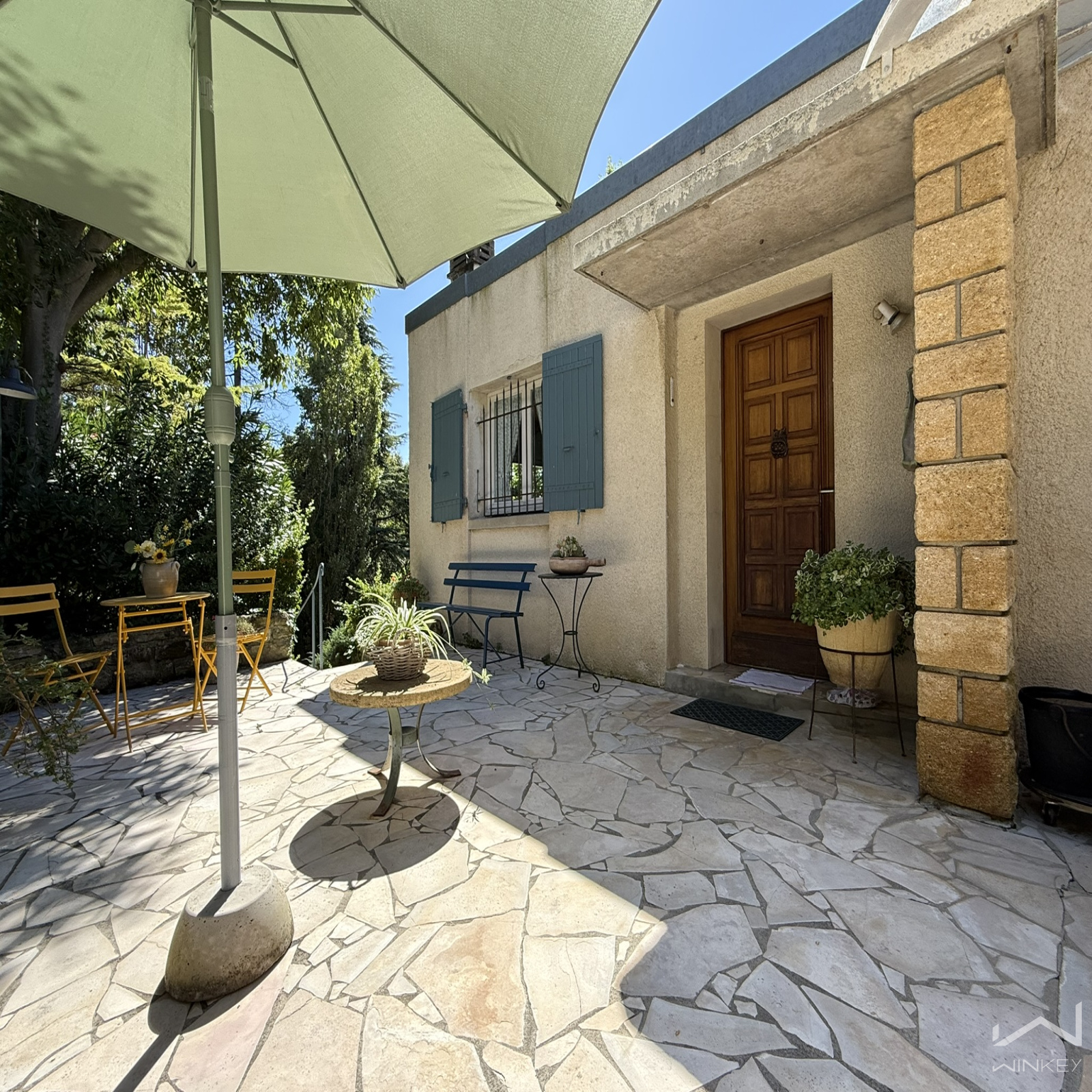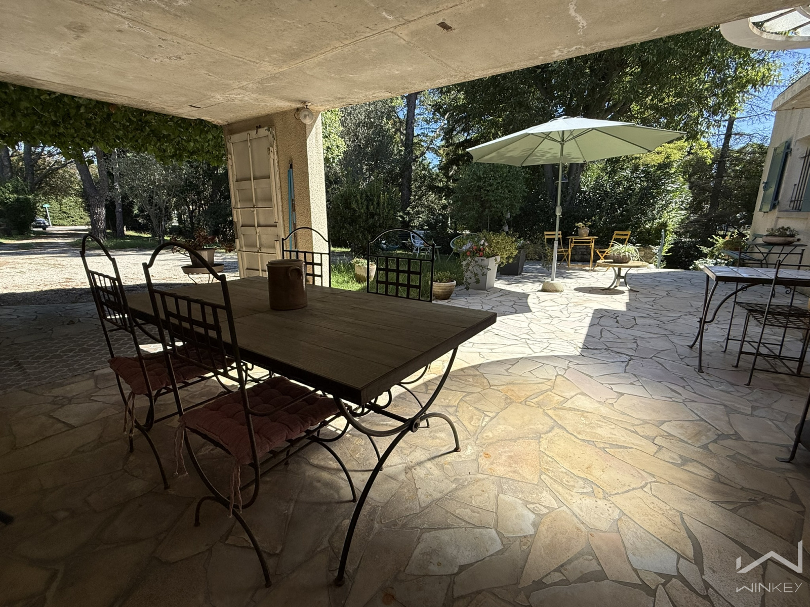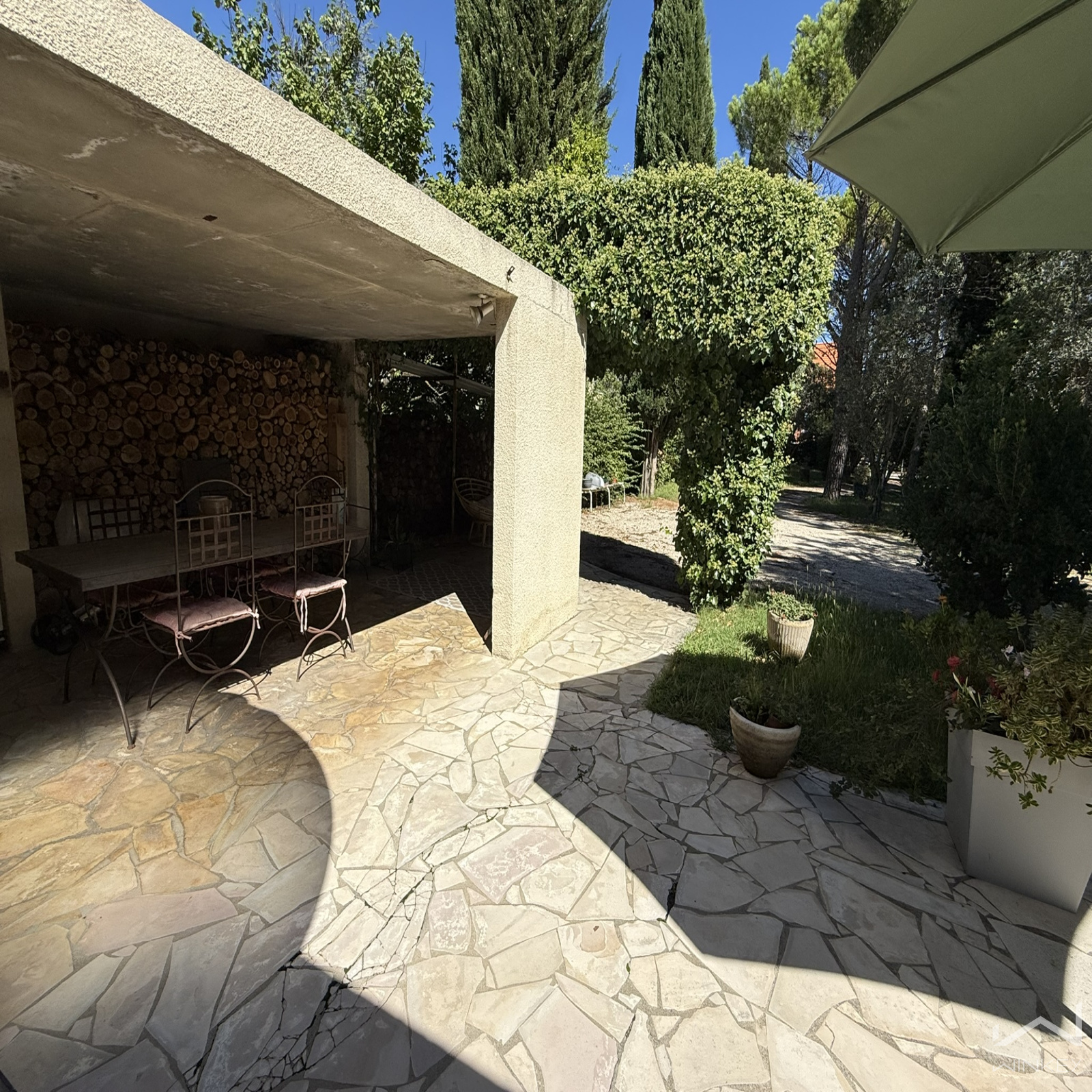Un chemin d’entrée dessert une grande terrasse couverte et ombragée, idéale pour profiter des extérieurs.