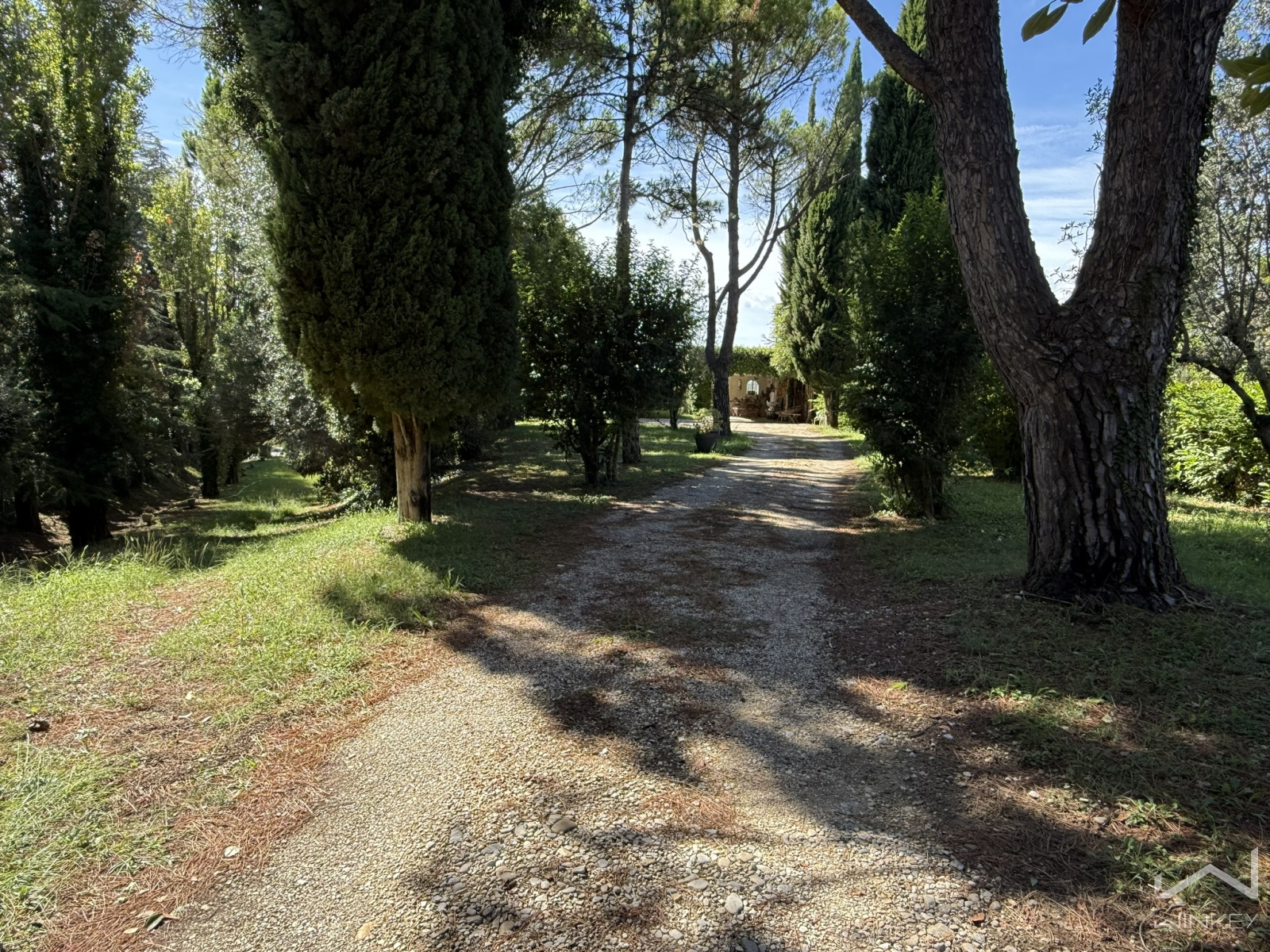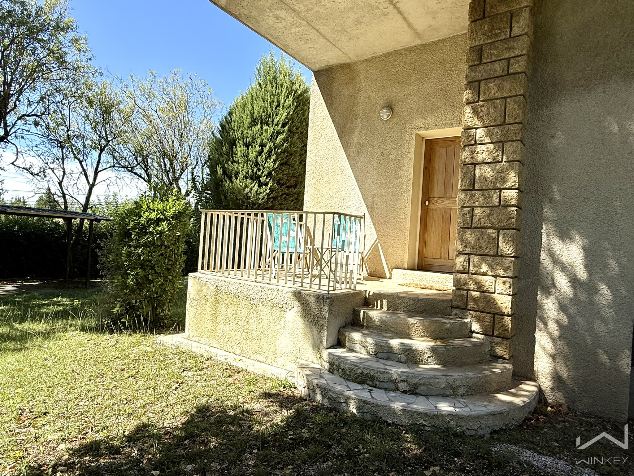Un chemin d’entrée dessert une grande terrasse couverte et ombragée, idéale pour profiter des extérieurs.