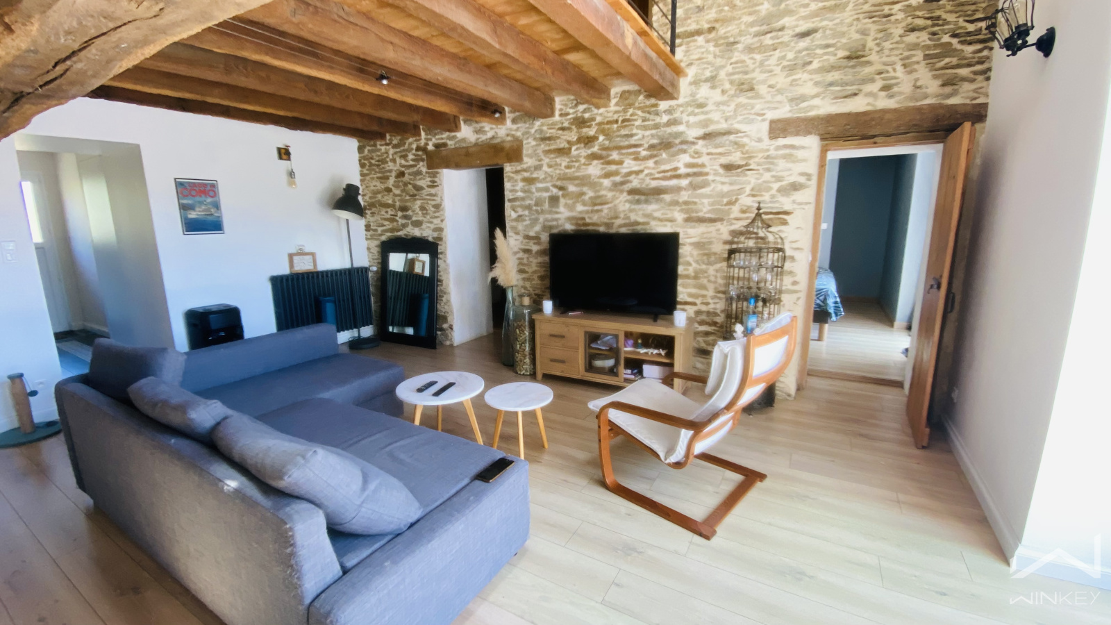 À l’étage : une grande mezzanine ouverte sur le séjour, une troisième chambre et une salle d’eau avec wc