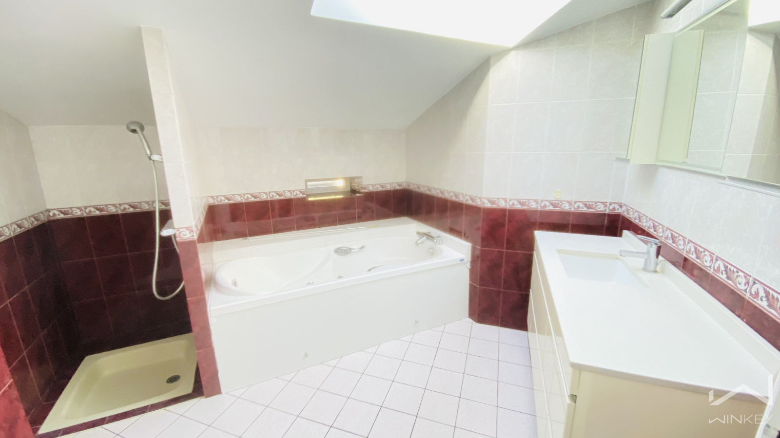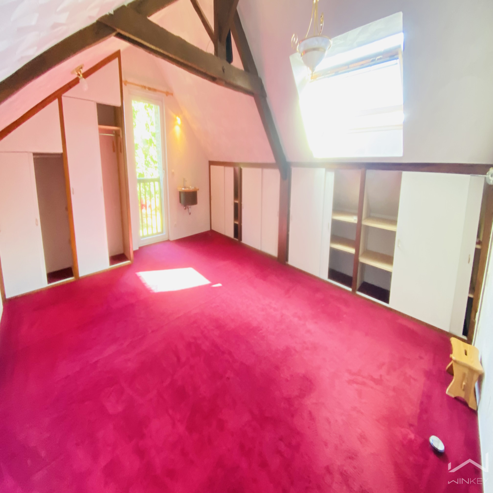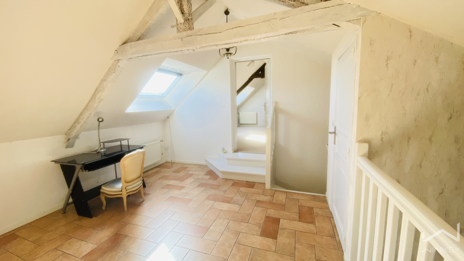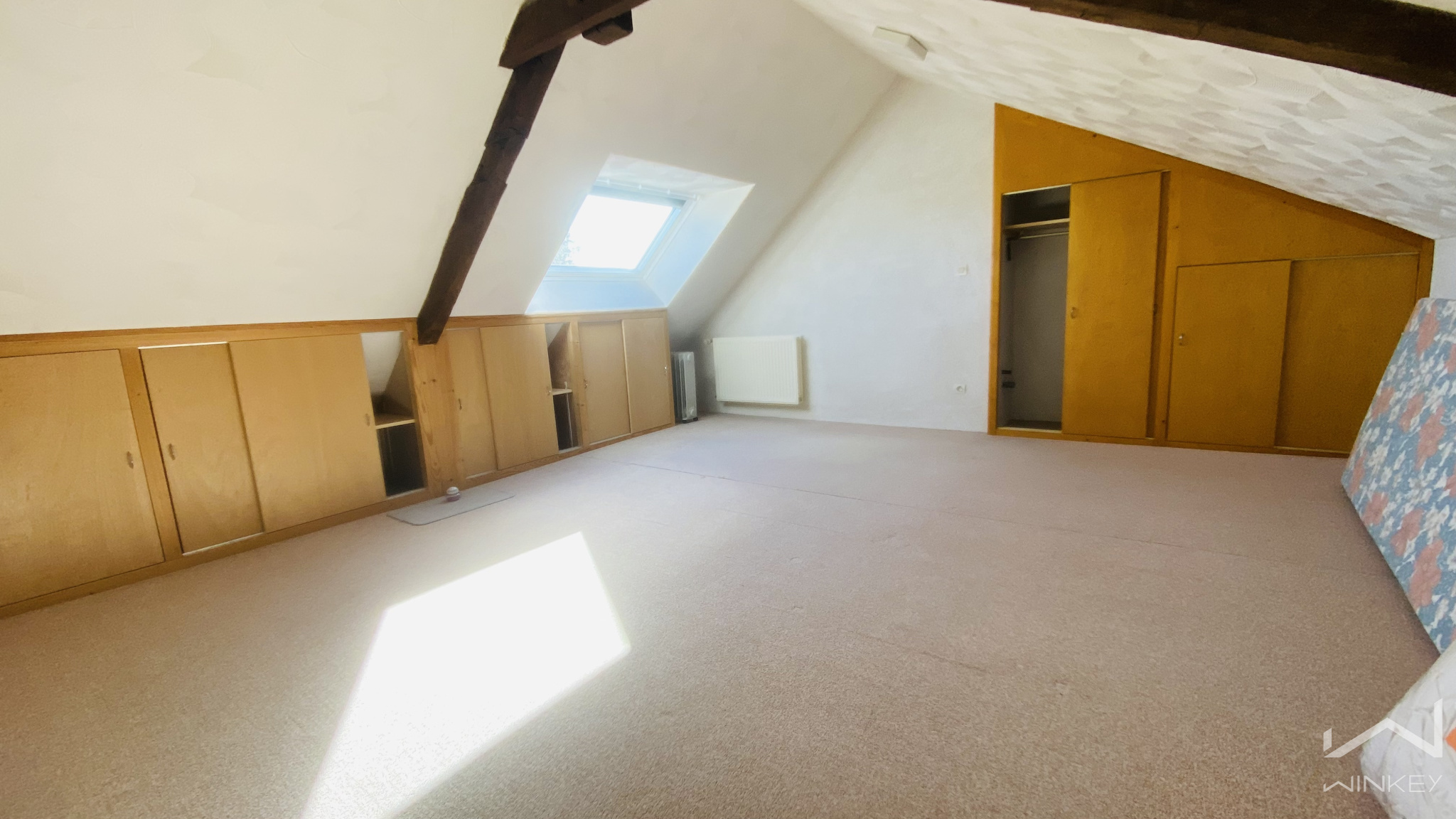 A l'étage: une belle mezzanine pouvant faire office de bureau ou salle de jeux, deux grandes chambres mansardées avec nombreux rangements et points d'eau, WC indépendant.