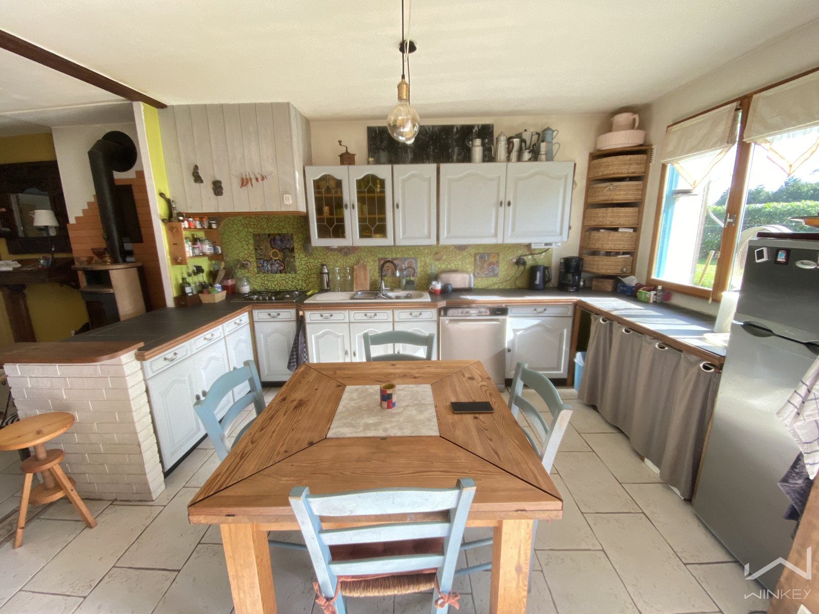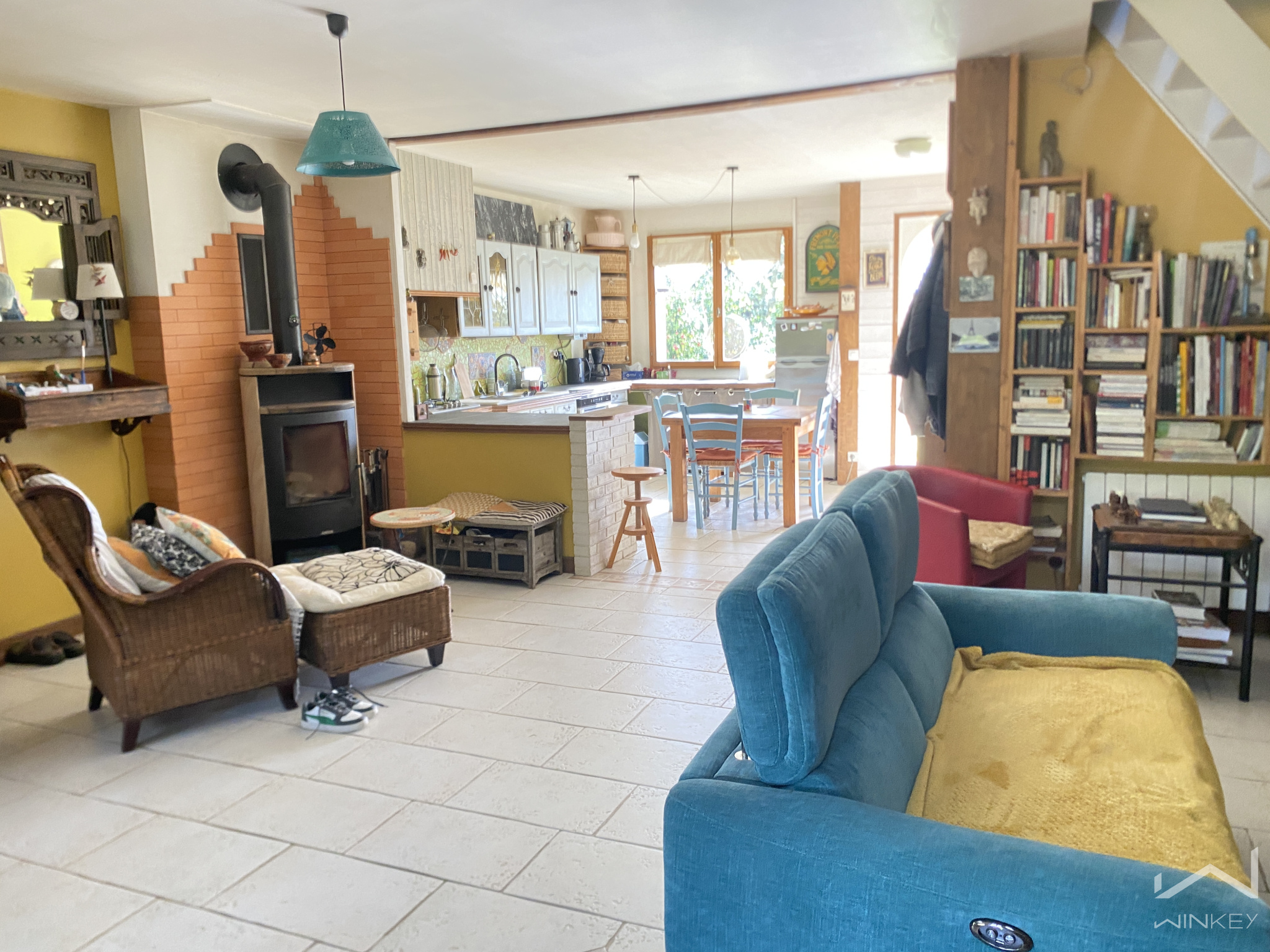 Le cœur de la maison s’articule autour d’un vaste espace de vie de 73 m², baigné de lumière, intégrant une cuisine ouverte. Le poêle à bois y apporte confort et convivialité.