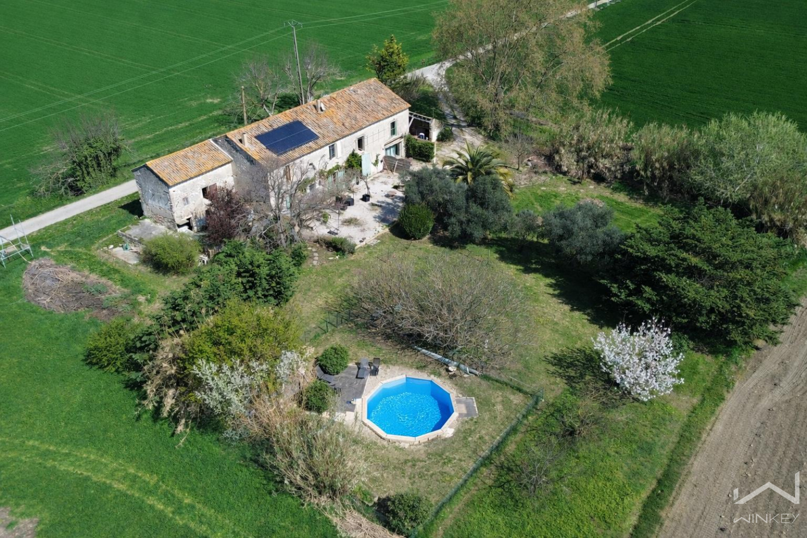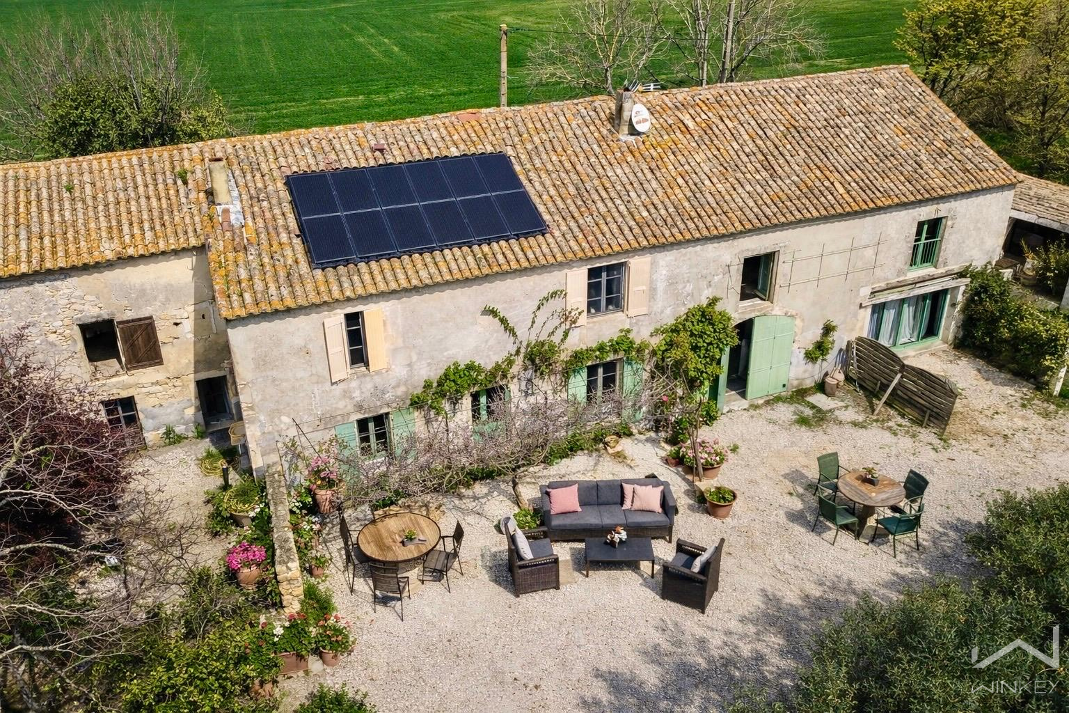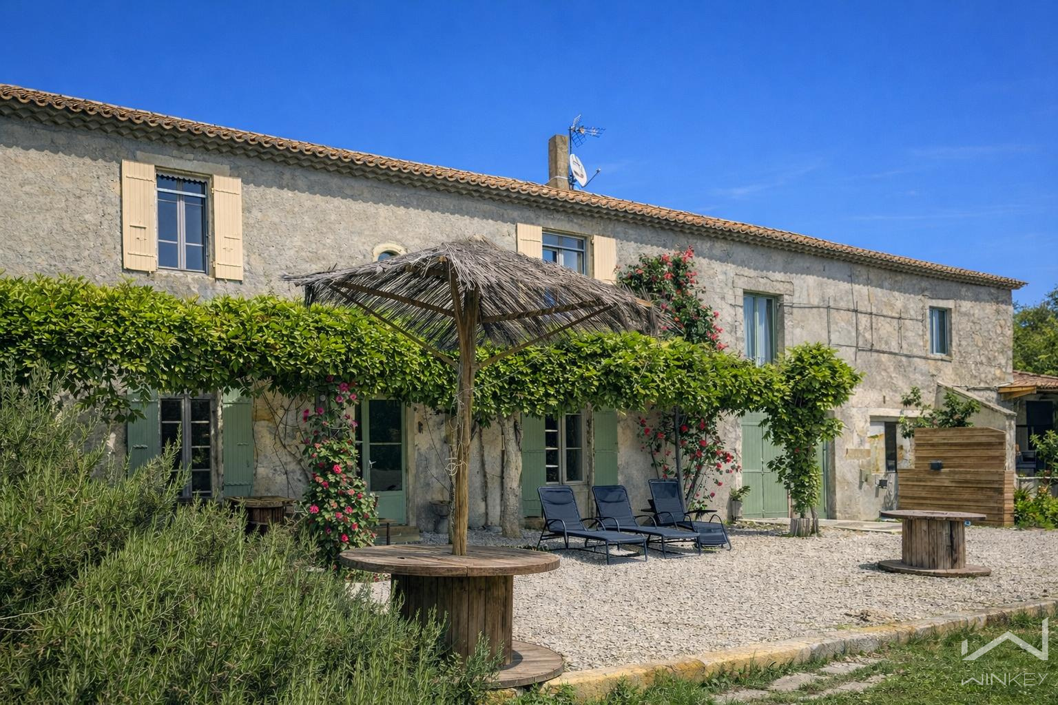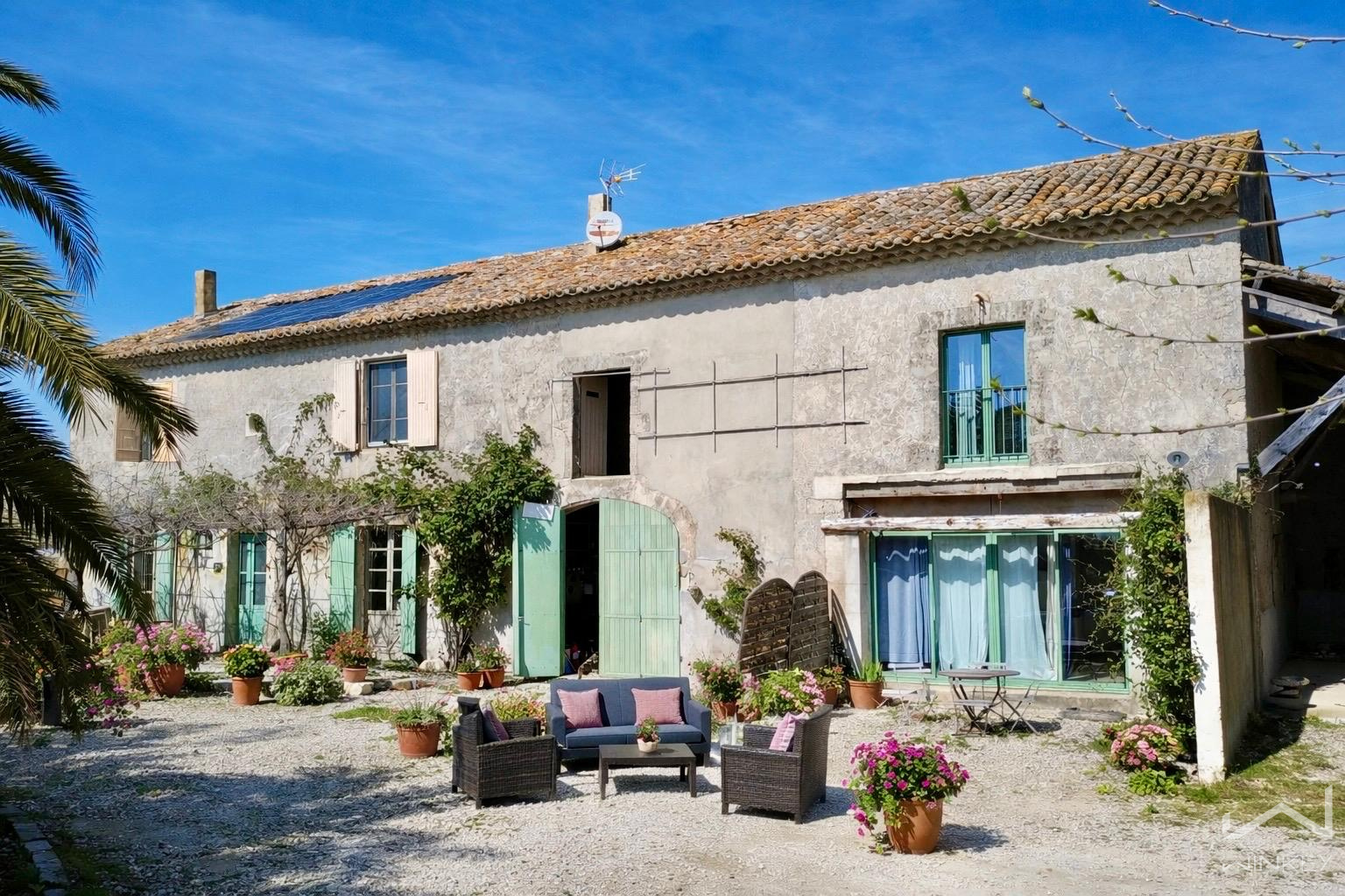 Dans un environnement privilégié, offrant une vue dégagée sur les champs à perte de vue, ce mas de caractère développe environ 220 m² habitables répartis en trois parties distinctes.