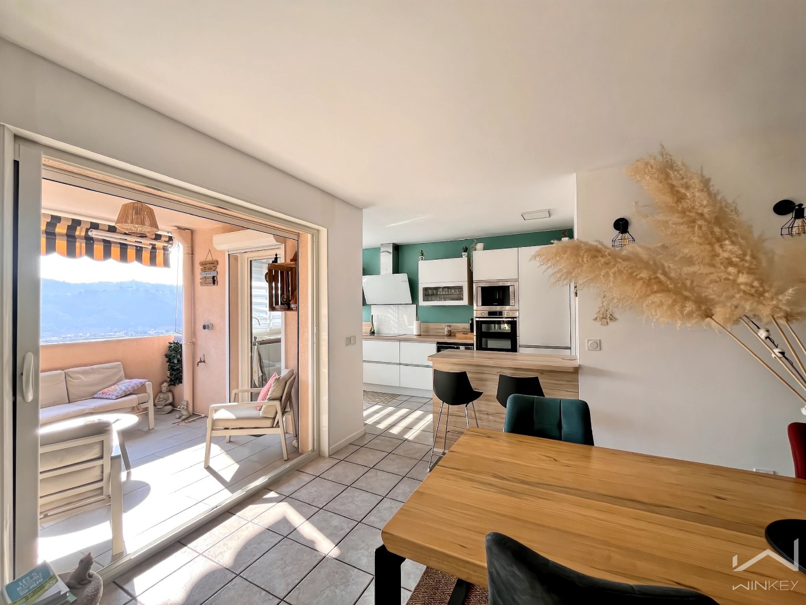 Dès l’entrée, laissez-vous séduire par une belle pièce de vie, baignée de lumière, avec une impression intérieur-extérieur unique grâce à une grande baie vitrée à galandage donnant accès à une spacieuse terrasse avec vue dégagée.