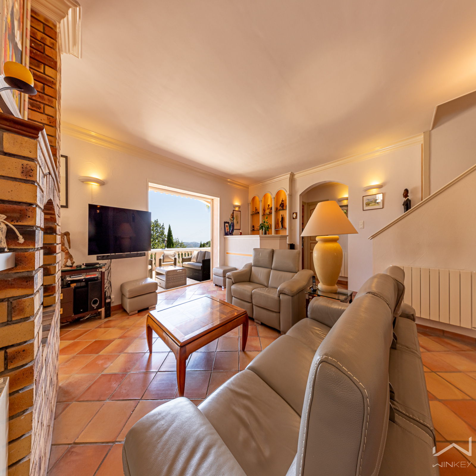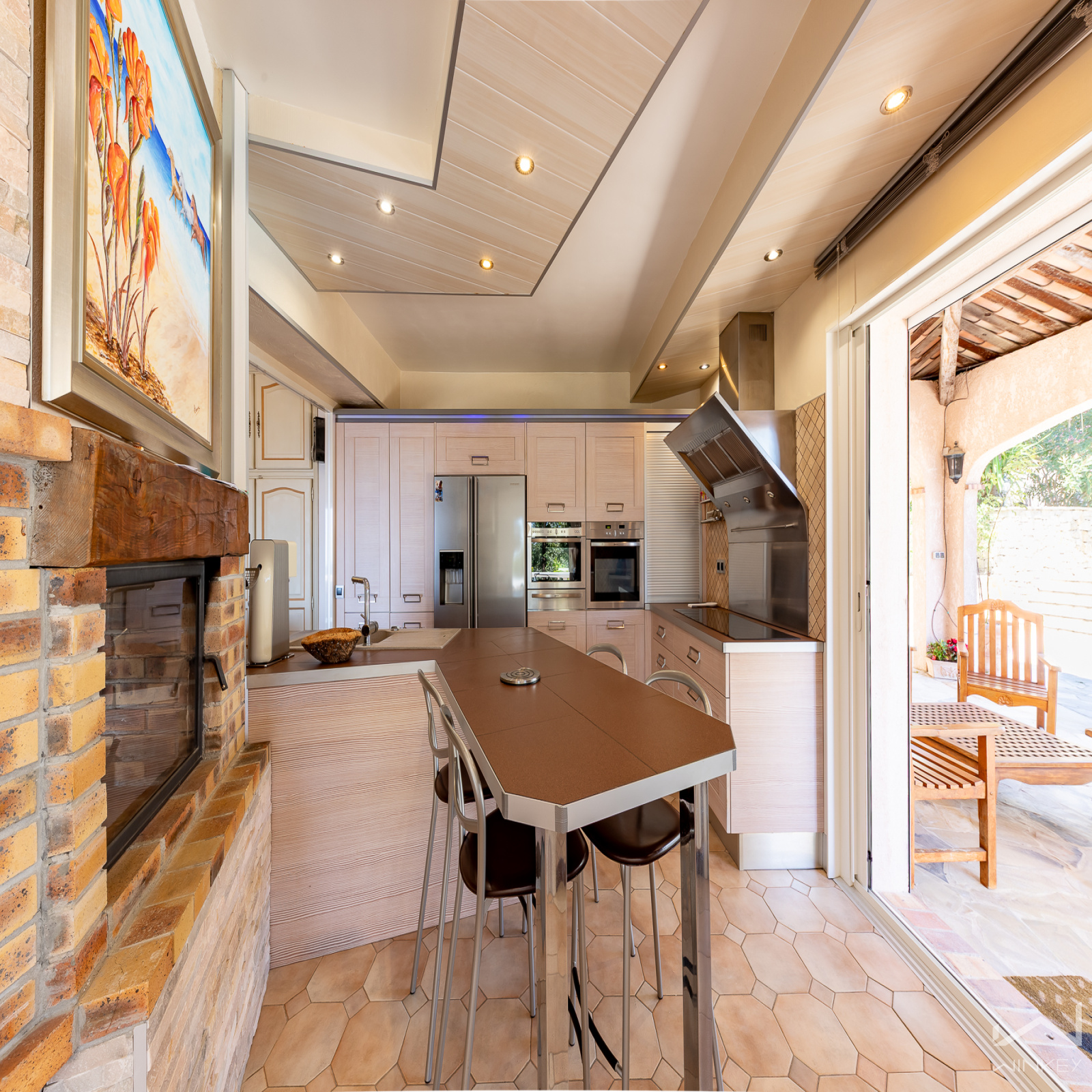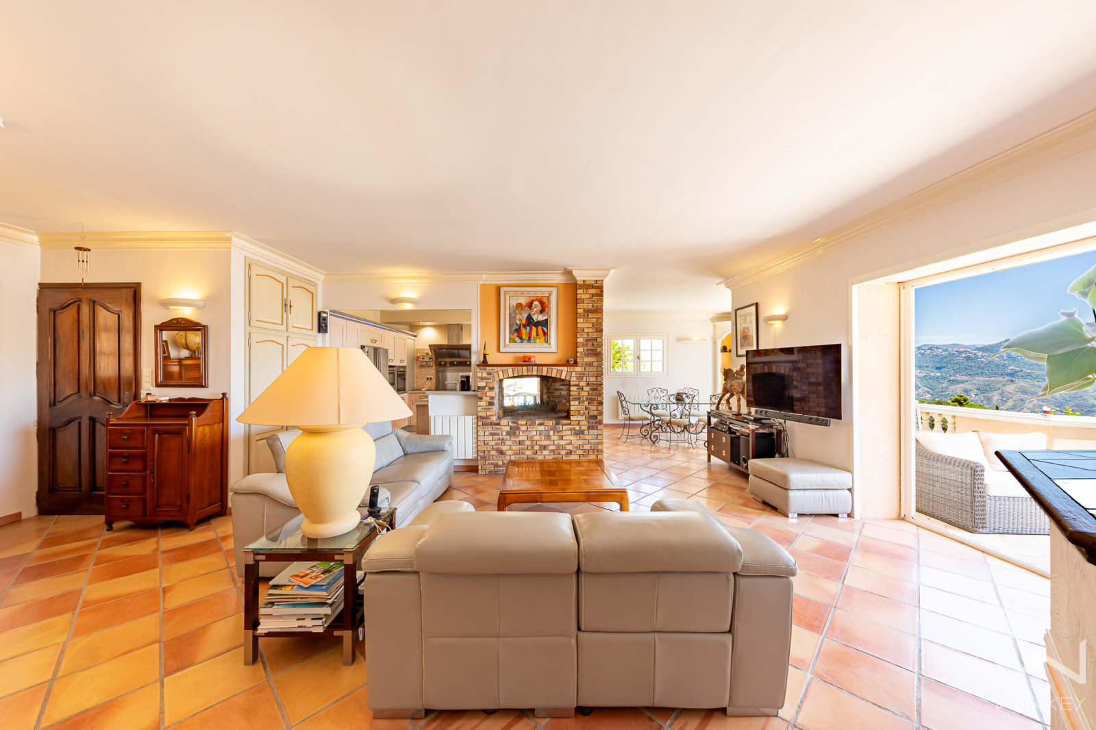 Dès l’entrée, le ton est donné : une pièce de vie spectaculaire d’environ 70 m², baignée de lumière, où s’articulent salon, salle à manger et cuisine ouverte, autour d’une cheminée centrale. Une atmosphère chaleureuse et conviviale, idéale pour recevoir.