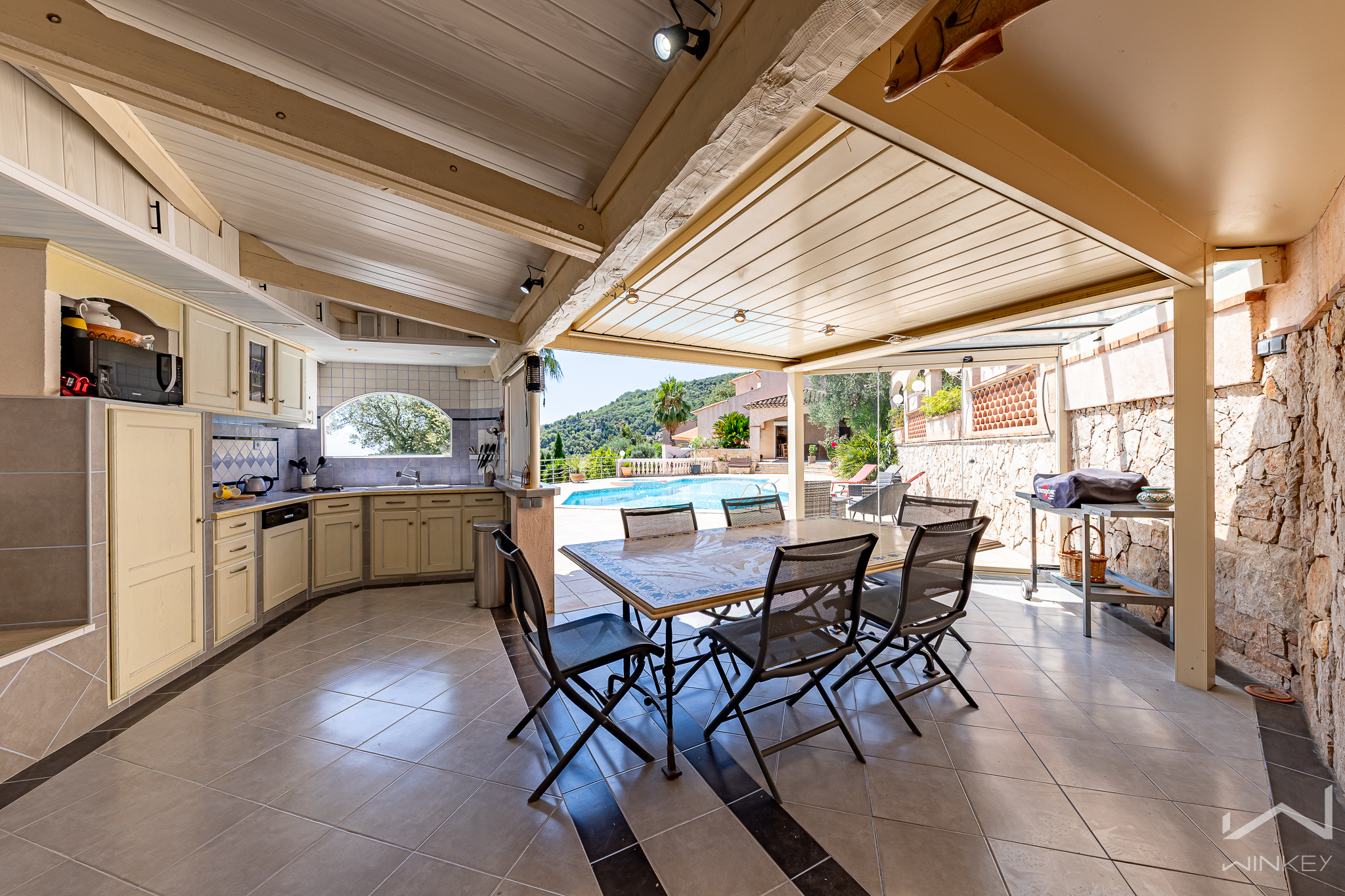 Deux terrasses en rez-de-jardin, une cuisine d'été équipée avec pool house,