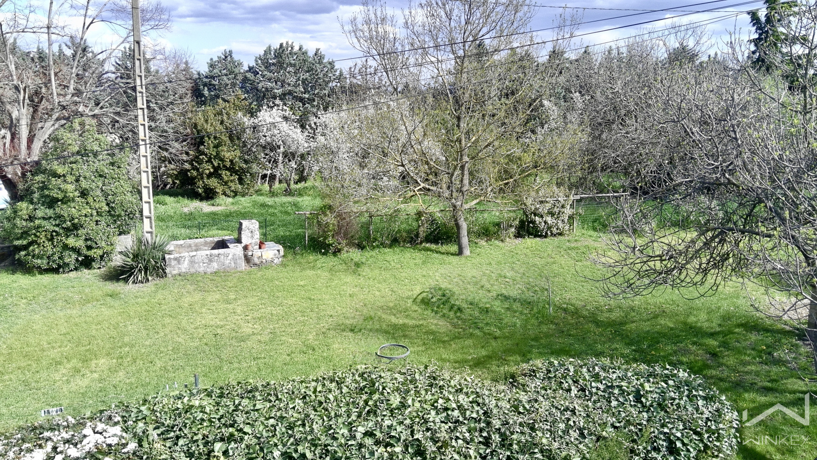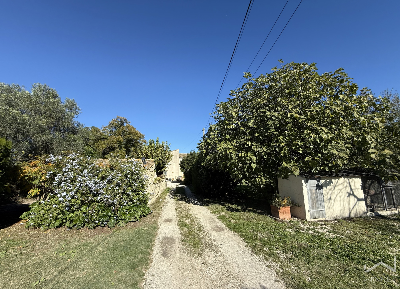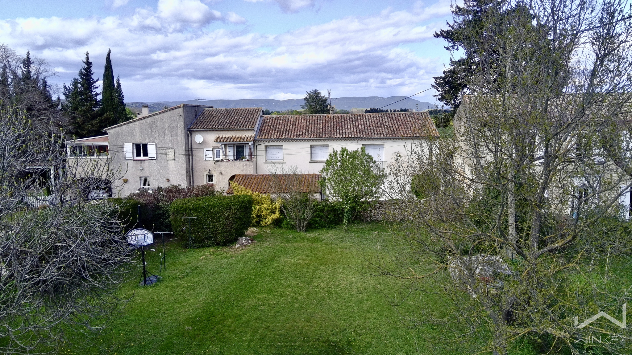 Implantée sur un terrain arboré de 5 433 m² exposé plein Sud, elle se compose d’un mas en pierre et d’une maison principale indépendante.