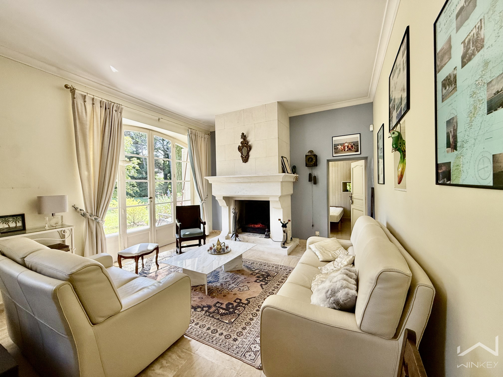 Grand séjour et salon de 37 m², cheminée ouverte, larges baies vitrées sur le parc
