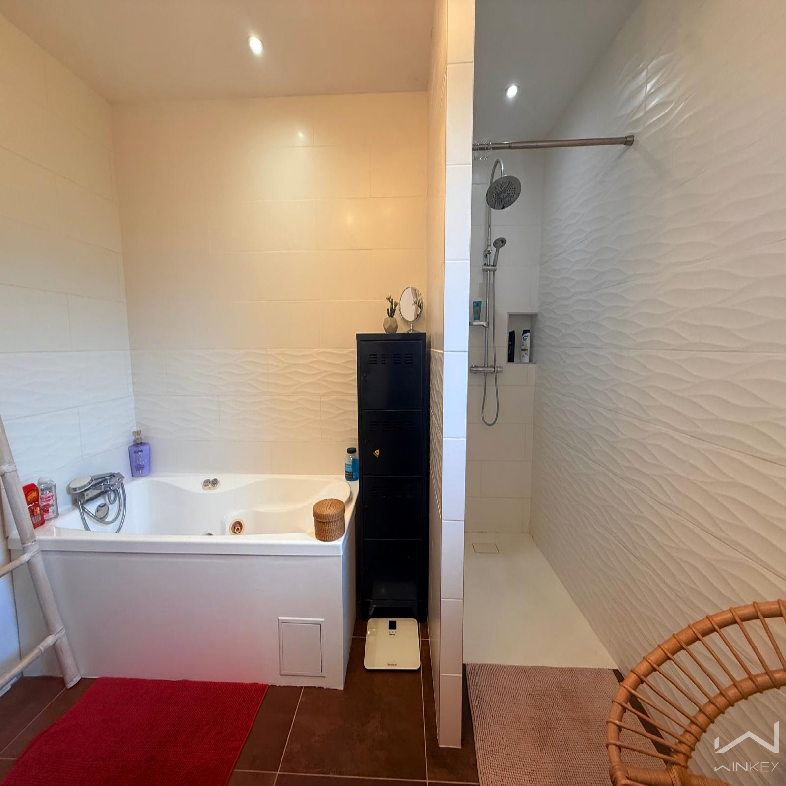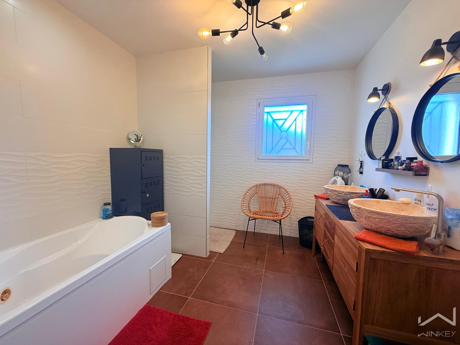 Vous profiterez également d’une spacieuse salle de bain équipée d’une baignoire à remous et d’une douche à l’italienne, ainsi que d’un WC indépendant.