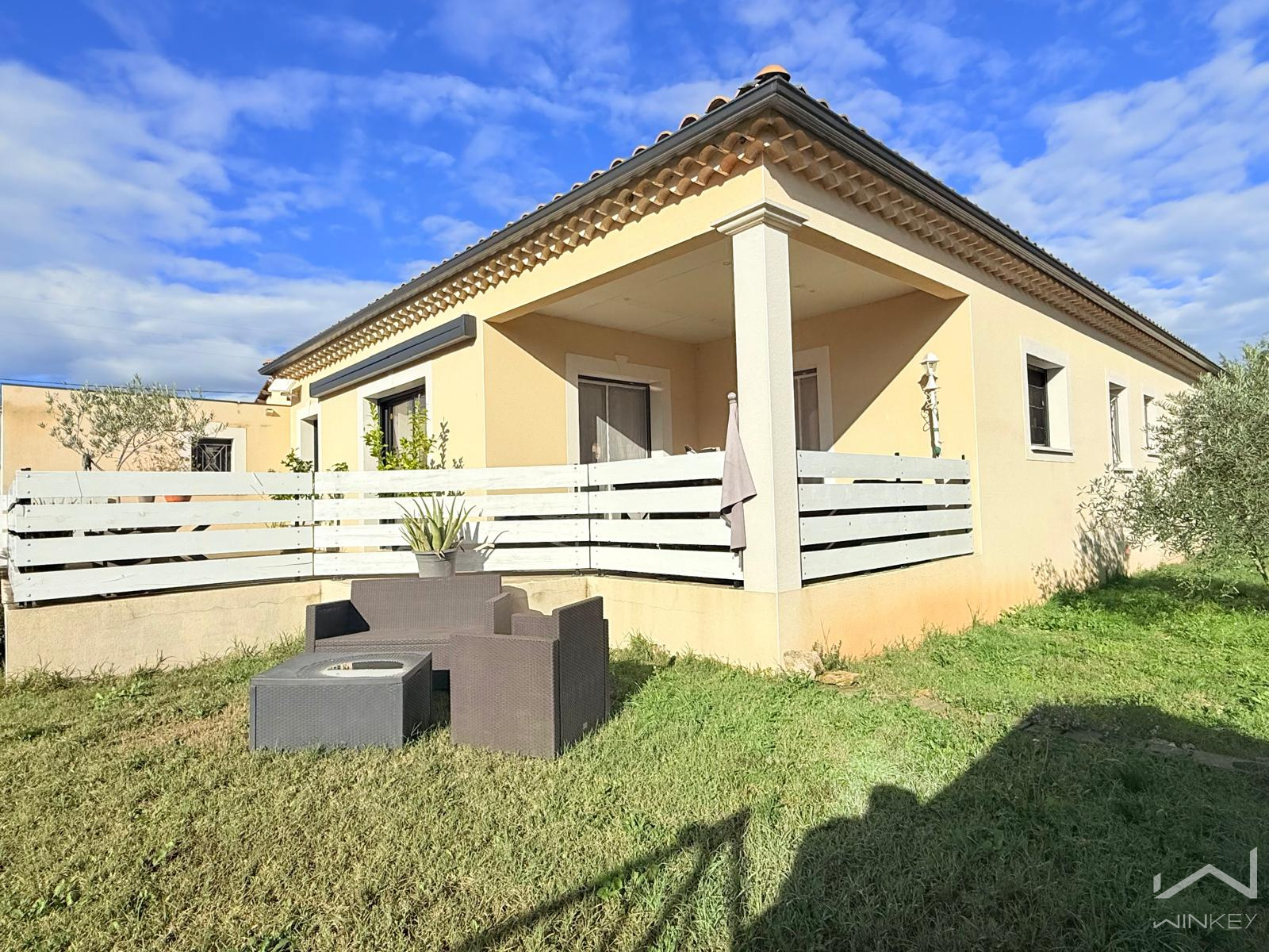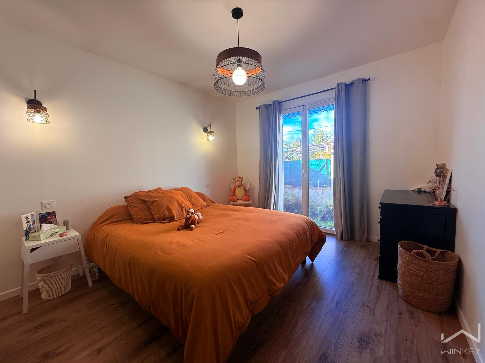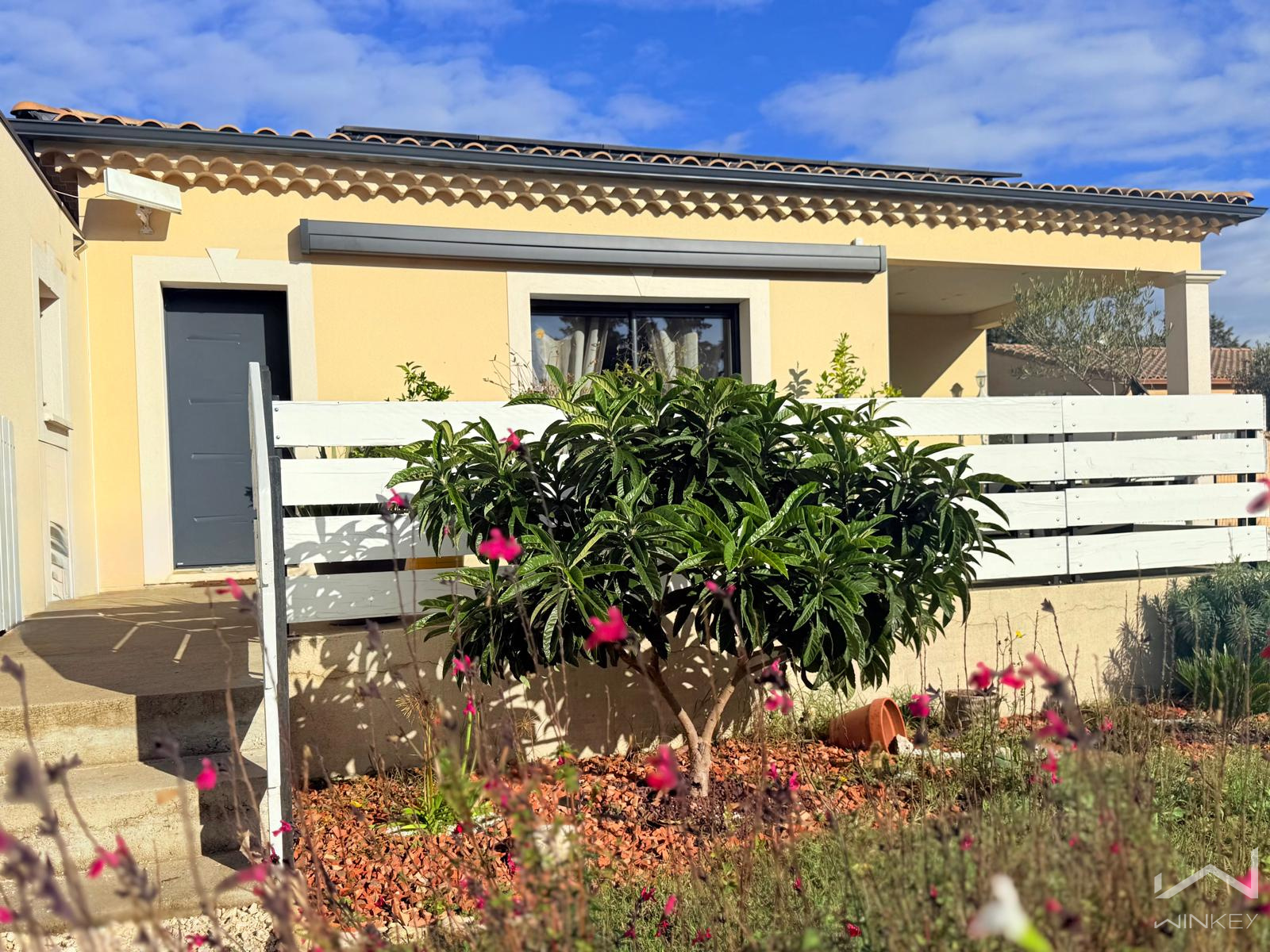Idéalement placée, à proximité immédiate des commerces, écoles et arrêts de bus, cette maison familiale de plain-pied, construite en 2018, est édifiée sur une parcelle plate, arborée et entièrement clôturée de 842 m².