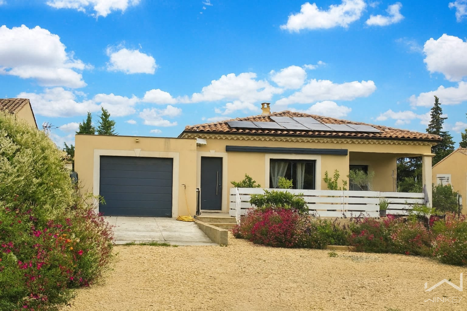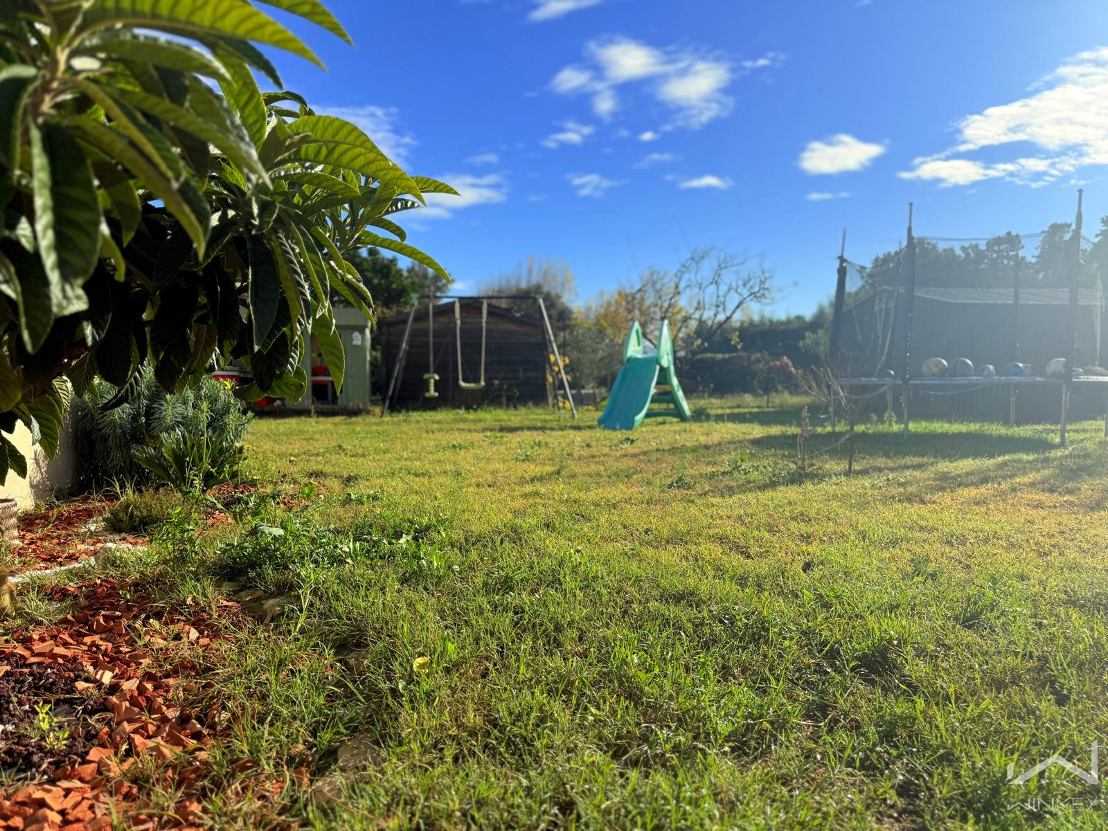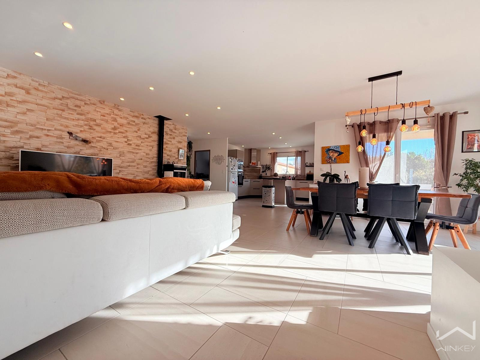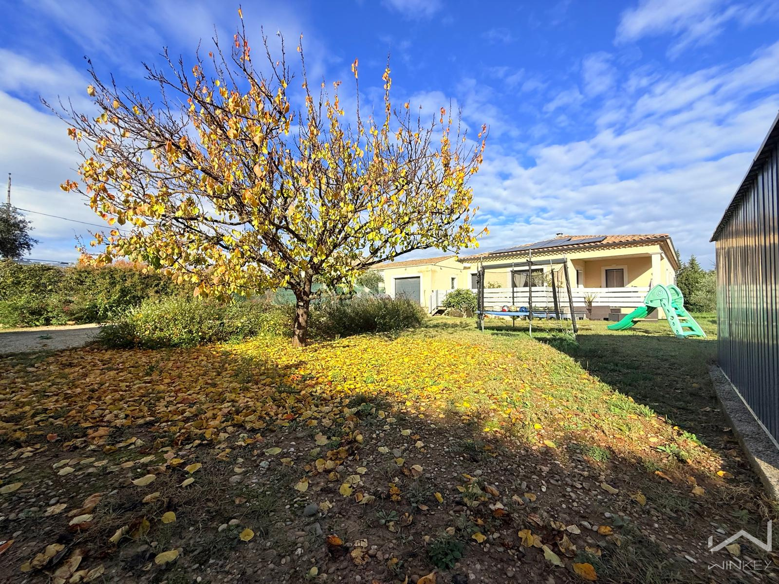 Idéalement placée, à proximité immédiate des commerces, écoles et arrêts de bus, cette maison familiale de plain-pied, construite en 2018, est édifiée sur une parcelle plate, arborée et entièrement clôturée de 842 m².