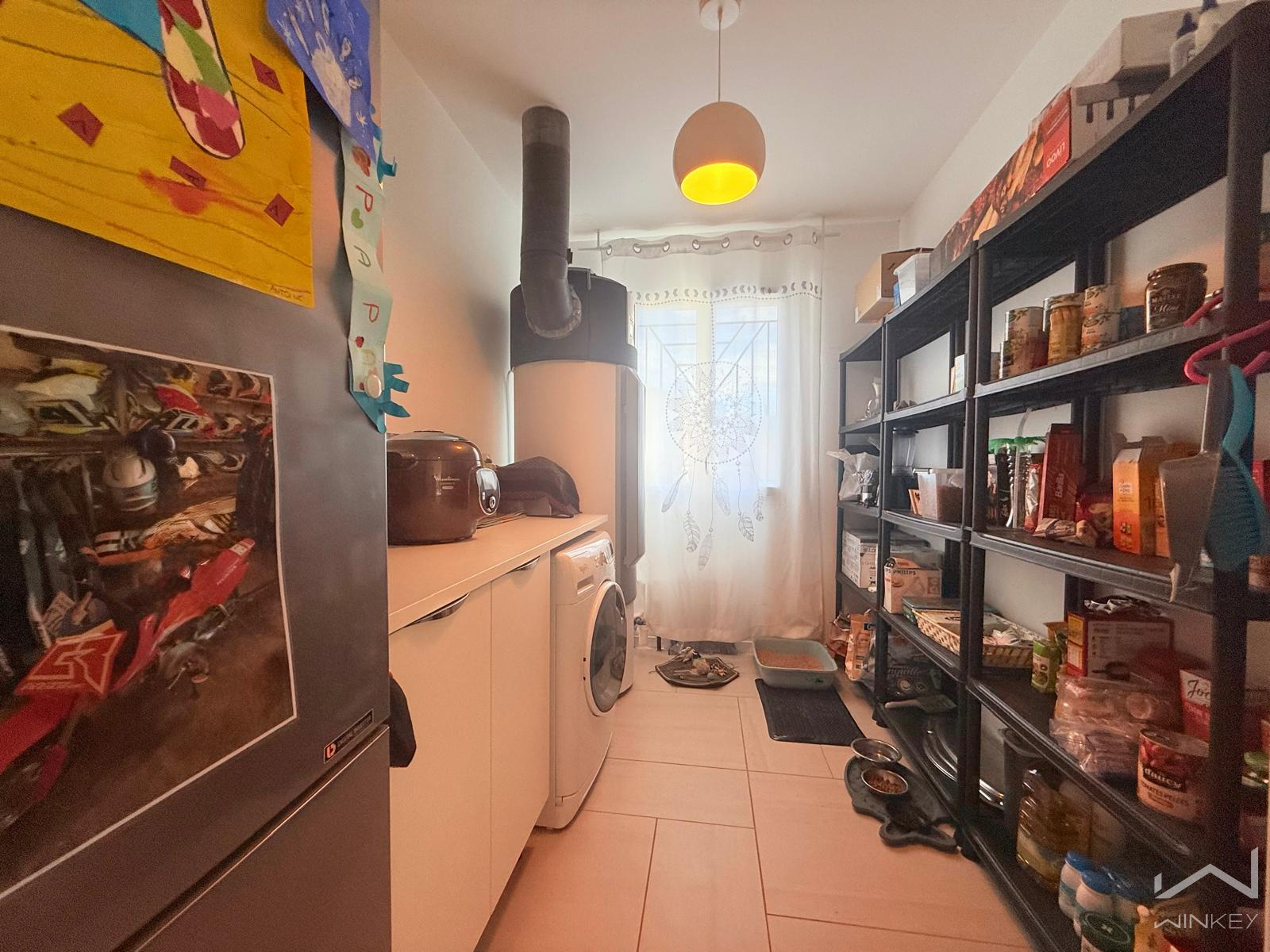 Elle dispose d’un garage attenant de 30 m², équipé d’une fosse mécanique.
