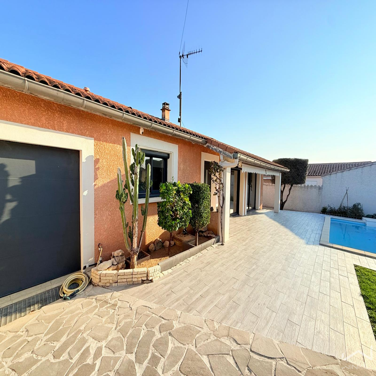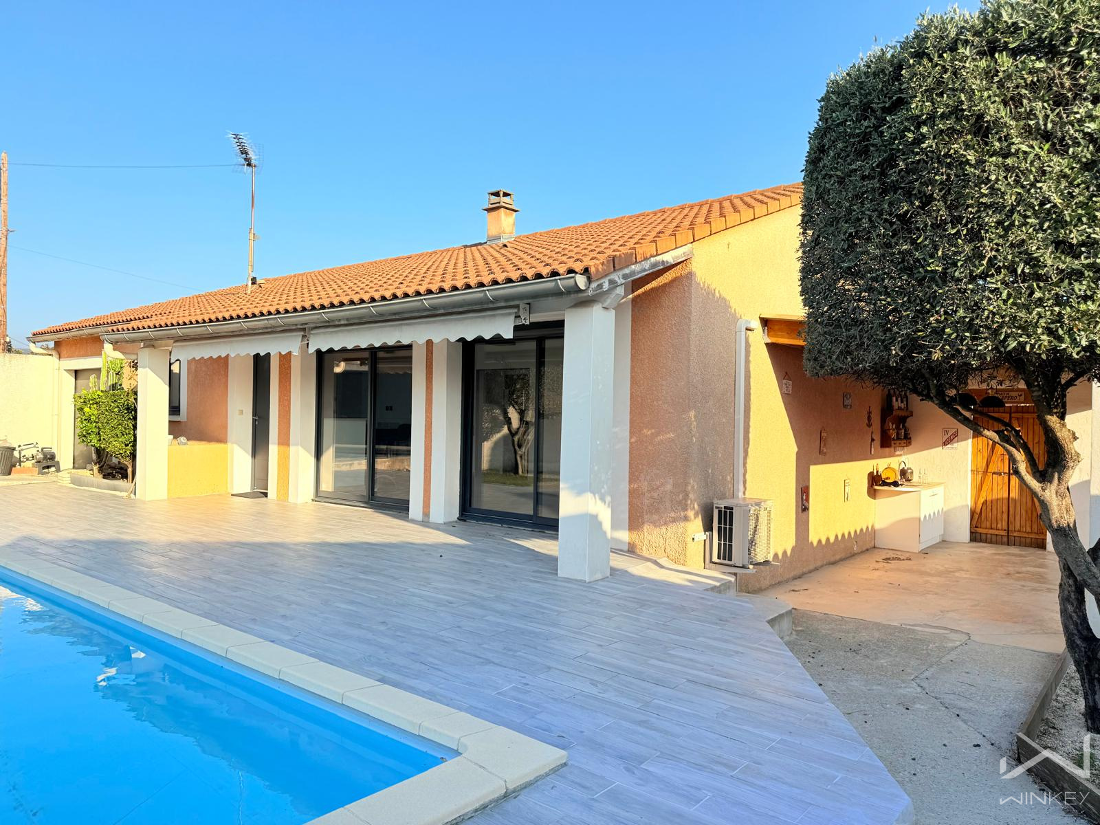 Construite dans les années 1990, la maison a été rénovée au fil des années, avec des menuiseries modernisées en aluminium, un système de chauffage performant (climatisation réversible + radiateurs à inertie dans toutes les pièces), des volets roulants électriques centralisés, une remise aux normes de l’électricité etc.
