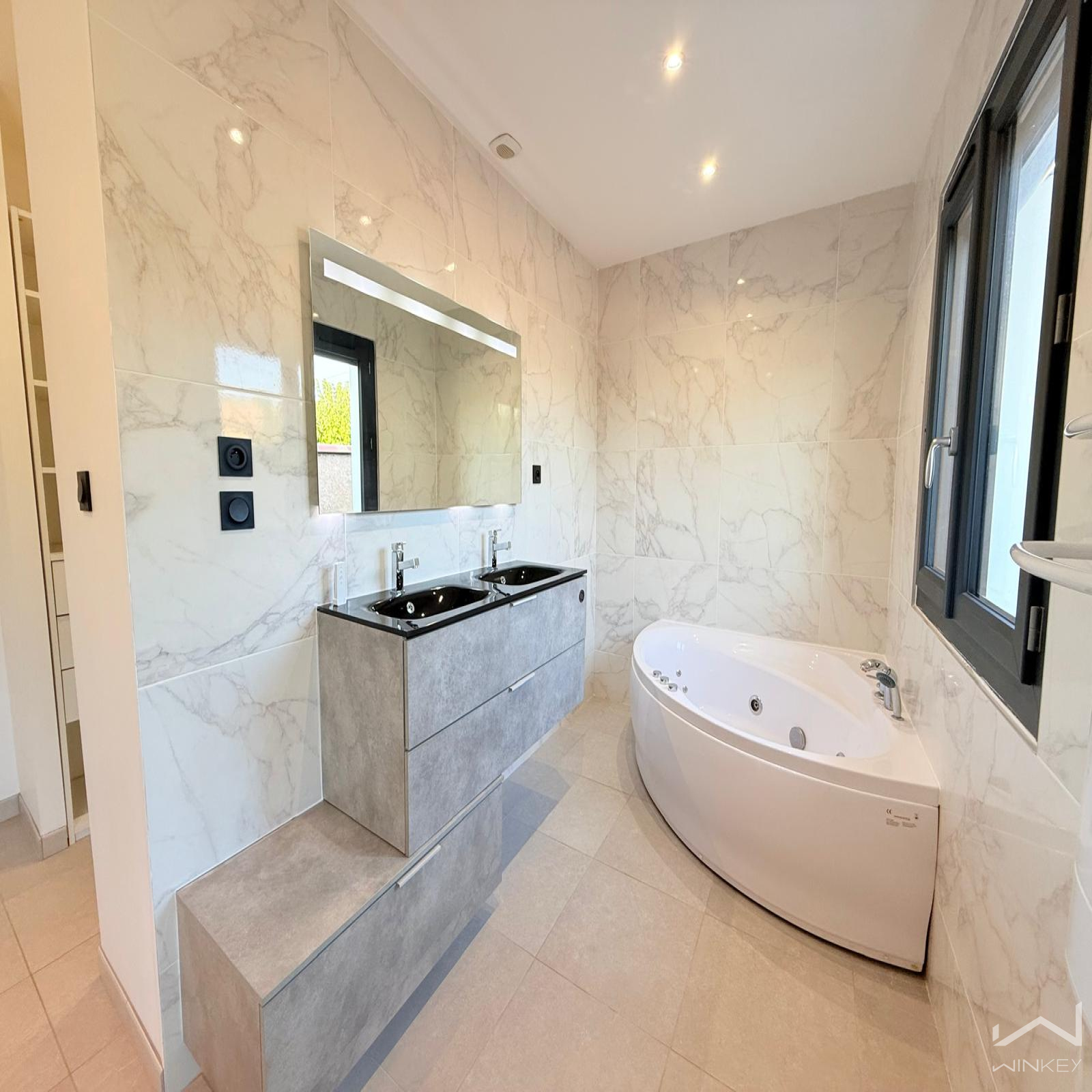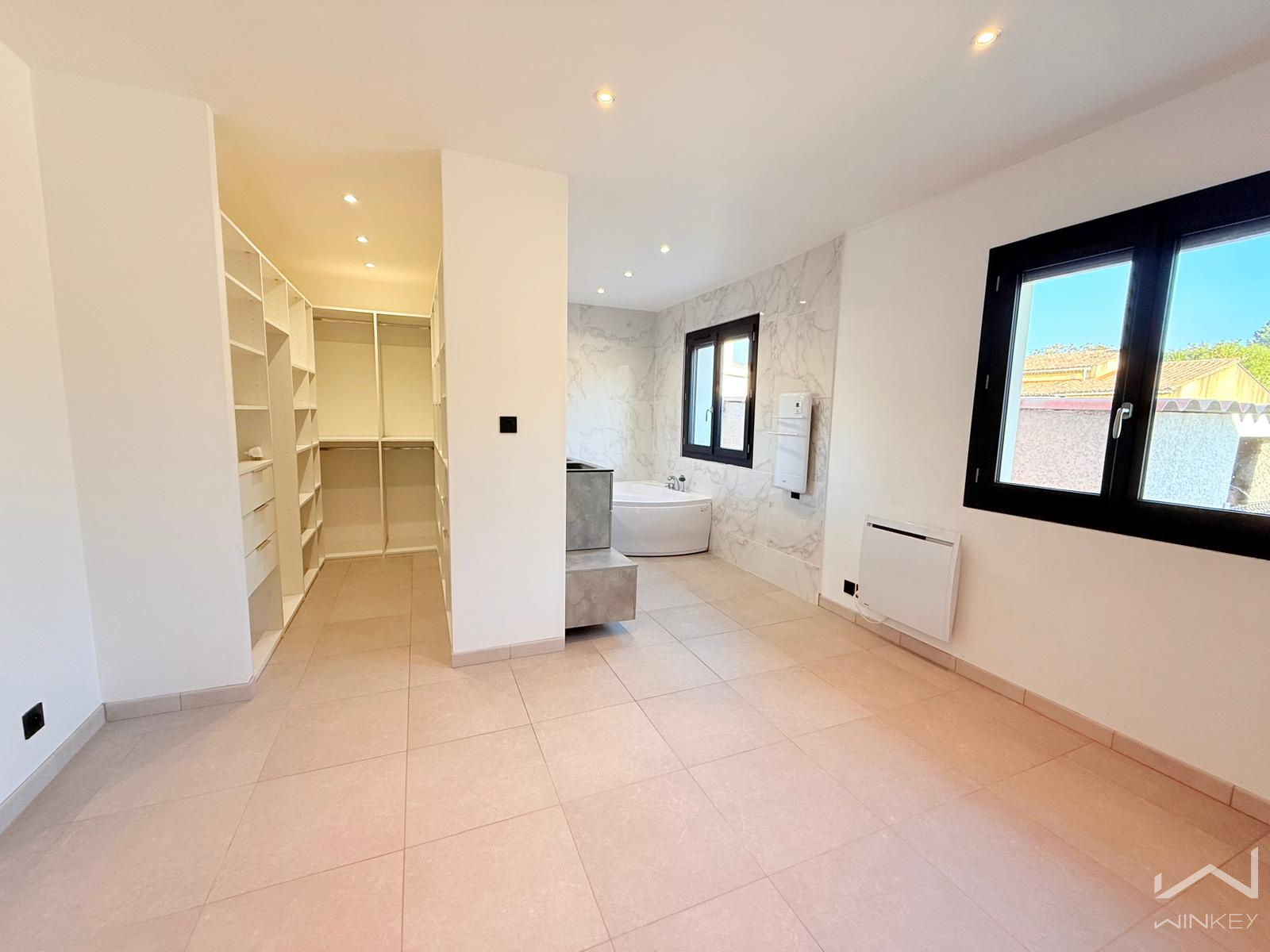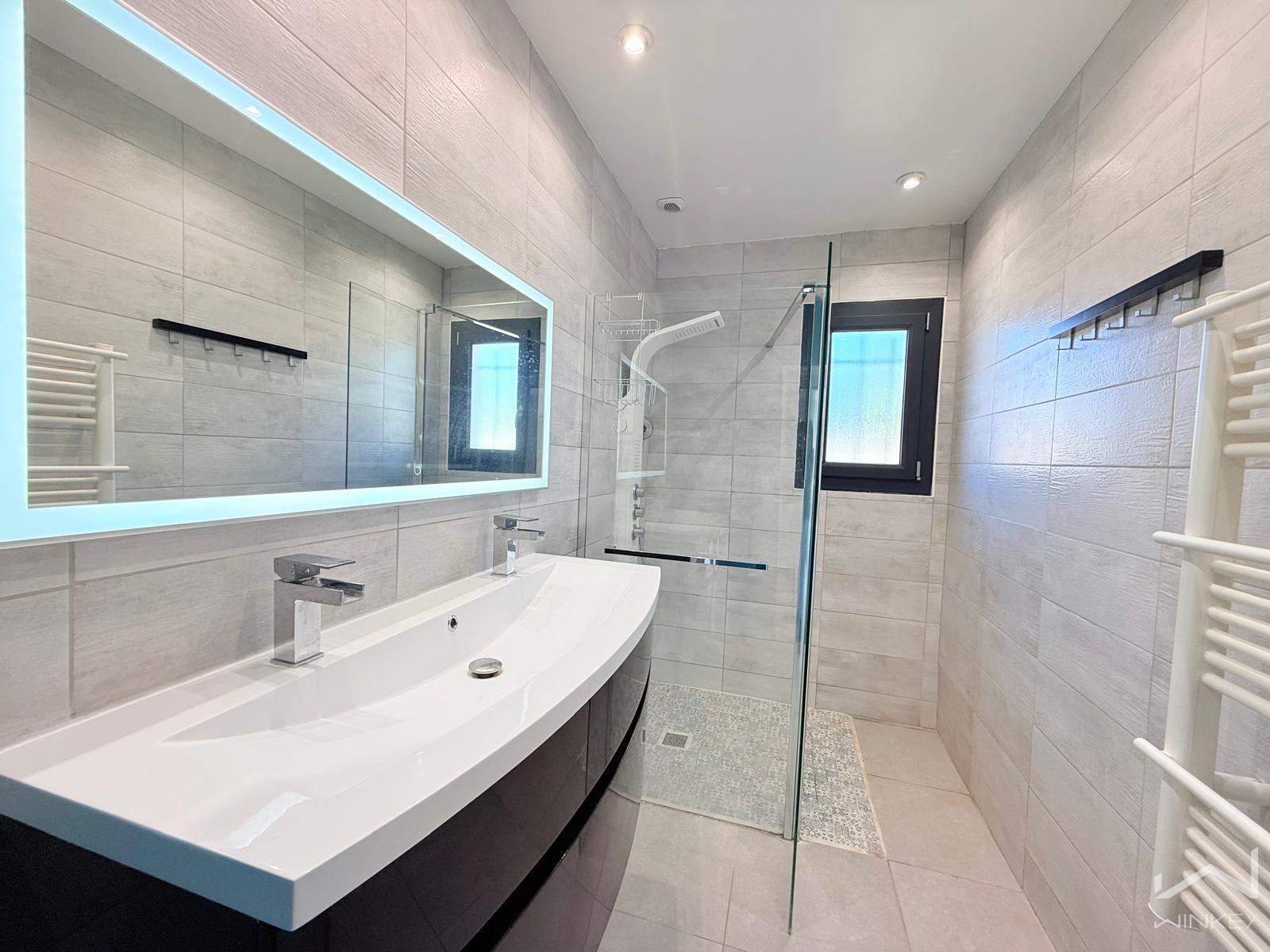 La partie nuit se compose de trois chambres, dont une suite parentale avec baignoire d’angle, accompagnée d’une salle d’eau avec douche italienne et d’un WC indépendant.