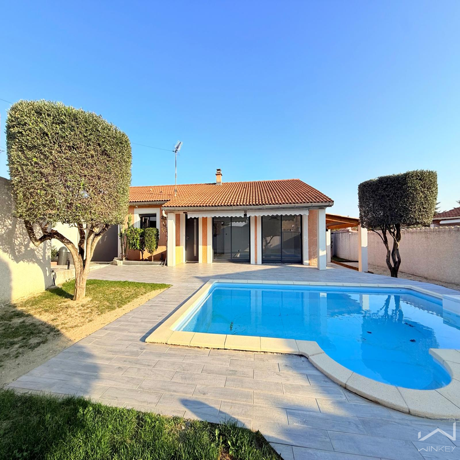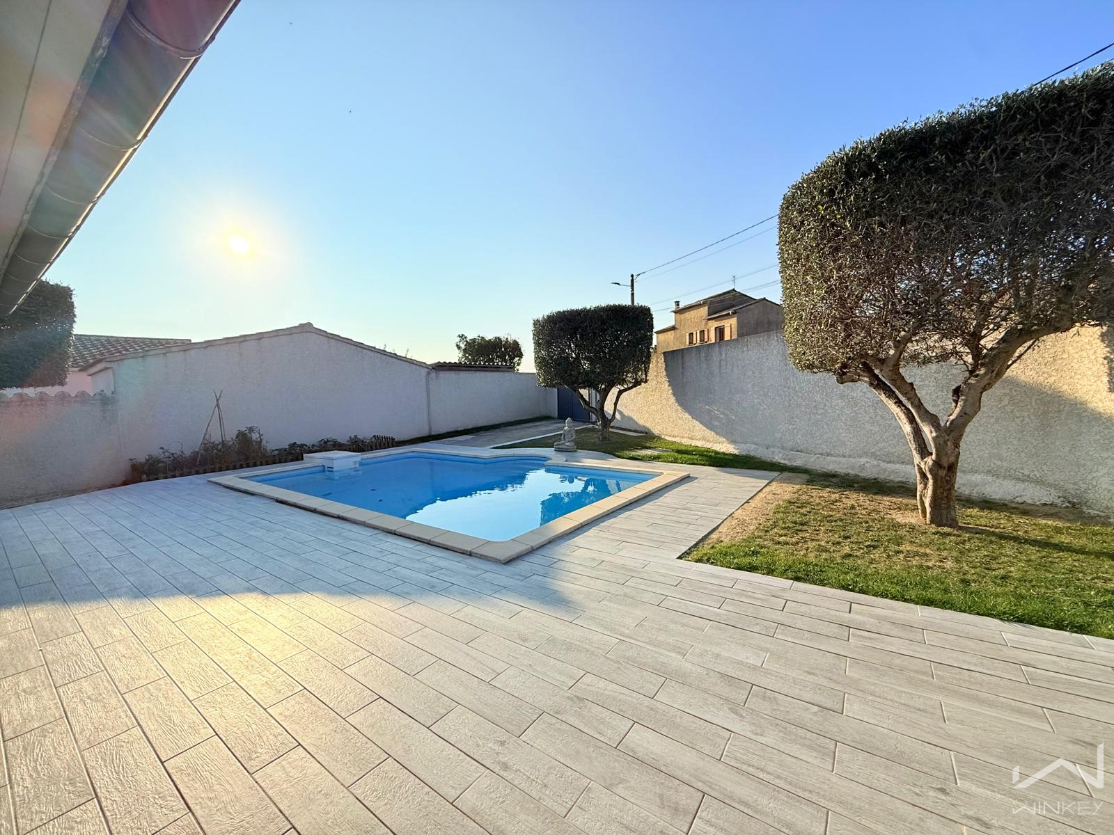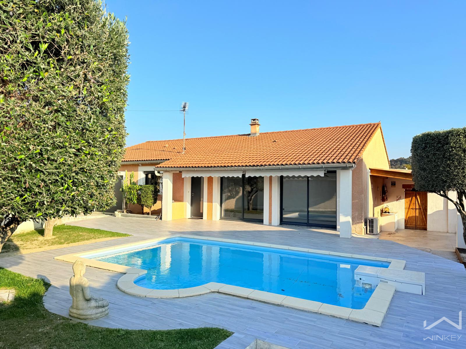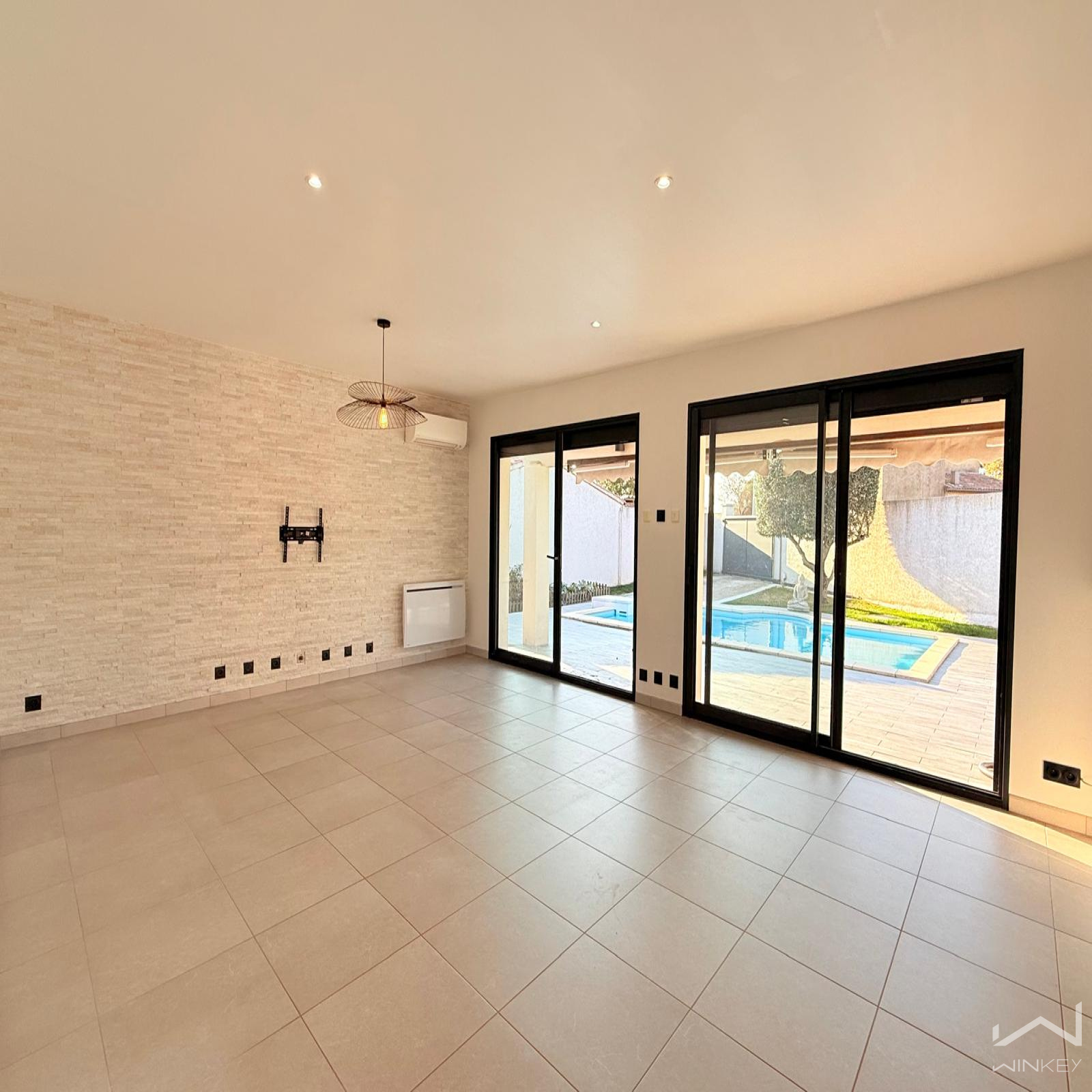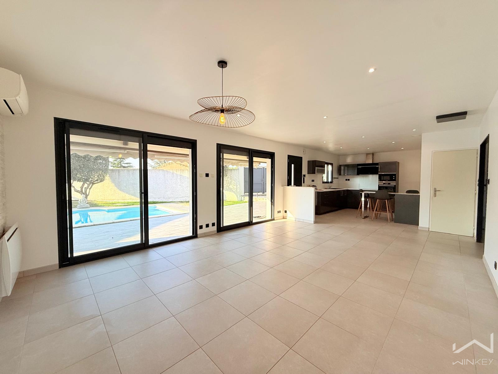 D’une surface d’environ 100 m², elle dispose d’une pièce à vivre de 45 m² baignée de lumière grâce à de grandes baies vitrées offrant une vue sur la piscine.