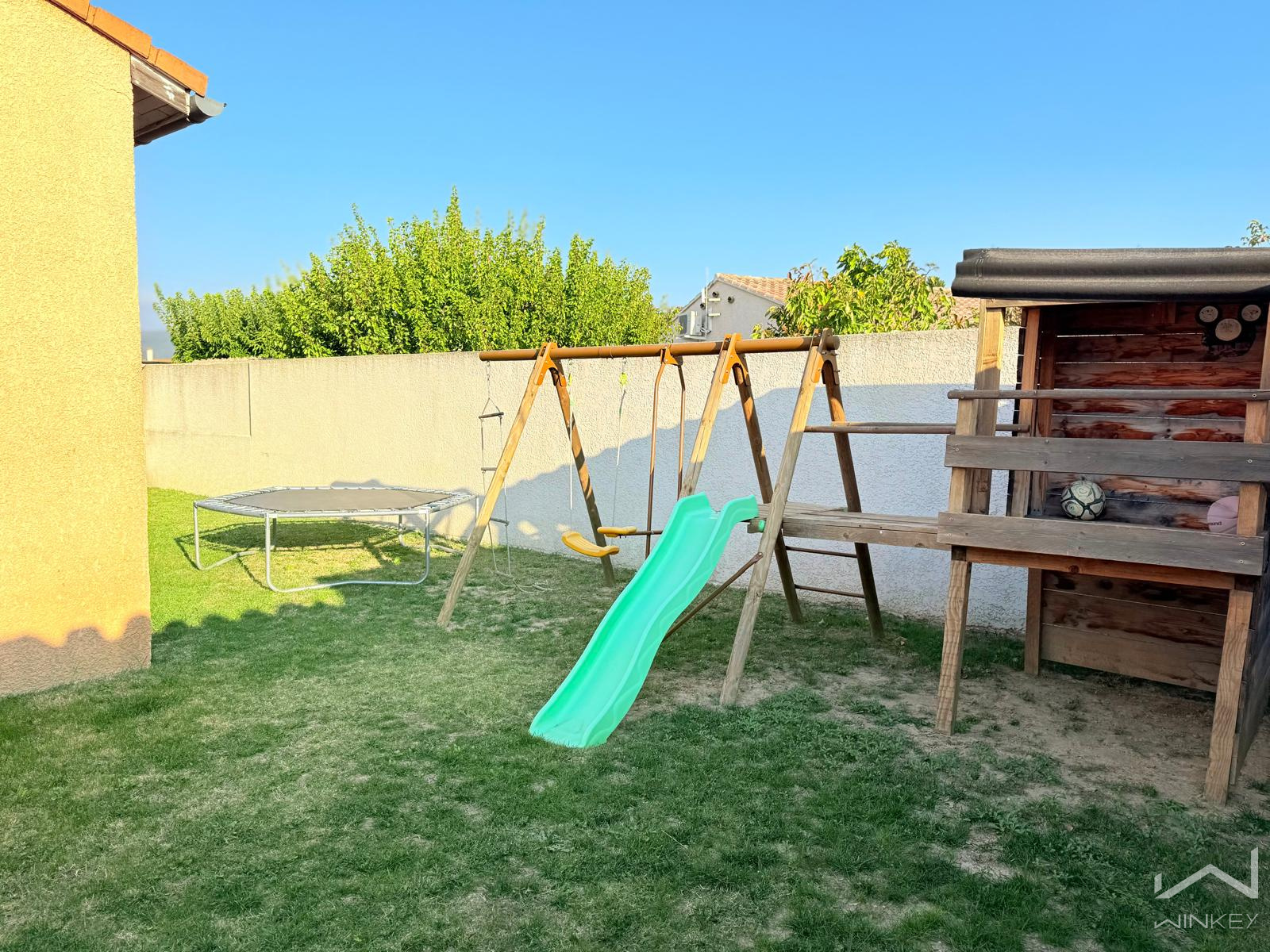 Le terrain de 465 m², plat et entièrement arboré et clôturé, bénéficie d’un système d’arrosage automatique pour un entretien facilité.