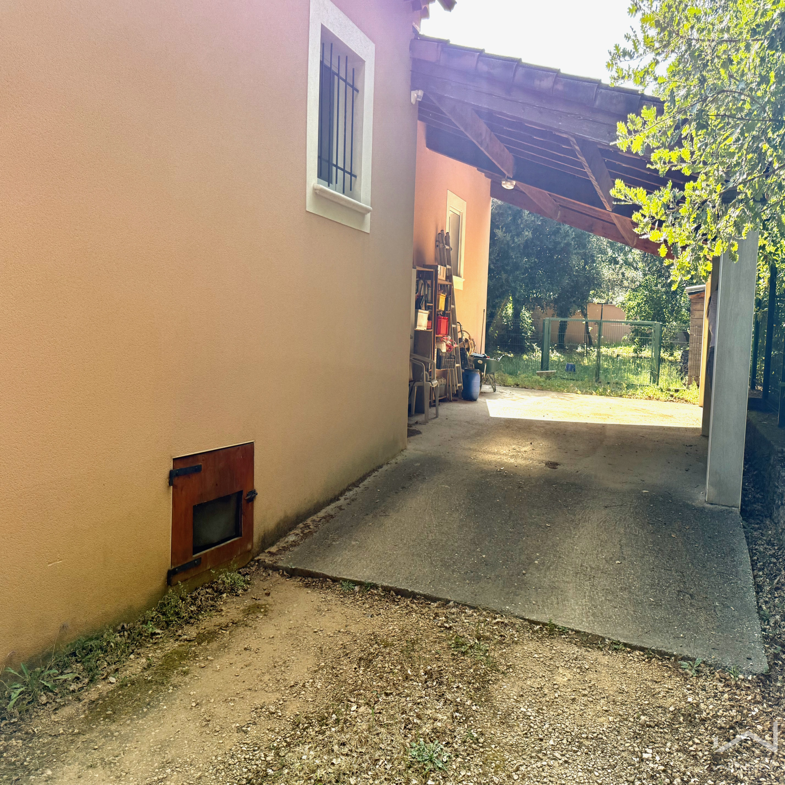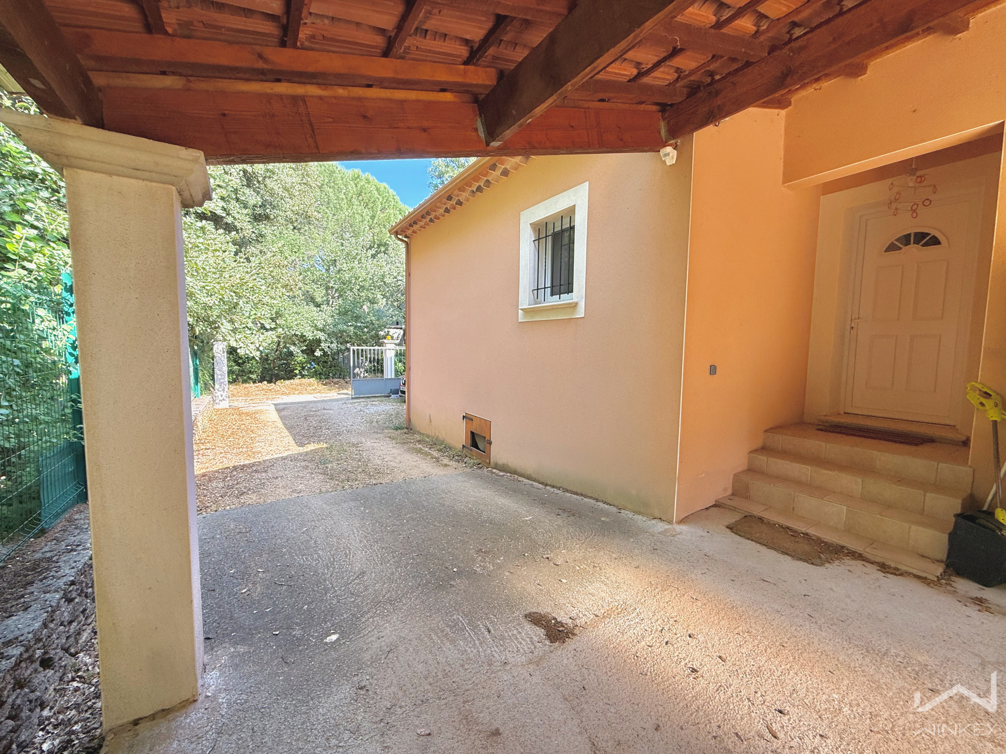 L’accès est sécurisé par un portail électrique, et les extérieurs sont complétés par un abri voiture ainsi qu’un abri bois, offrant confort et praticité au quotidien.