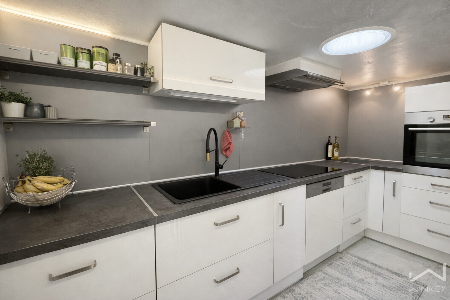 Une cuisine ouverte entièrement équipée, avec électroménager récent.