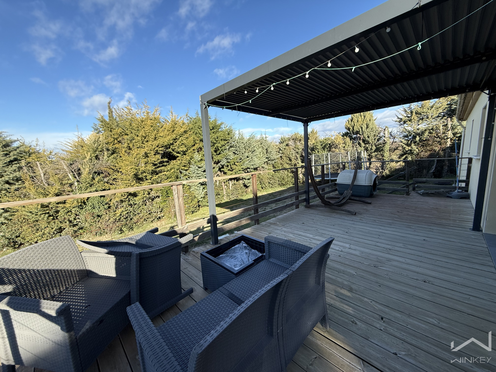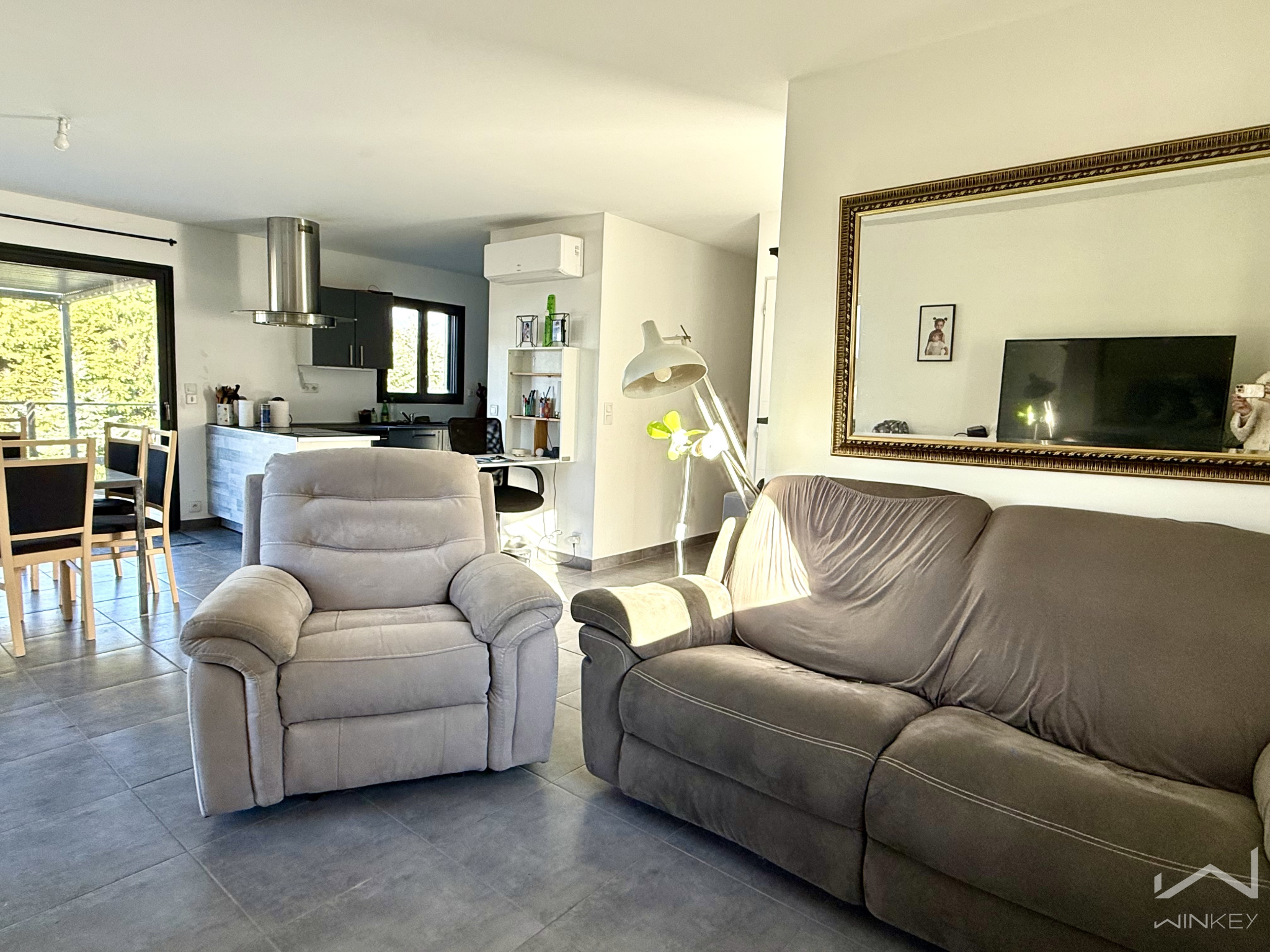 Dès l’entrée, vous serez séduit par une pièce de vie baignée de lumière, agréable et fonctionnelle, ouverte sur une superbe terrasse en bois. Un véritable espace de vie extérieur, idéal pour les repas en famille, les soirées d’été ou simplement profiter de la vue dégagée sur l’environnement naturel.