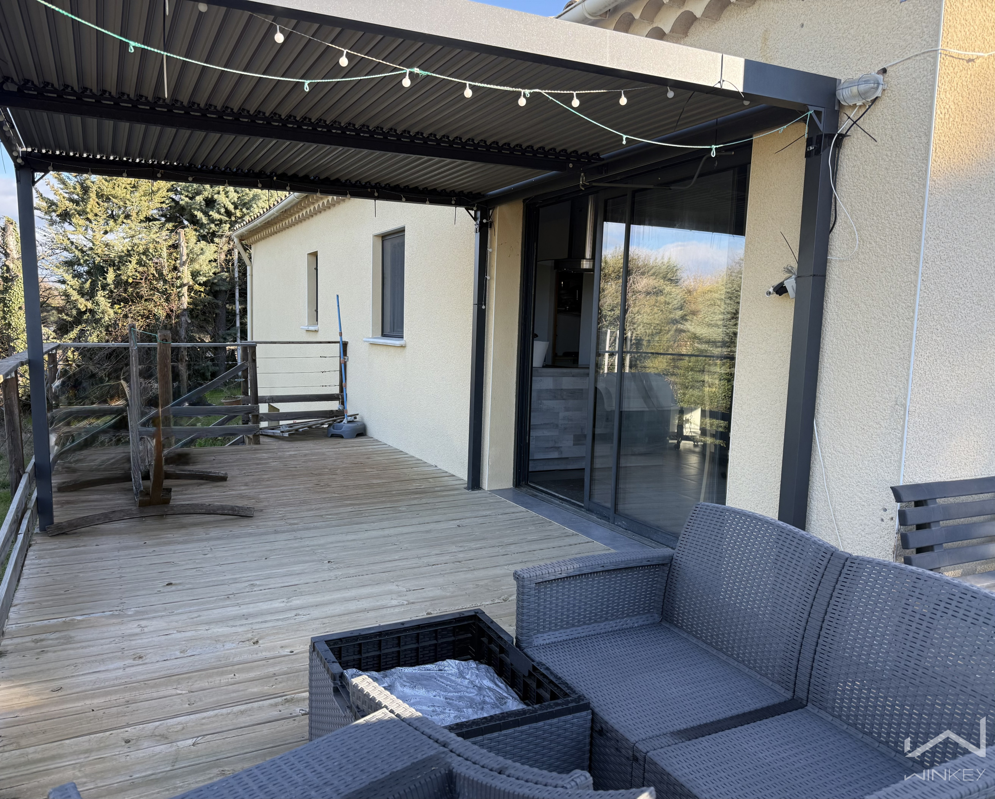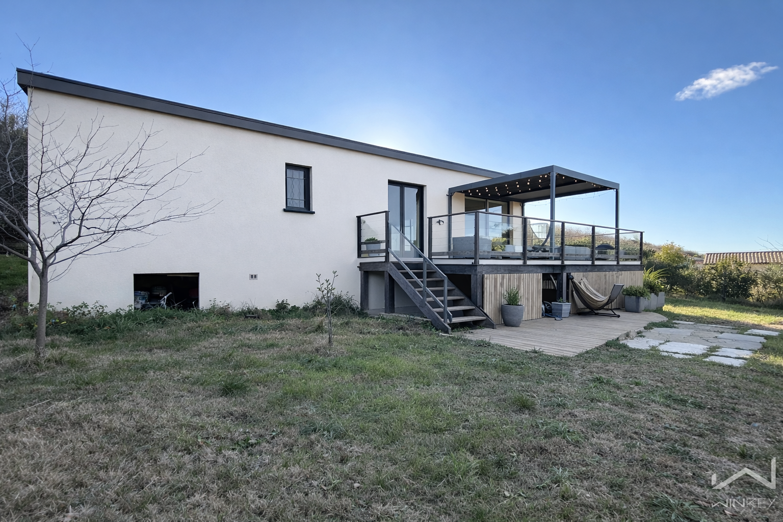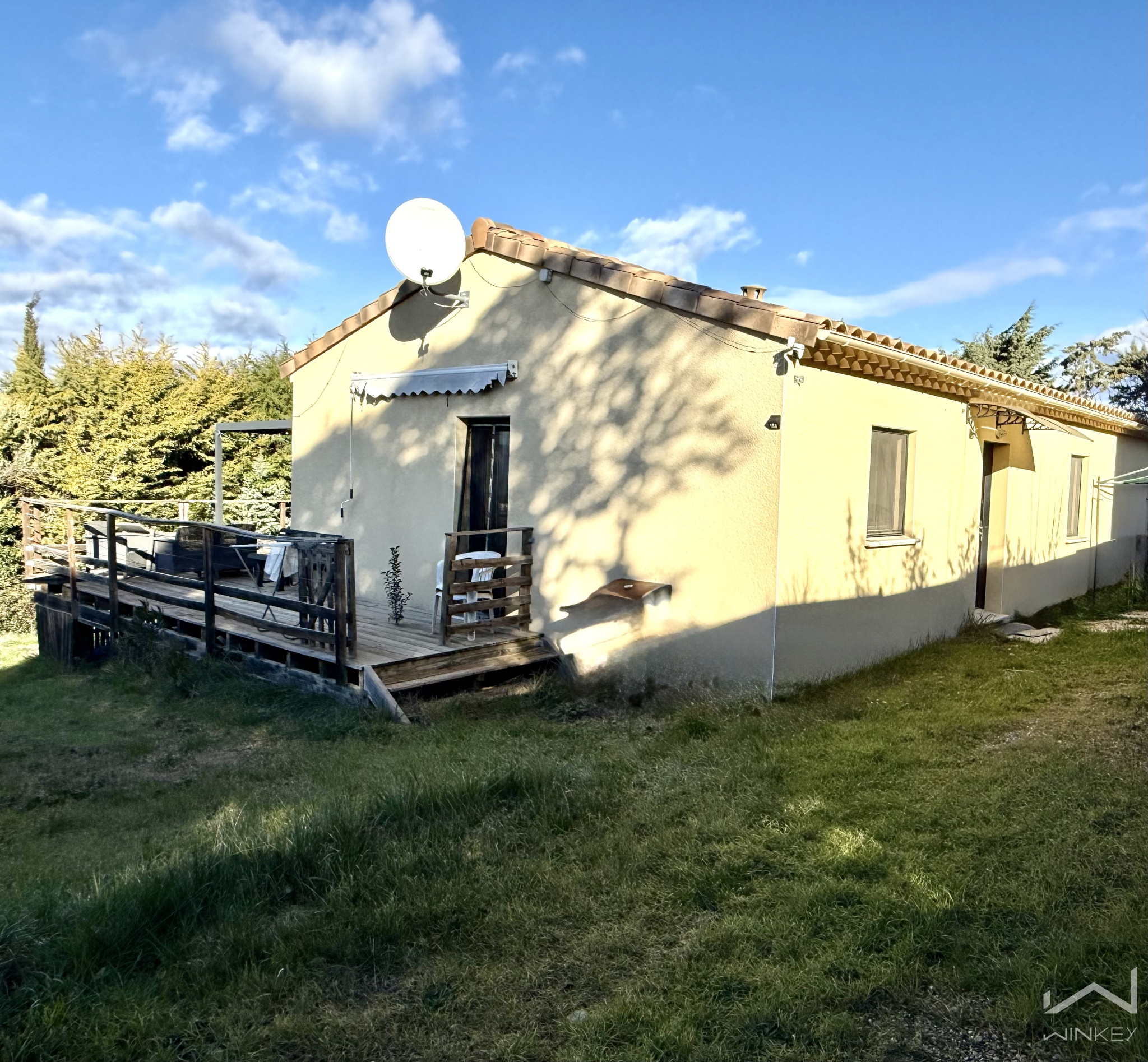 À l’extérieur, le terrain clos offre intimité et tranquillité, avec une terrasse particulièrement agréable, lumineuse et très fonctionnelle, véritable atout de la maison.
