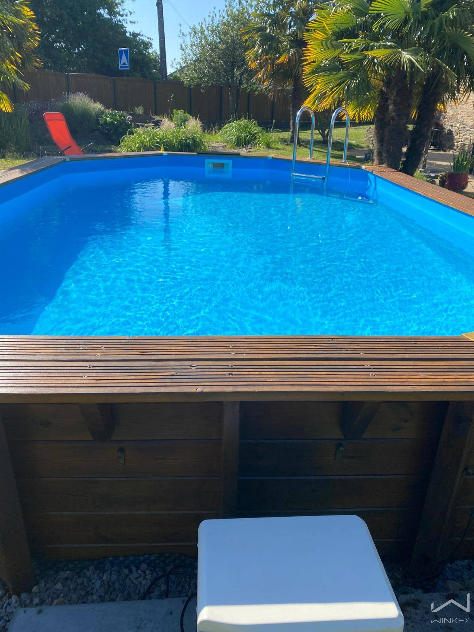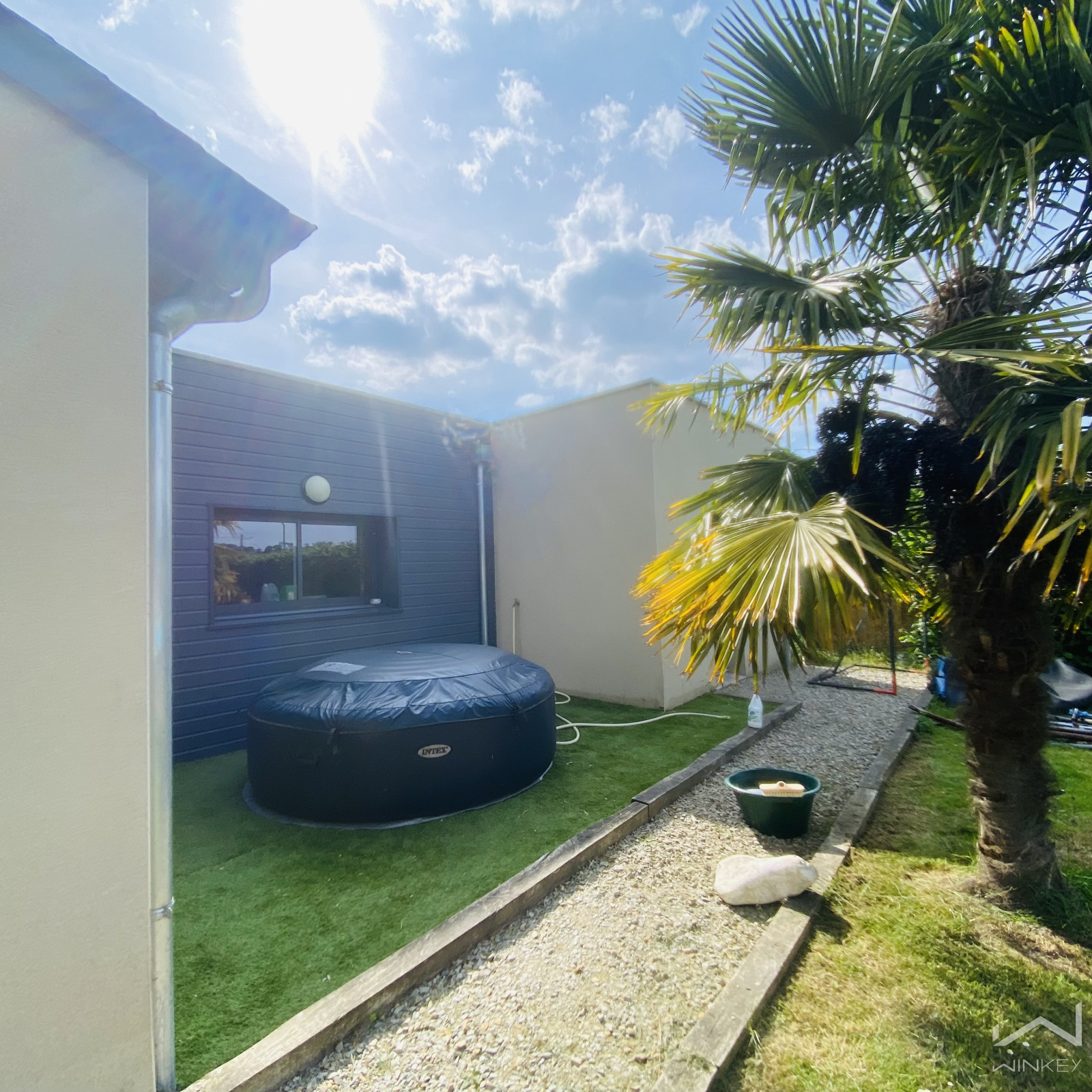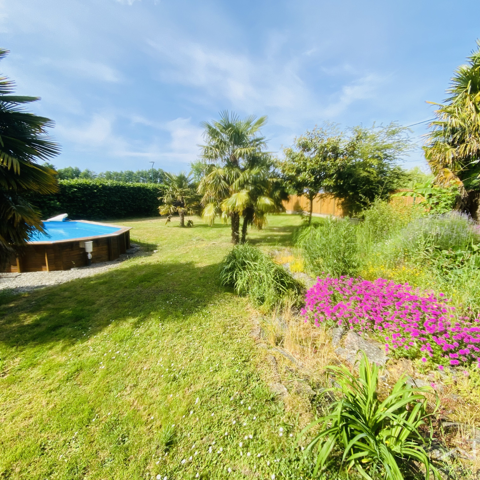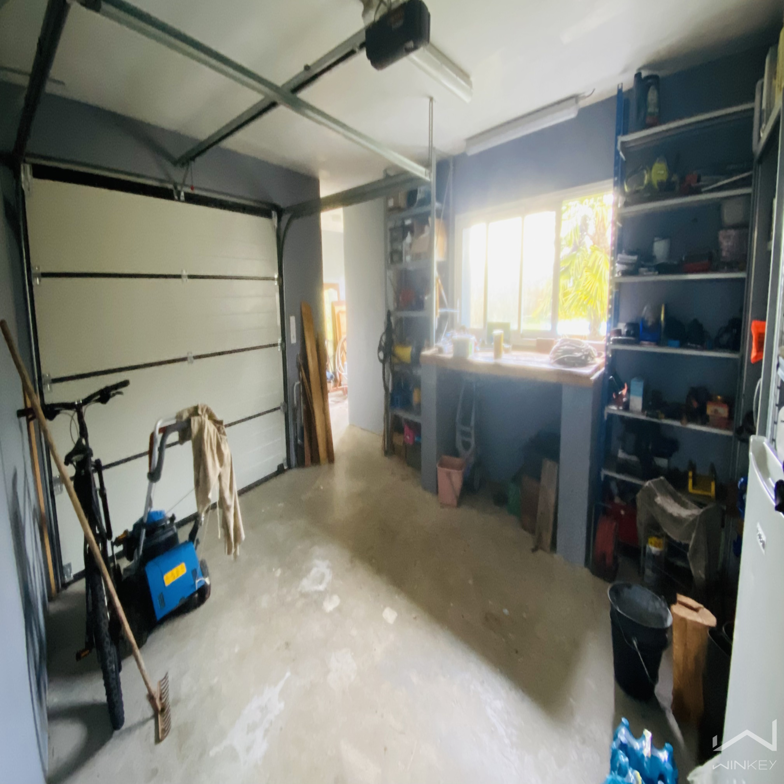 A l'extérieur : un grand garage accessible par la maison et un terrain clos et arboré (palmiers et oliviers) avec belle piscine semi-enterrée chauffée (pompe à chaleur propre).