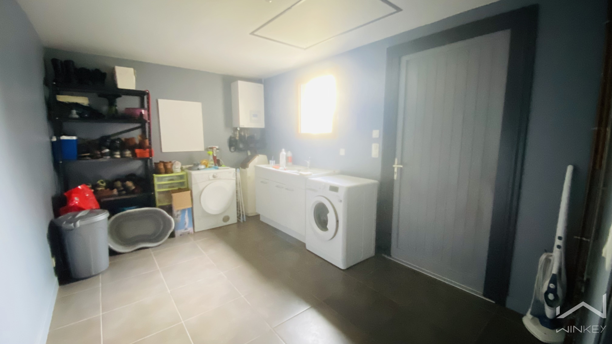 Au rez-de-chaussée: une pièce de vie lumineuse de 61 m² donnant sur une cuisine aménagée et équipée de 25m², un pièce de rangement, un grand bureau pouvant être aménagé en chambre, une buanderie, un espace rangement/douche pour la piscine (en attente), 2WC indépendants.