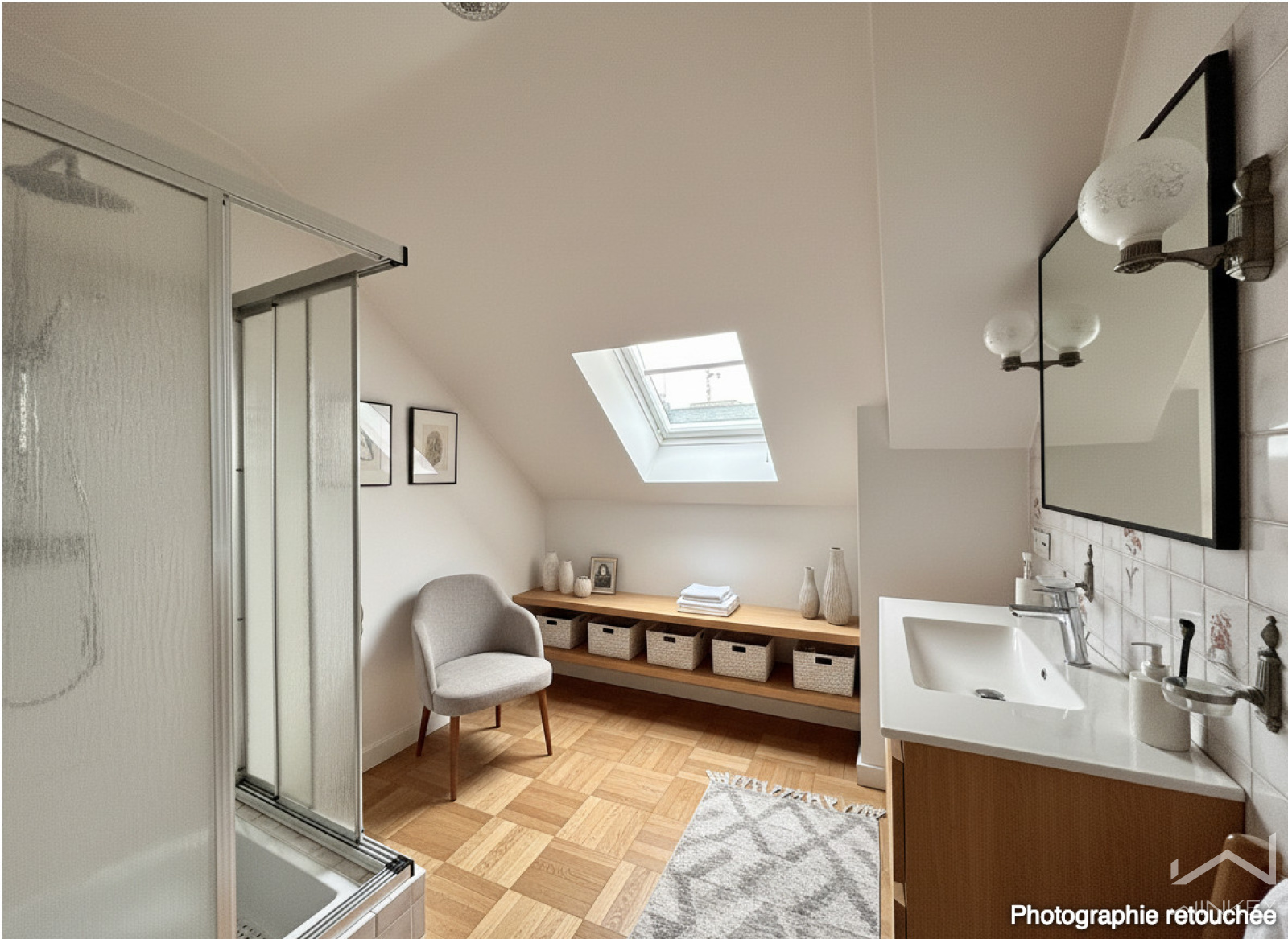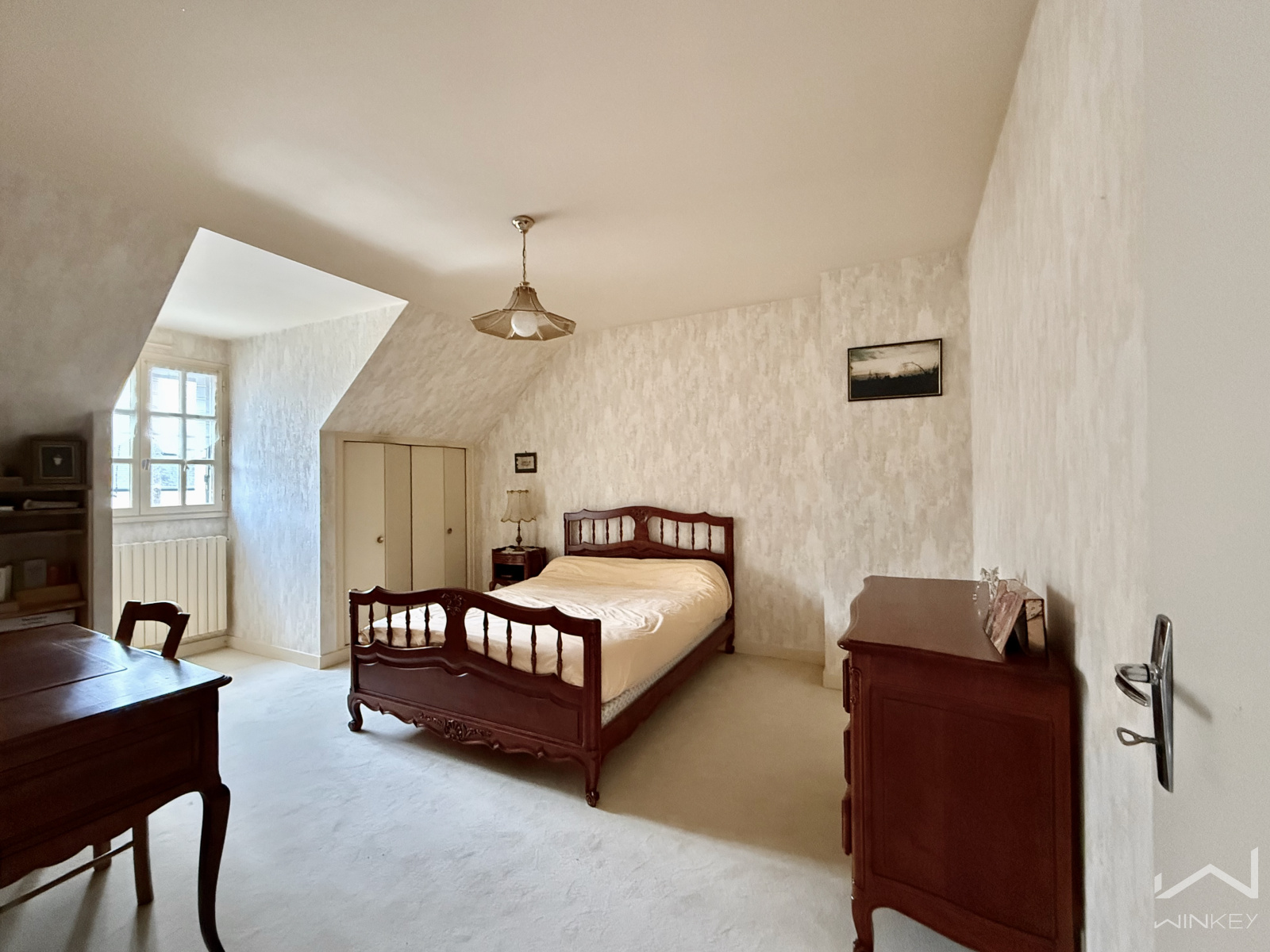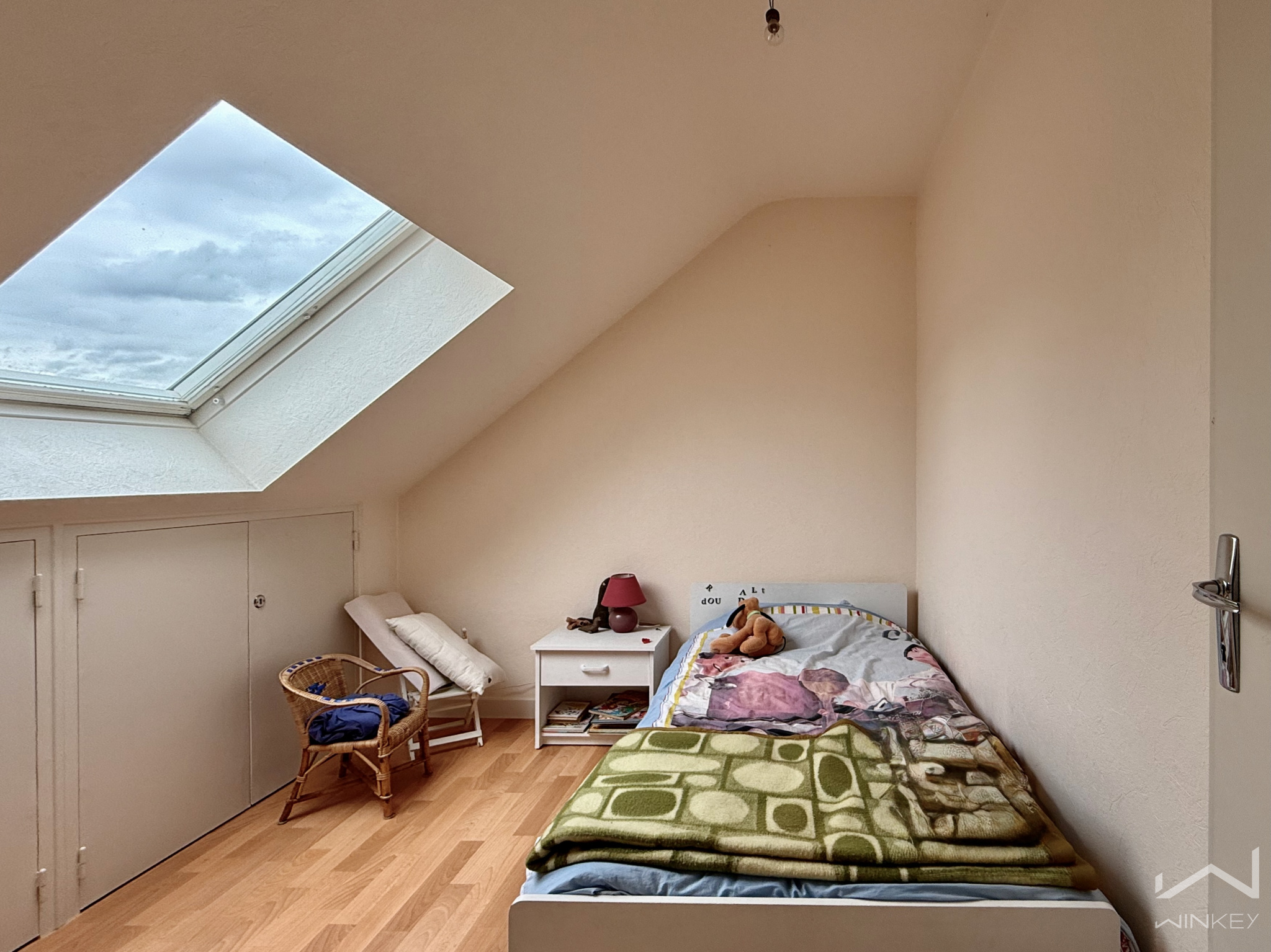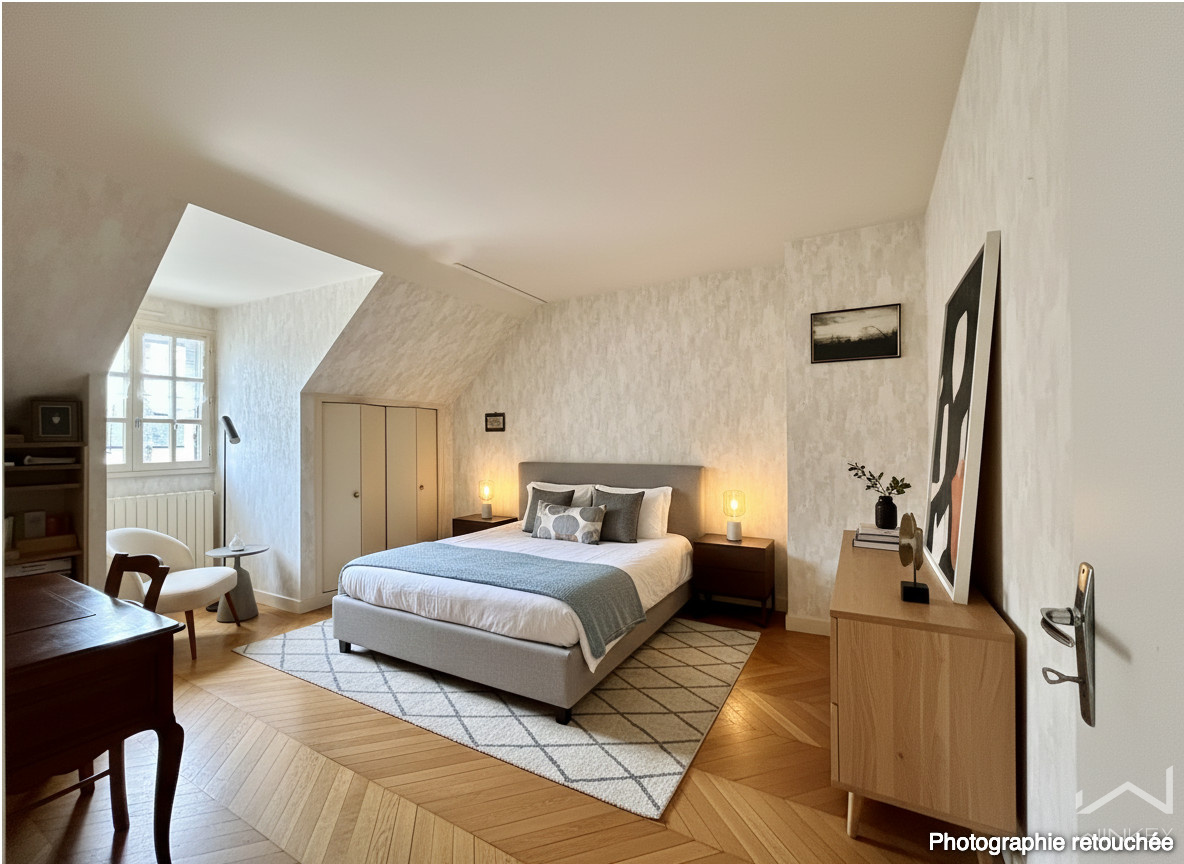 À l’étage, un palier distribue deux belles chambres aux volumes généreux (16 m² et 12 m²), une salle d’eau, ainsi qu’un bureau mansardé, parfait pour le télétravail ou un espace créatif. Un grenier d’environ 10 m² vient enrichir les possibilités d’aménagement.