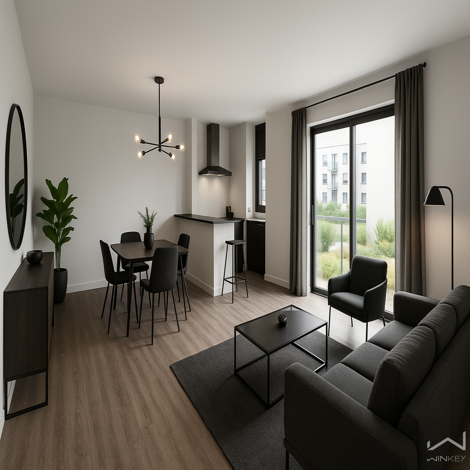 Il se compose d’une entrée, d’un spacieux salon-séjour avec cuisine aménagée et équipée ouverte (31m²), le tout donnant sur un grand balcon de 17 m² exposé Sud-Ouest, parfait pour profiter du soleil.