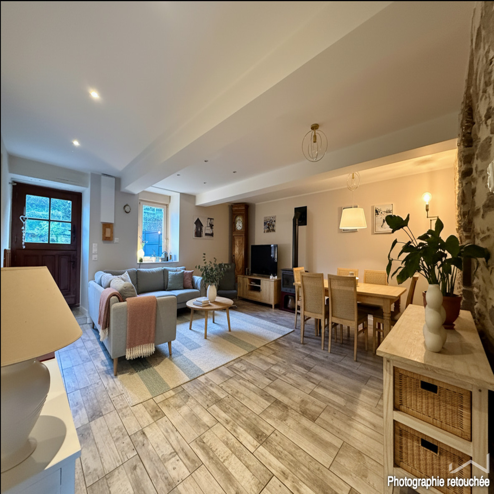 La maison comprend au rez-de-chaussée une entrée ouvrant sur un bel espace de vie salon-séjour chaleureux et lumineux de 33 m² avec pierres apparentes et poêle à bois, une grande cuisine indépendante aménagée et équipée de 15 m², une suite parentale de 18 m² avec dressing et salle d’eau (douche italienne), un espace bureau ainsi qu’un WC indépendant avec cabinet de toilette.