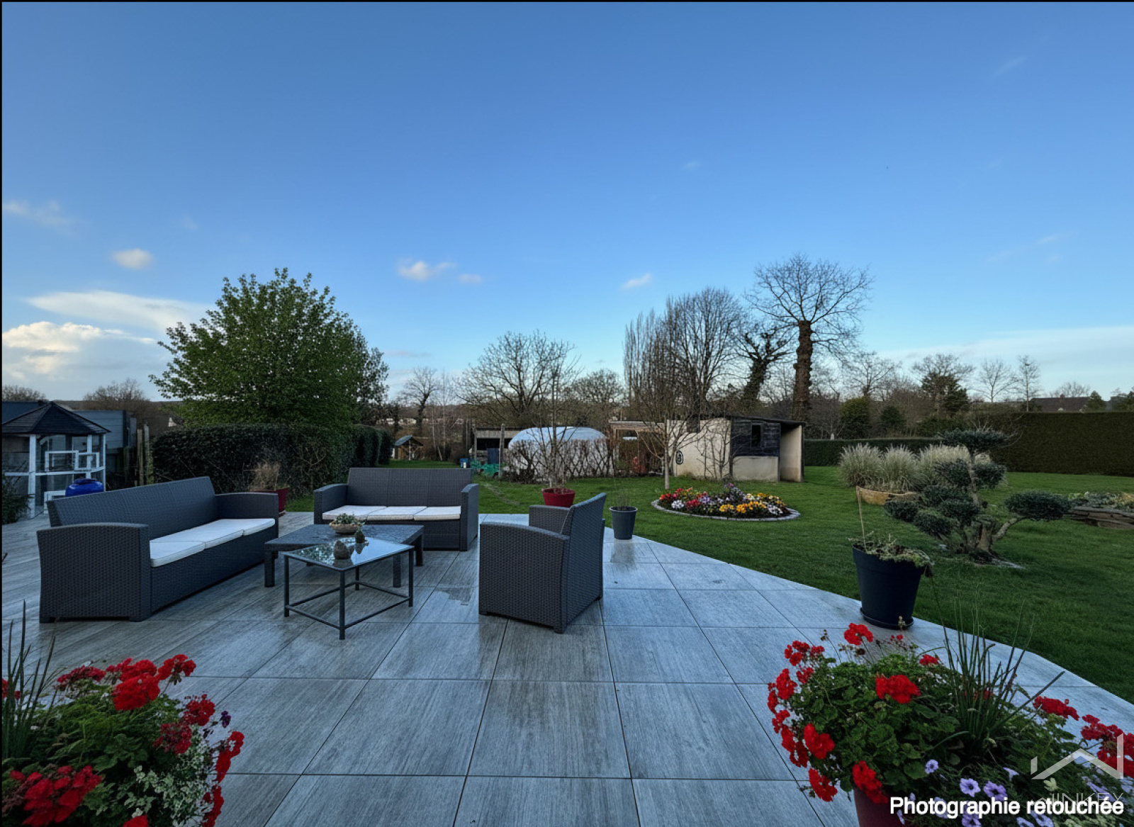 La maison est équipée de double vitrage et dispose d’un garage de 25 m² avec coin buanderie, d’un second garage atelier de 40 m² attenant, ainsi que d’un abri de jardin à proximité du plan d’eau.