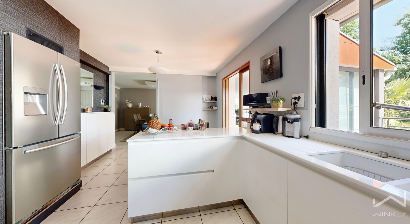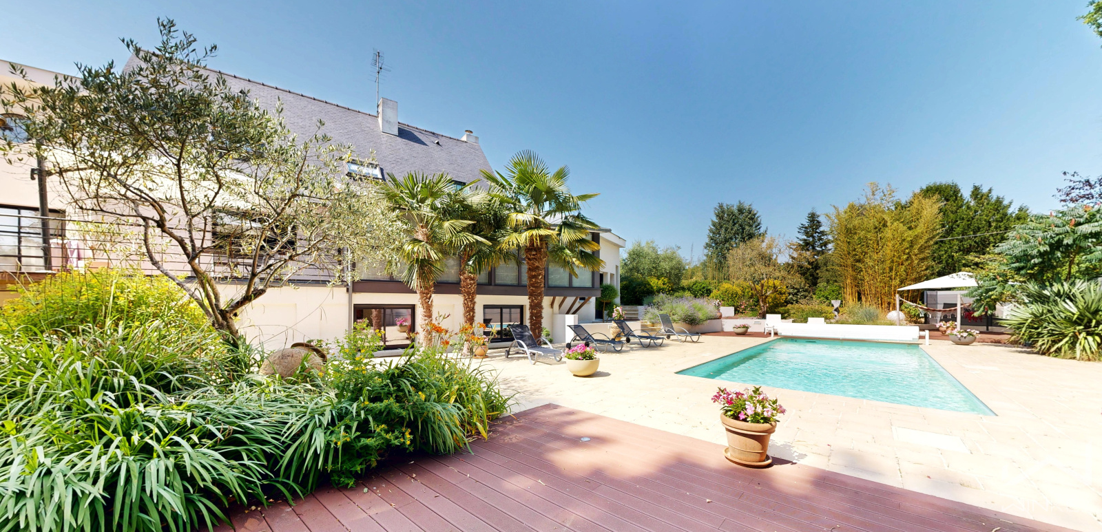 La réception et la cuisine dévoilent une superbe terrasse en bois rejoignant la suite, surplombant la piscine avec ses différents espaces de détente, terrasse, solarium et barbecue, ainsi qu'un charmant jardin clos et arboré, où vous pourrez profiter de la nature à l'abri des regards indiscrets.