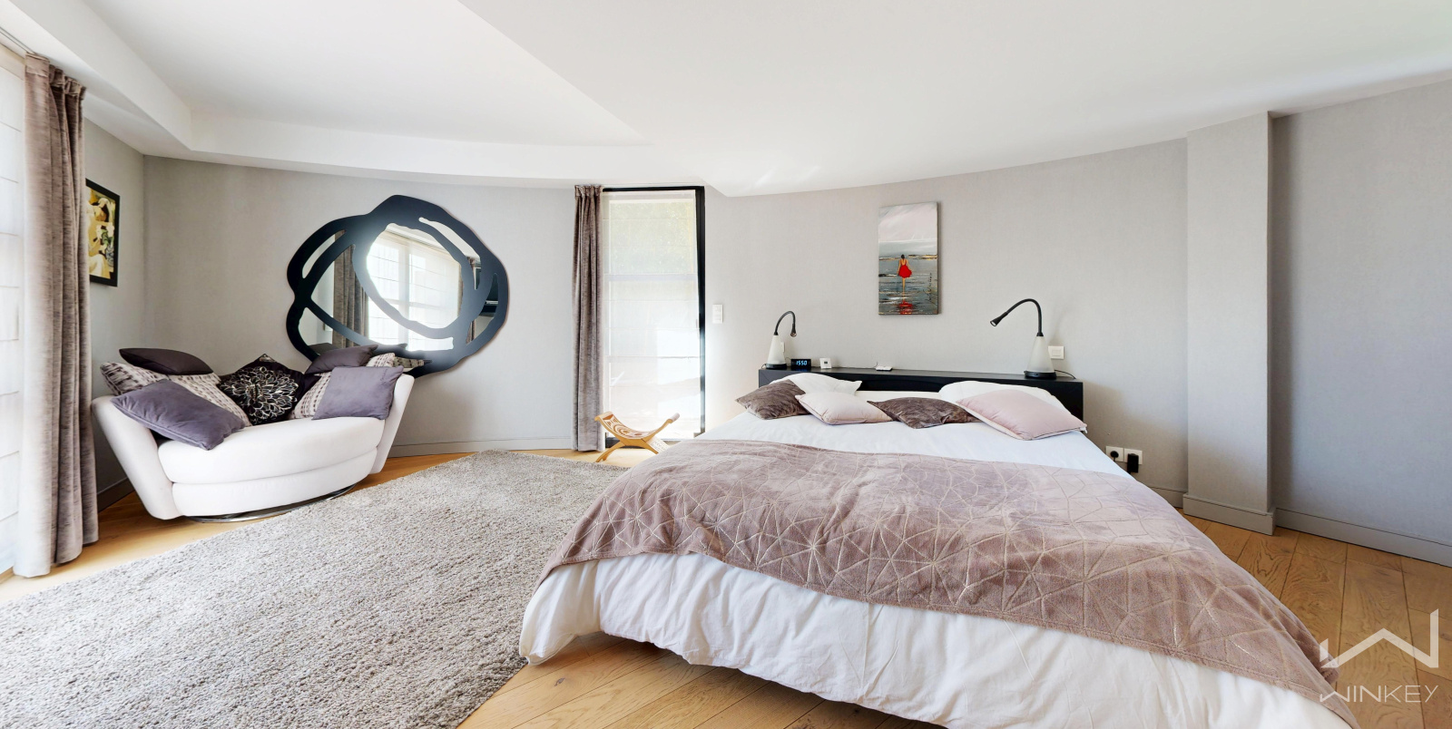 Côté nuit, le niveau supérieur se compose d'une grande mezzanine desservant un bureau, une salle de bains mixte (douche et baignoire), ainsi que trois chambres avec possibilité d'une 4ᵉ.