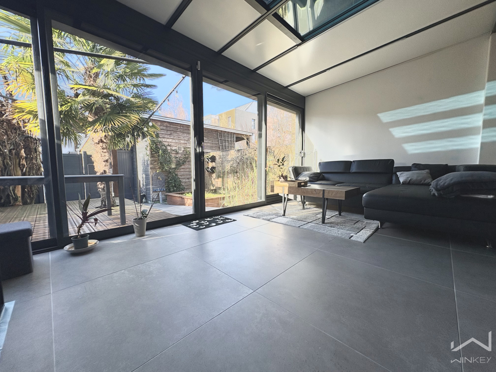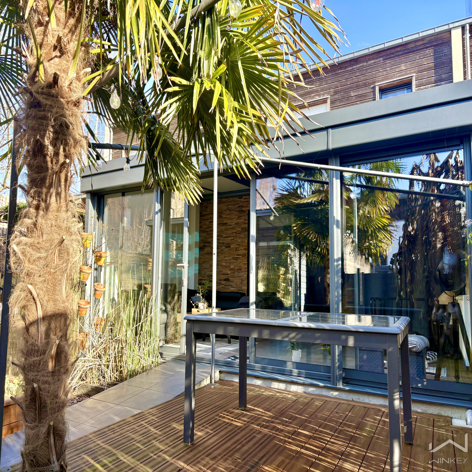 La véranda se prolonge sur une grande terrasse en bois dans le jardinet de ville clos, agrémenté d’une végétation soignée, offrant un extérieur facile à vivre.