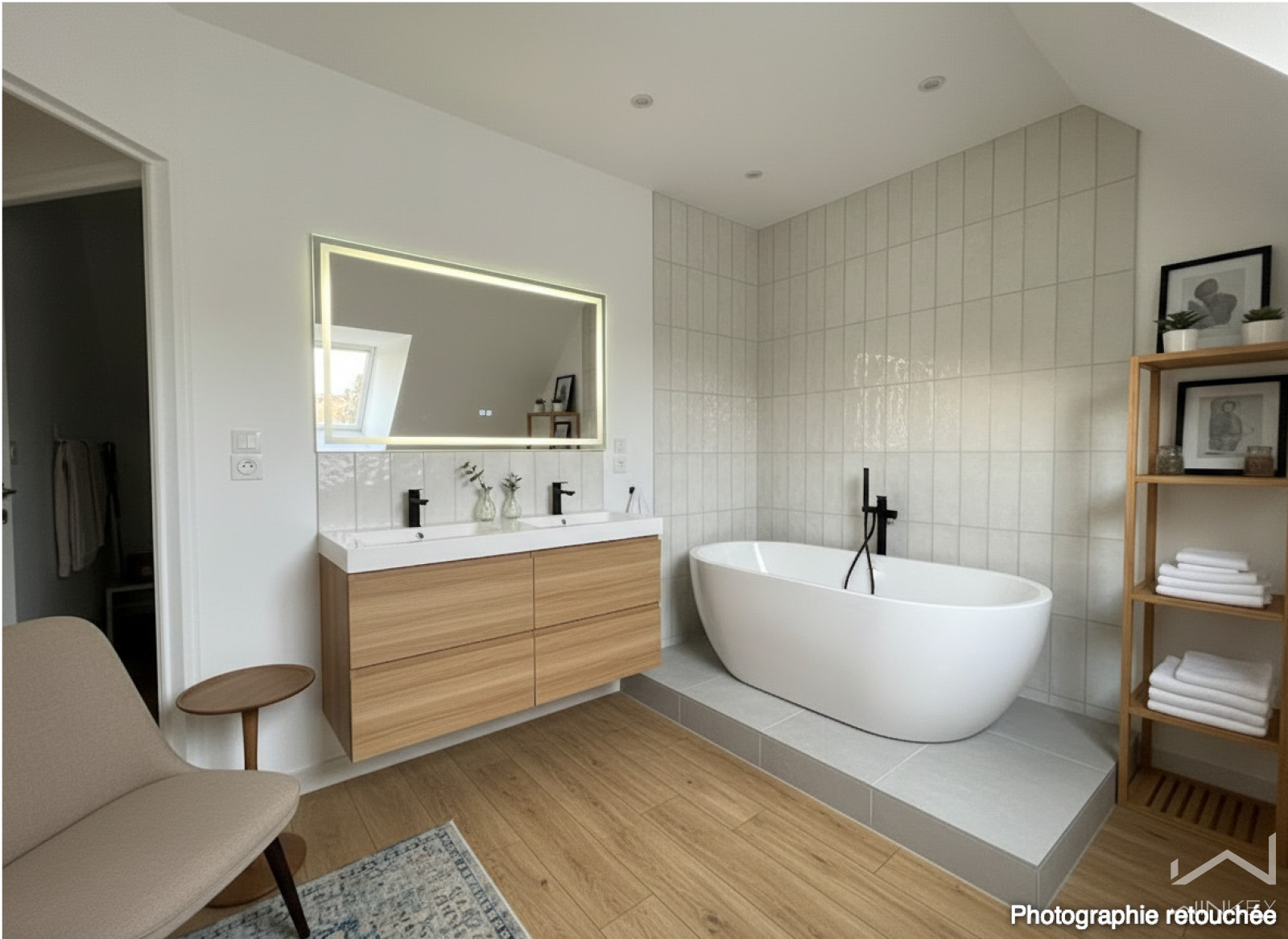 À l’étage, un palier desservant trois chambres, une salle de bains ainsi qu’un très bel espace mansardé offrent de nombreuses possibilités (grande chambre, salle de jeux, musique…).