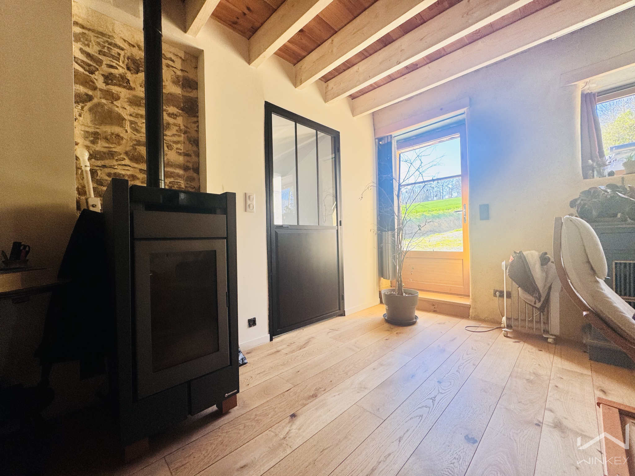 • Salon-séjour chaleureux avec poutres apparentes, cheminée et poêle à granulés