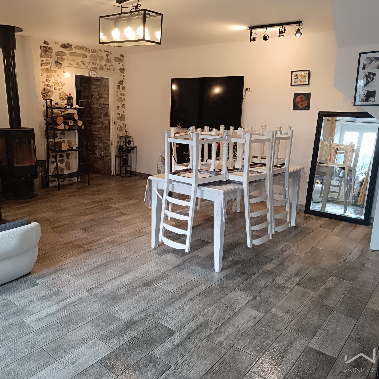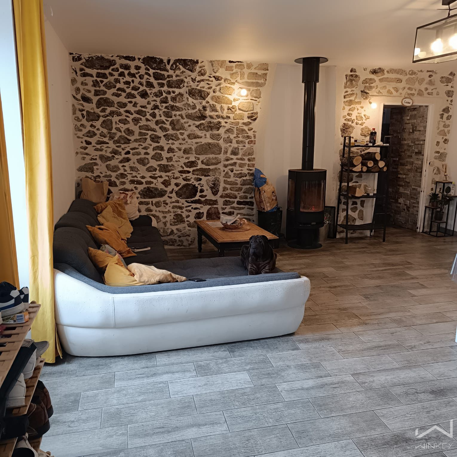 - Grand séjour lumineux avec poêle à bois, pièce de vie chaleureuse et conviviale.