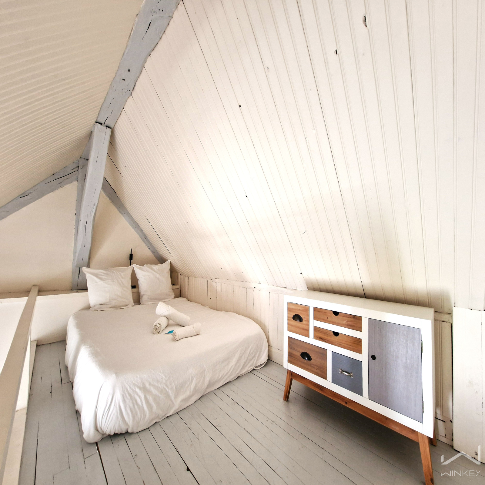 Côté nuit une grande chambre avec son plafond cathédrale et sa sa salle d'eau et WC attenant.