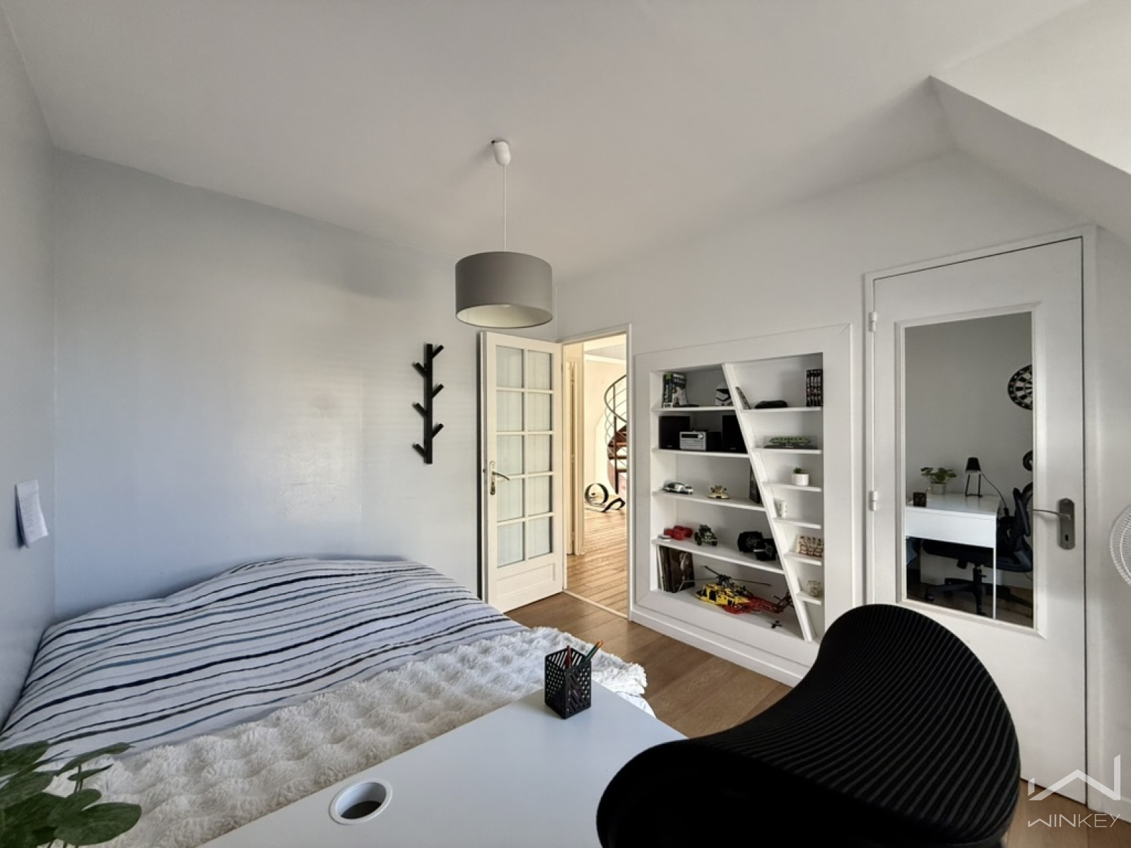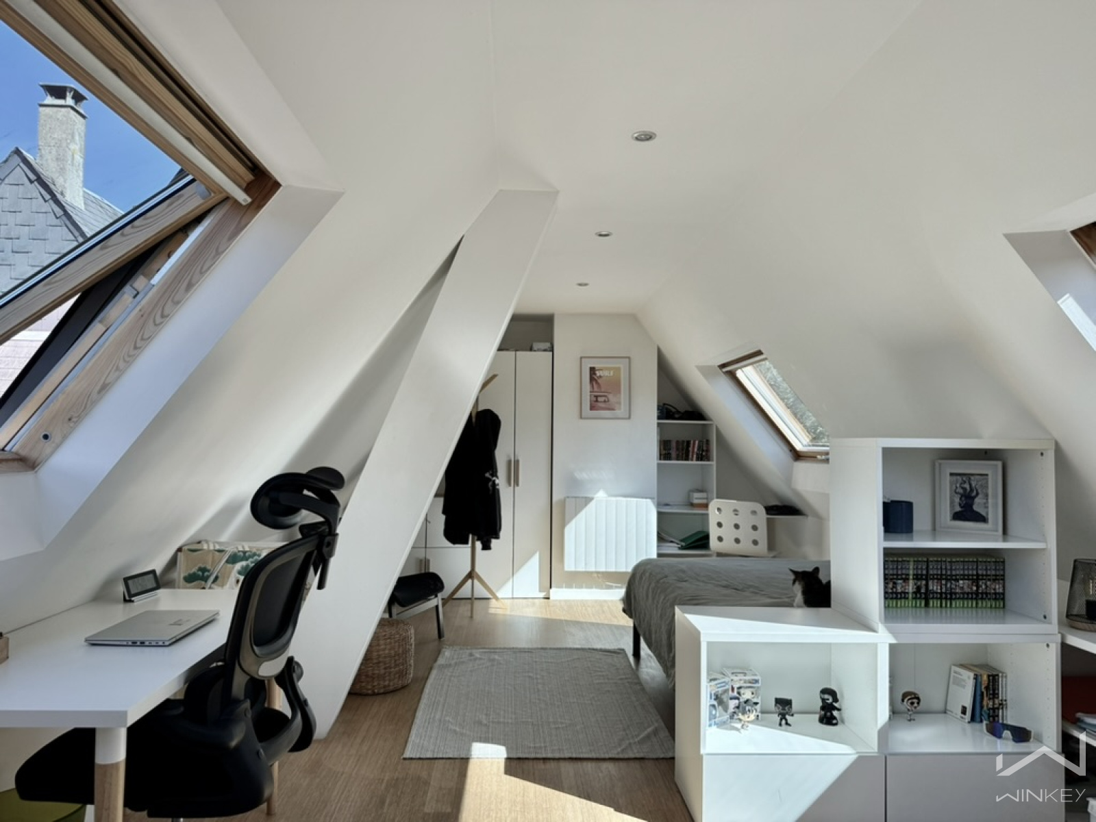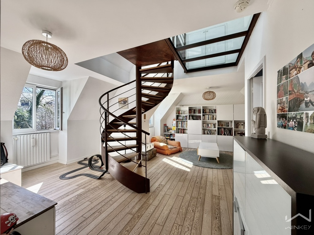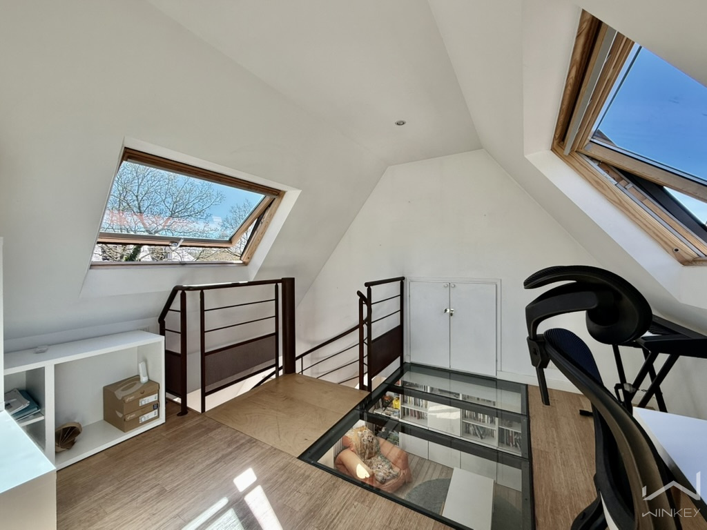 Le dernier niveau accueille une quatrième chambre mansardée d’environ 25 m² au sol, idéale pour recevoir famille et amis ou aménager un espace indépendant.