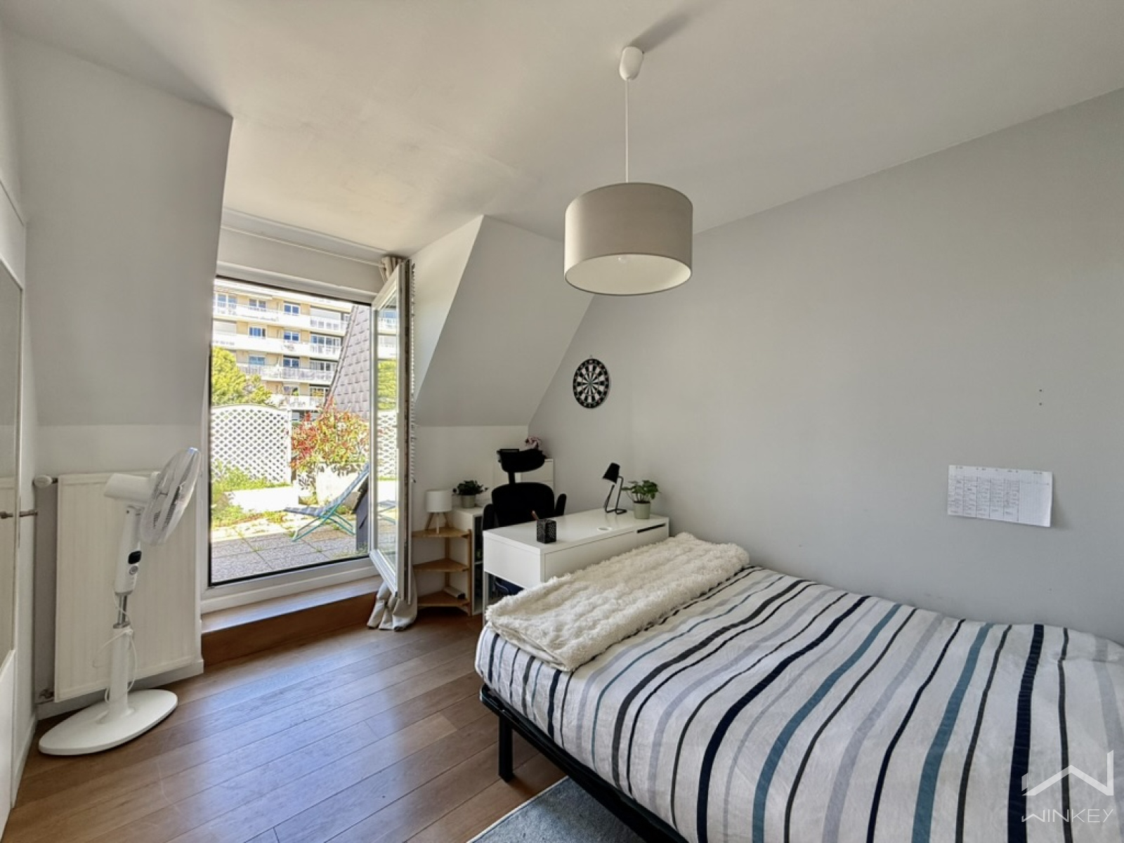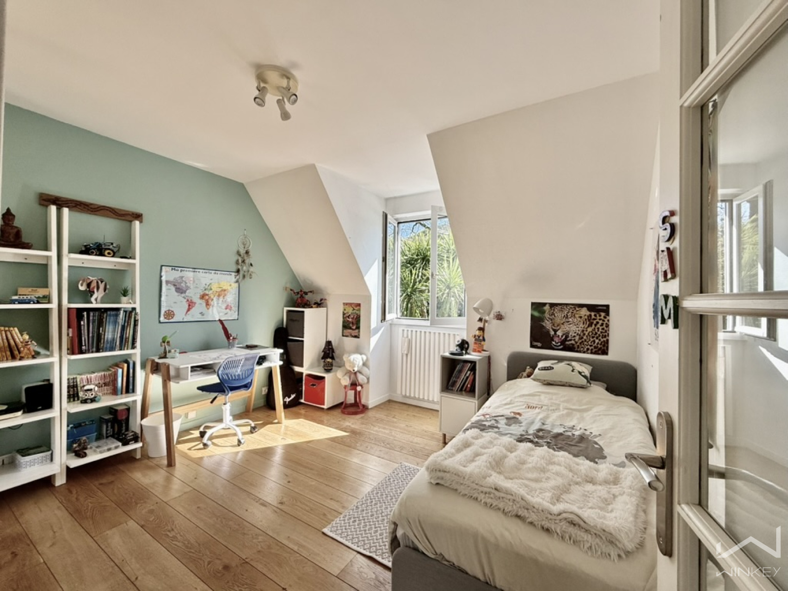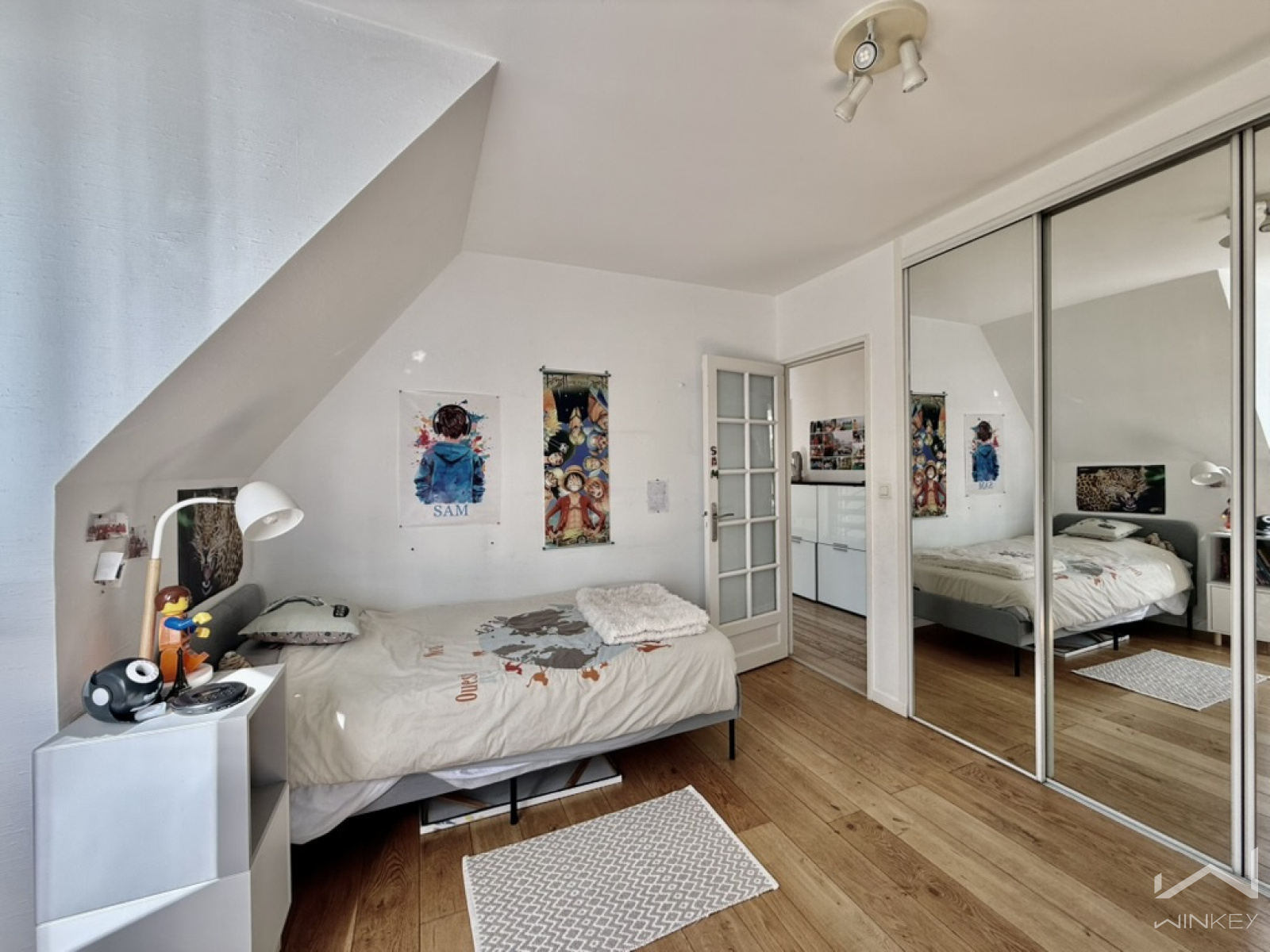 Le dernier niveau accueille une quatrième chambre mansardée d’environ 25 m² au sol, idéale pour recevoir famille et amis ou aménager un espace indépendant.