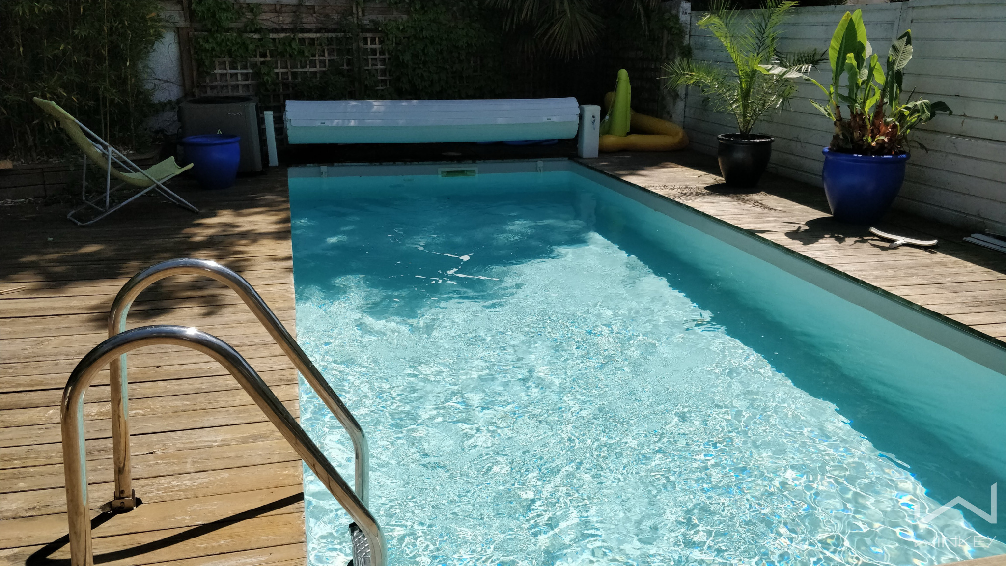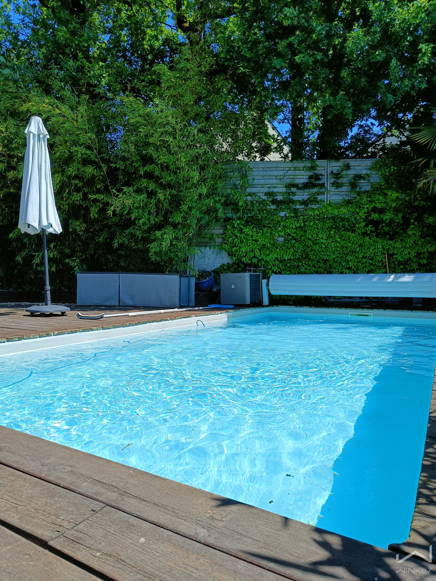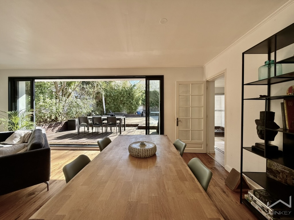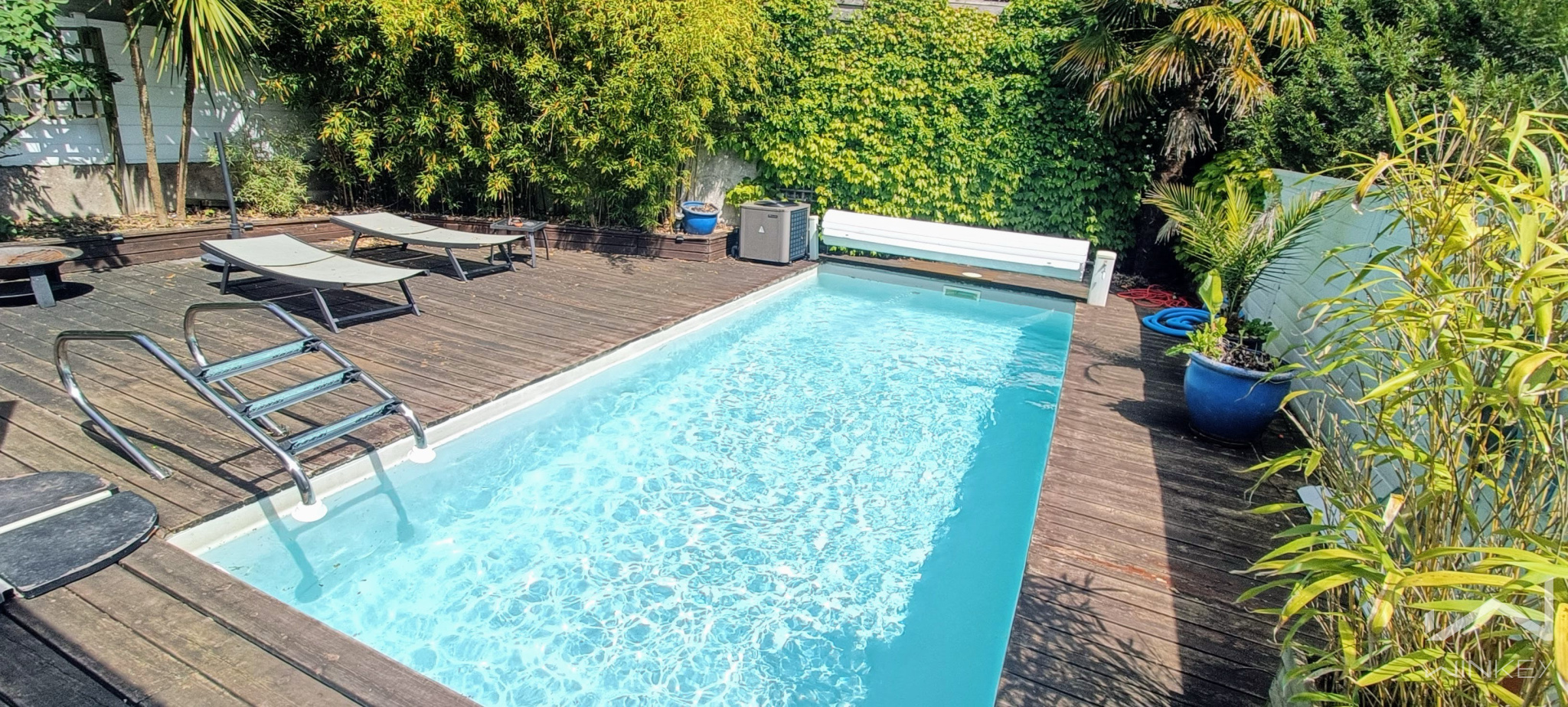À l’extérieur, le charme opère immédiatement : un jardin arboré soigneusement aménagé, une grande terrasse en bois propice aux réceptions, et une piscine élégante (3 x 7 m) composent un véritable espace de vie à ciel ouvert.