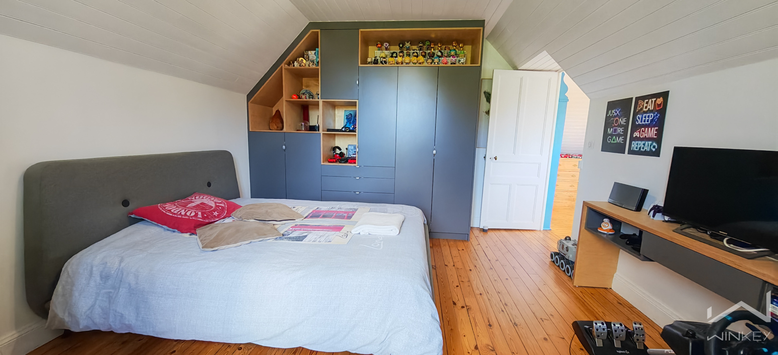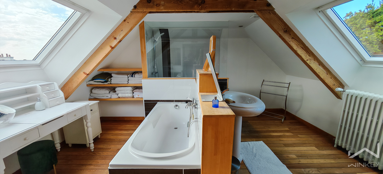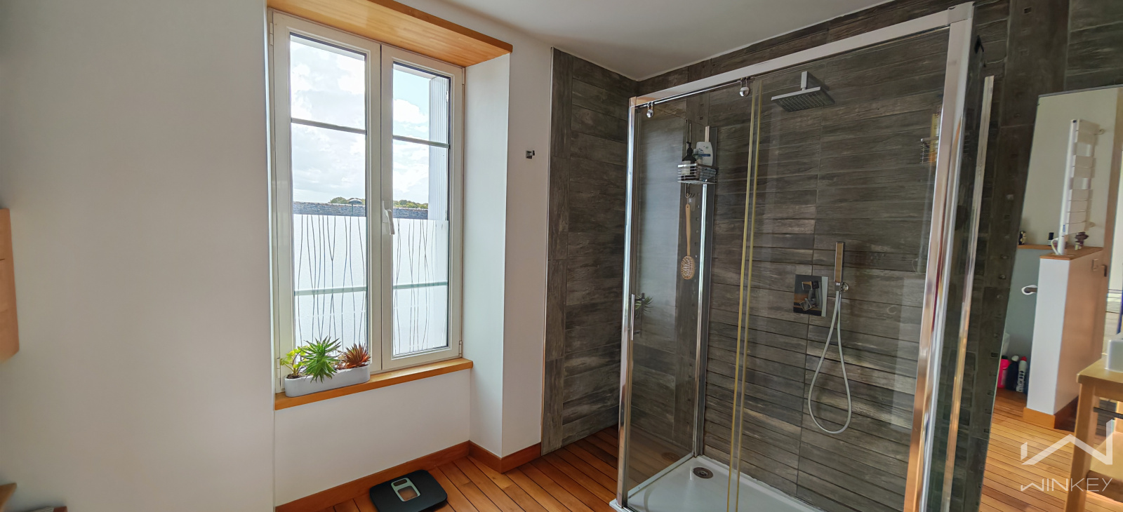 Cette maison propose cinq chambres spacieuses réparties sur les étages, garantissant intimité et confort, avec une grande salle de bain équipée d'une baignoire et d'une douche, d'une salle d'eau supplémentaire et de plusieurs WC.