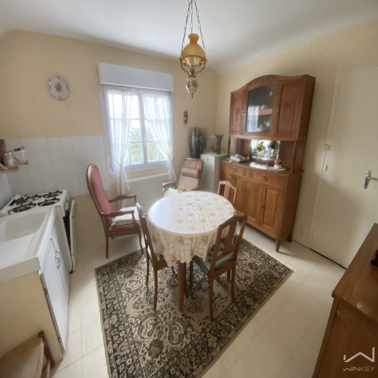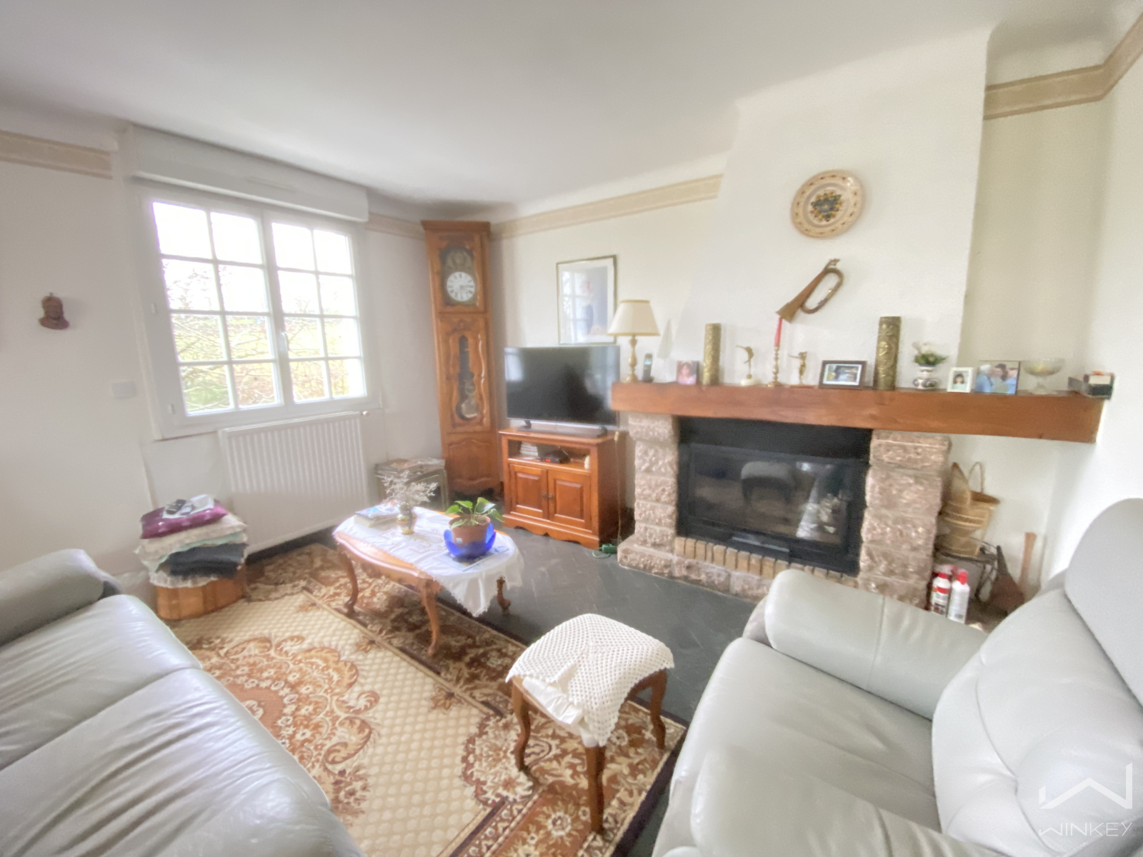 Au premier étage, un palier distribue une cuisine indépendante, un salon/salle à manger lumineux avec insert à bois, une chambre, un bureau, une salle d’eau et un WC séparé.