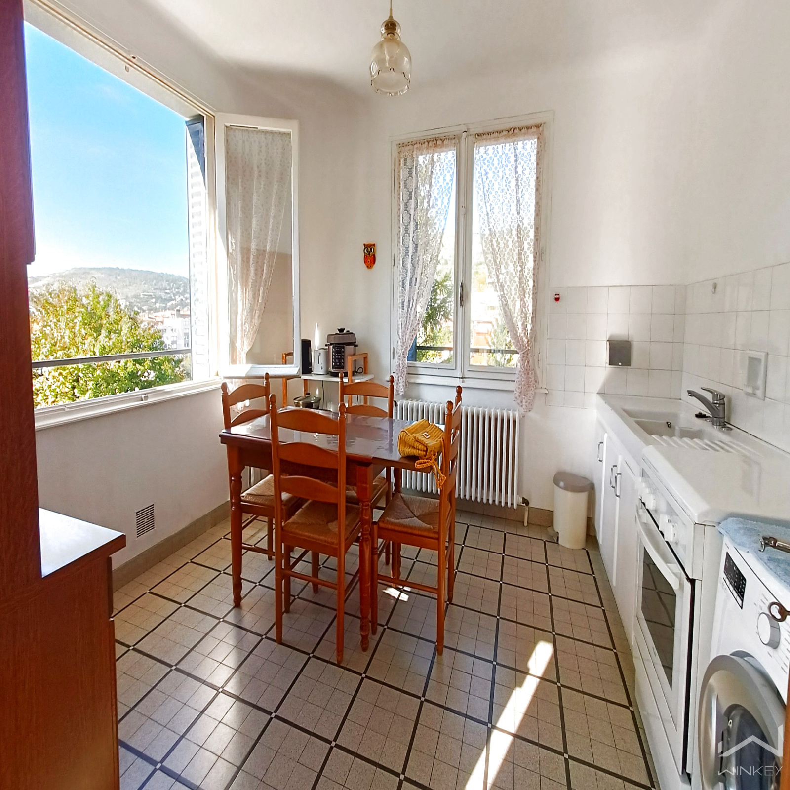 - au 1er étage : une entrée indépendante précédée d'une belle terrasse d'environ 10 m2, une cuisine équipée, un séjour / salle à manger, 2 chambres de 17 et 12m2, une salle de douche, un WC séparé