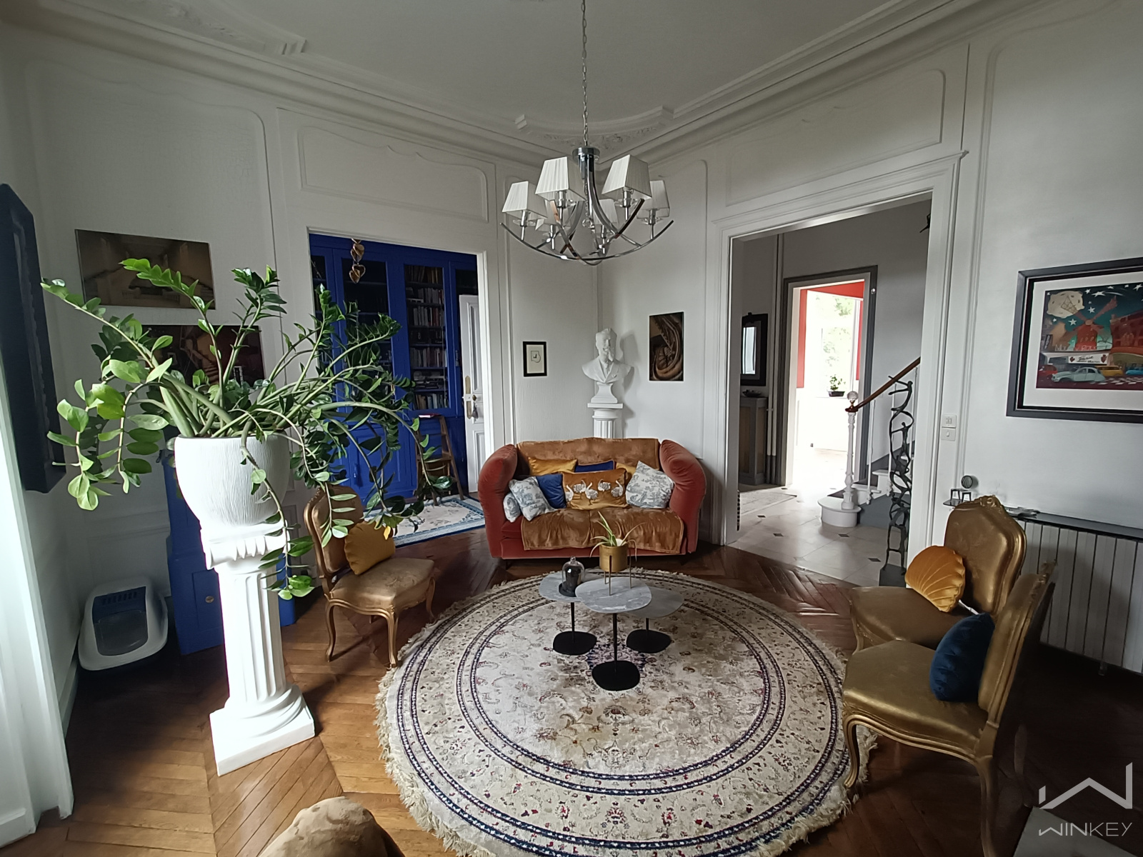 Au Rdc un vaste hall traversant permettant le parking de 2 véhicules, possibilité de rentrer jusqu'à 5 voitures en profitant du jardin et du garage dans l'annexe, un magnifique corridor d'entrée dessert un bureau, un petit salon, une salle à manger ouverte sur une cuisine américaine récemment aménagée et un WC.