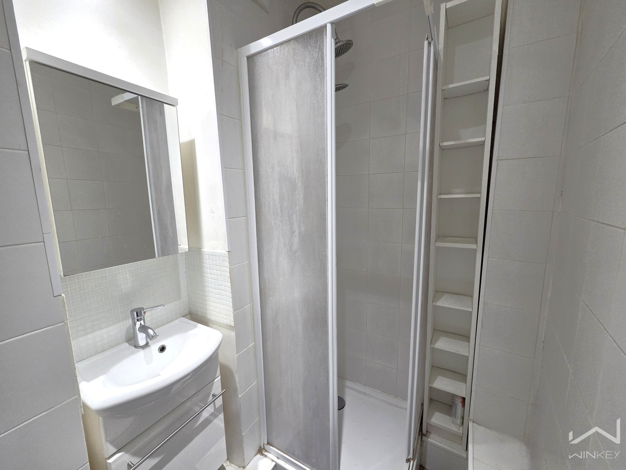 Il se compose d'un séjour/chambre avec placard, d'une cuisine avec frigo, plaque, étagères, d'une salle de douche et de WC.