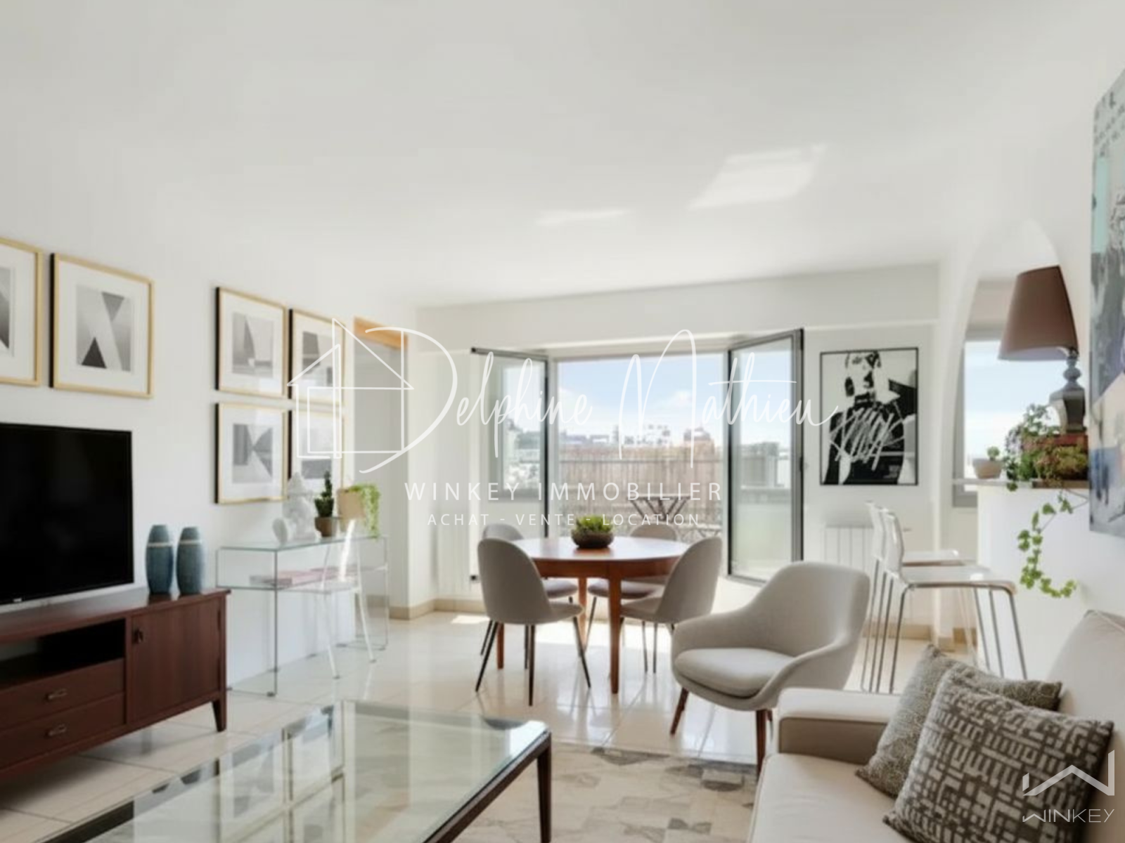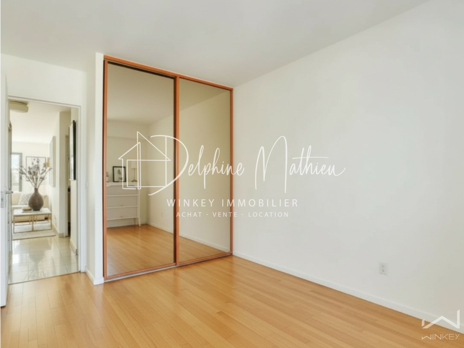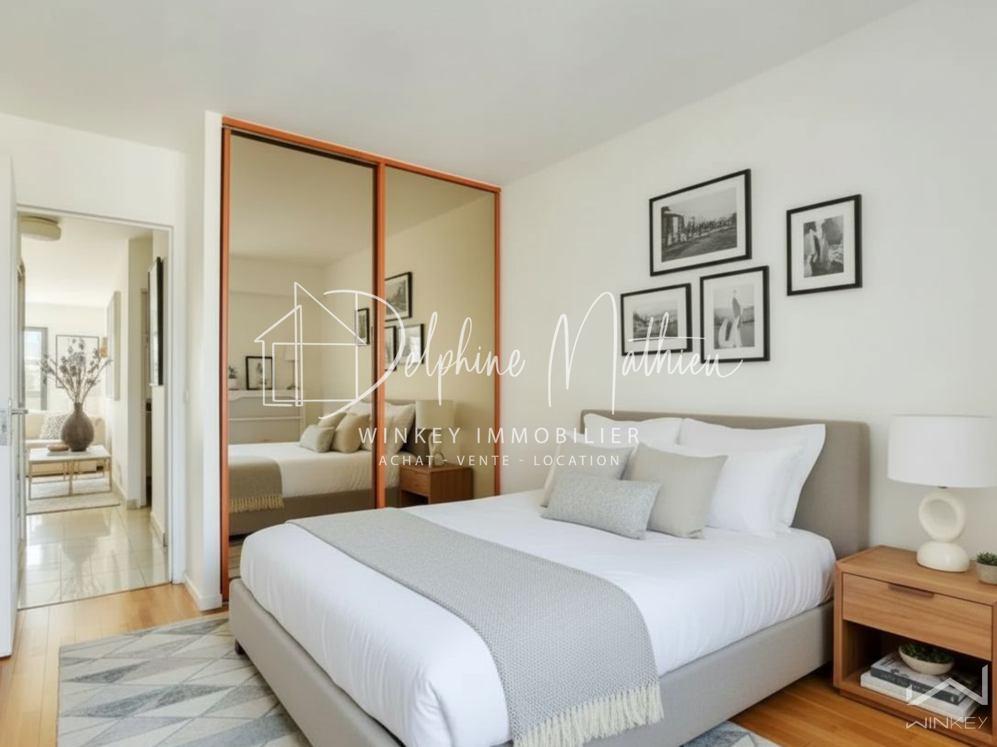 L’appartement s’ouvre sur une entrée desservant un séjour baigné de lumière grâce à son exposition plein sud, avec cuisine ouverte sublimée par une élégante arche. L’espace nuit comprend deux chambres, dont l’une bénéficie d’une vue imprenable sur la Tour Eiffel, un atout rare et particulièrement recherché. Un dressing, une salle de bains et des WC séparés complètent l’agencement.